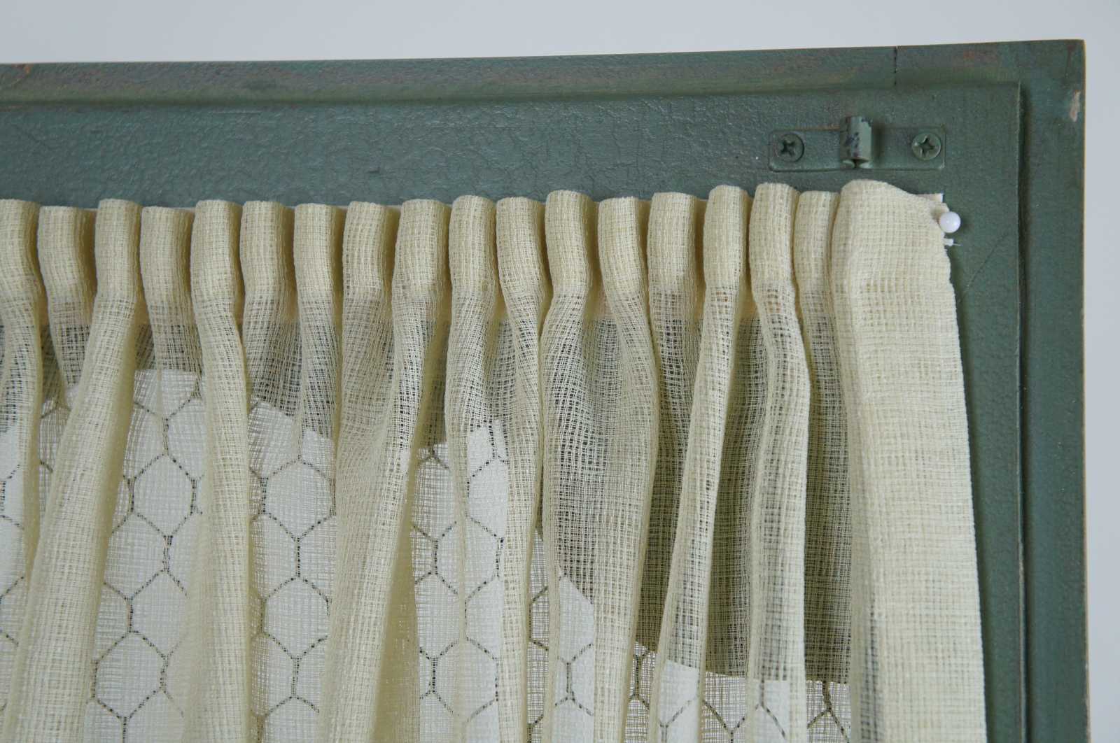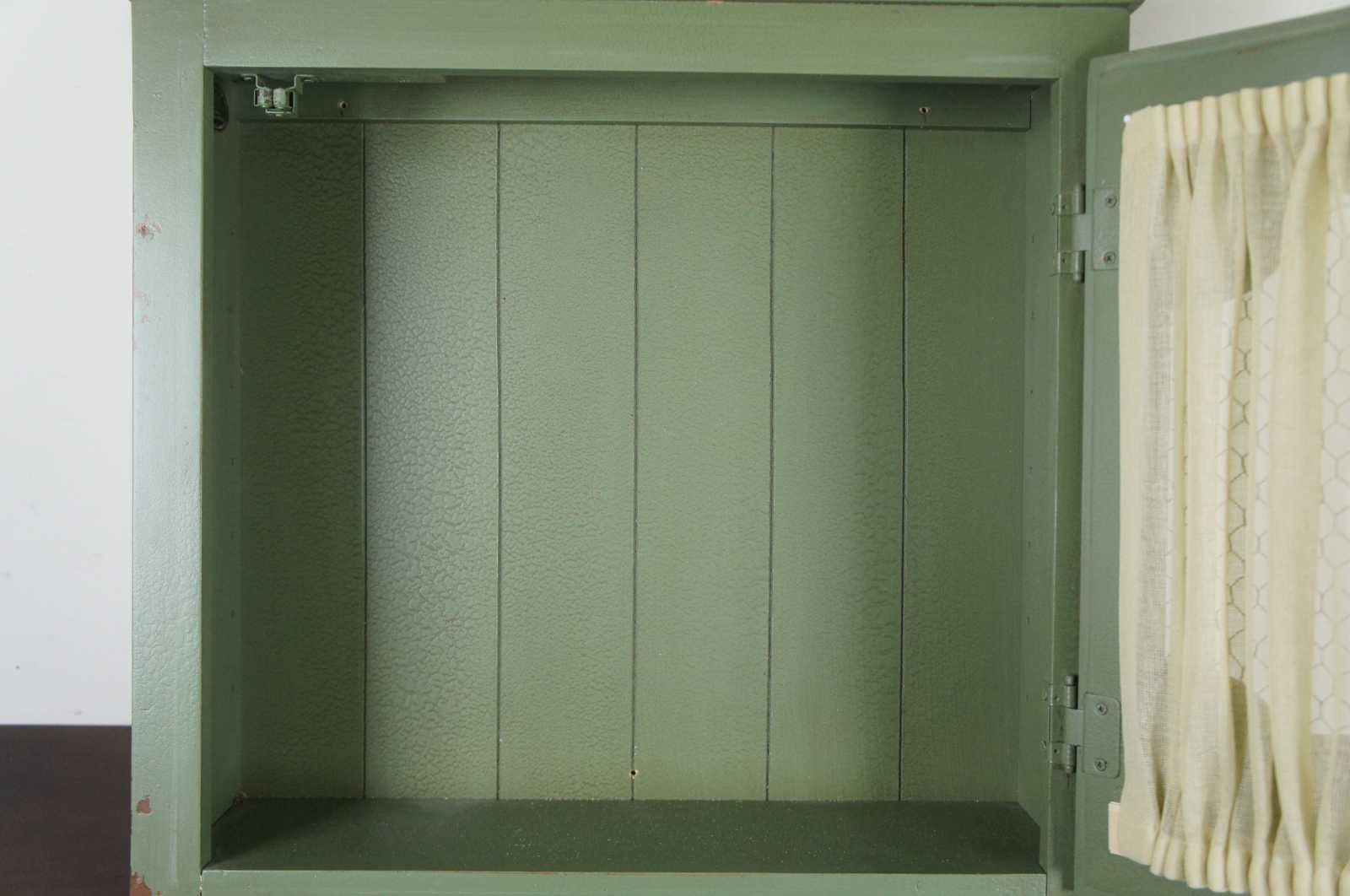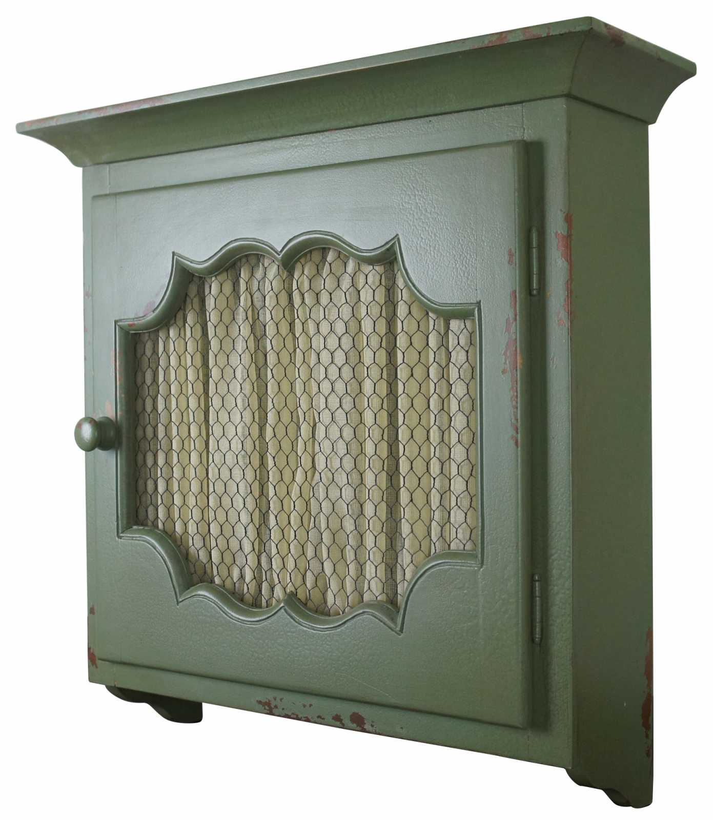 Rustic mint green painted wall cabinet with a curtained chicken wire door by British Traditions Inc, makers of reproduction European country furniture based in the USA.