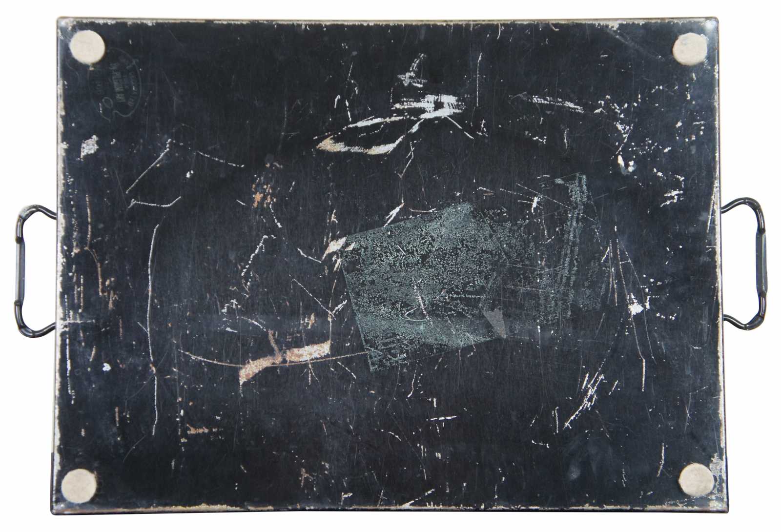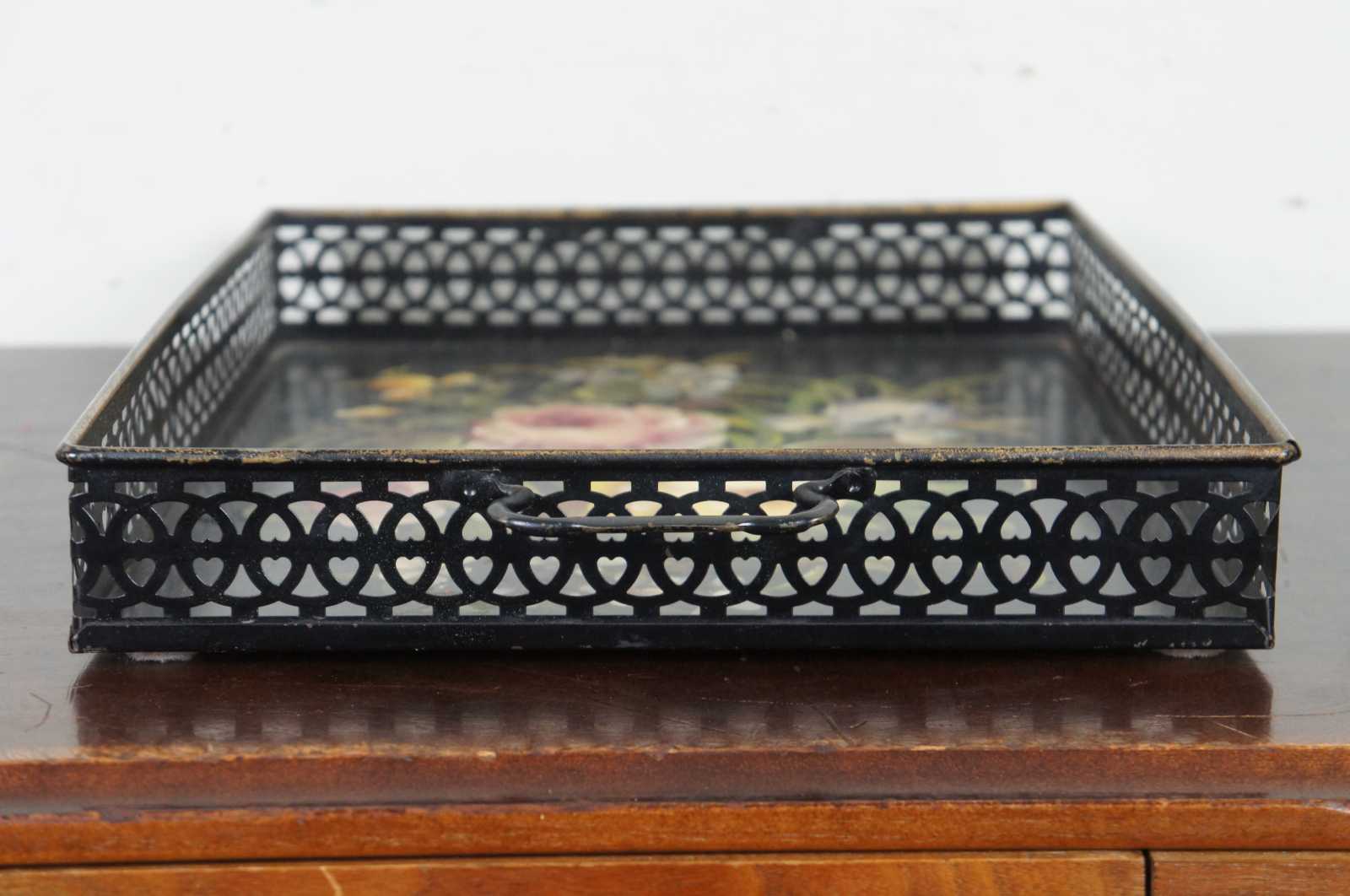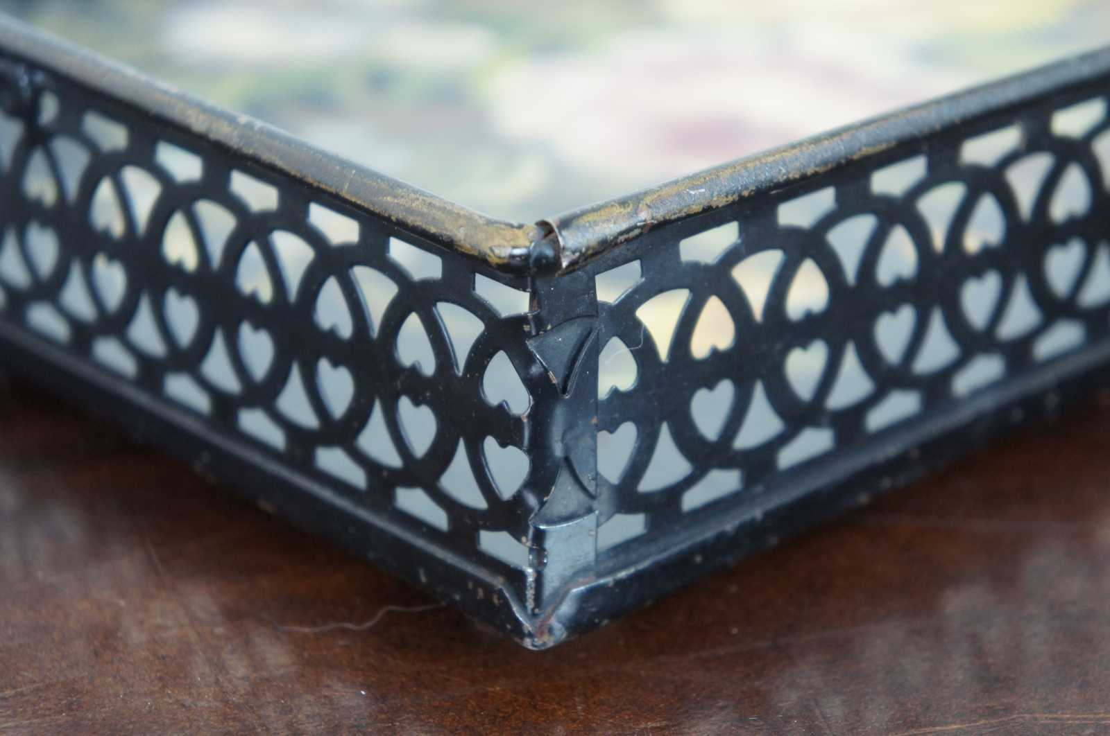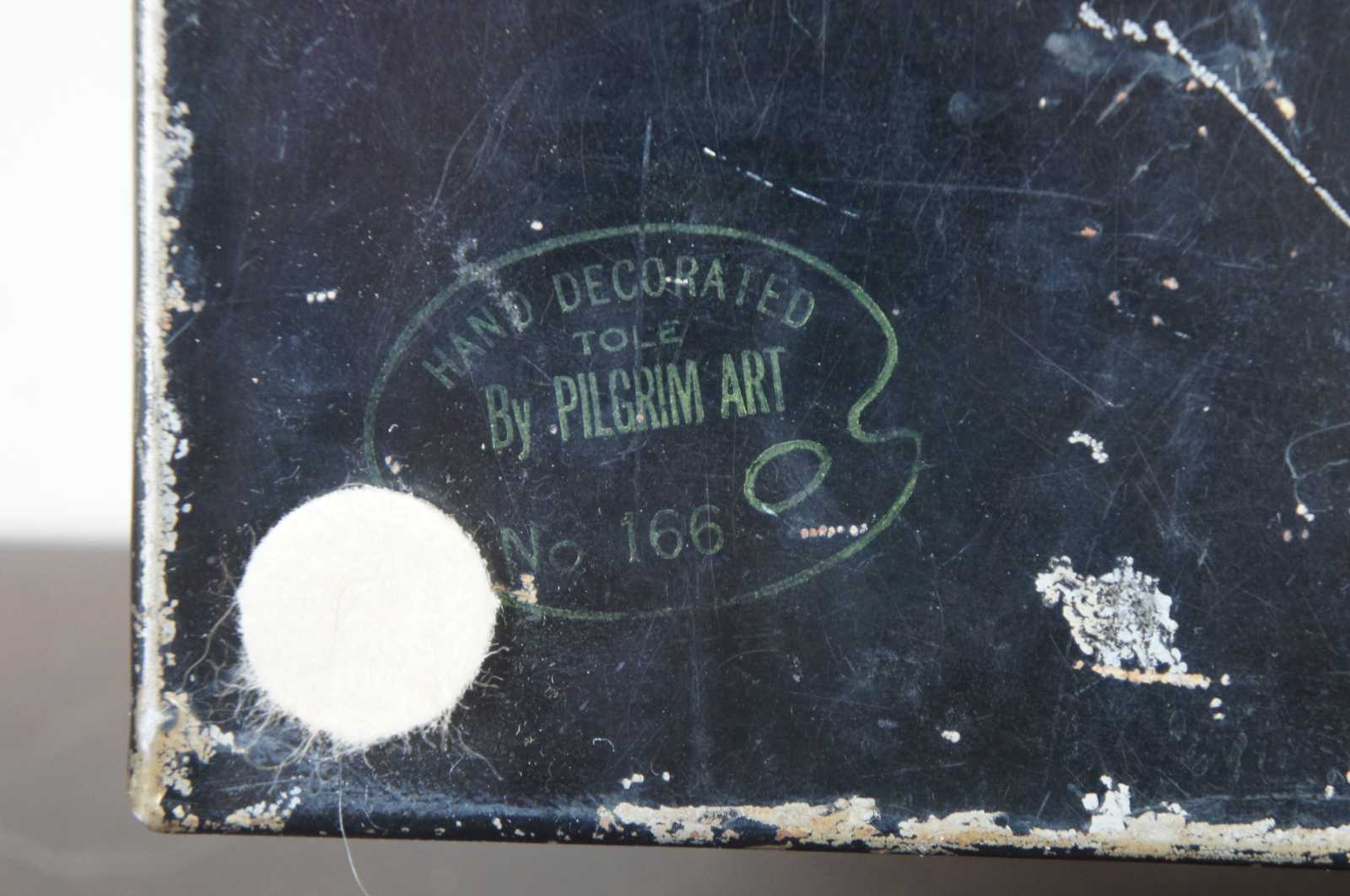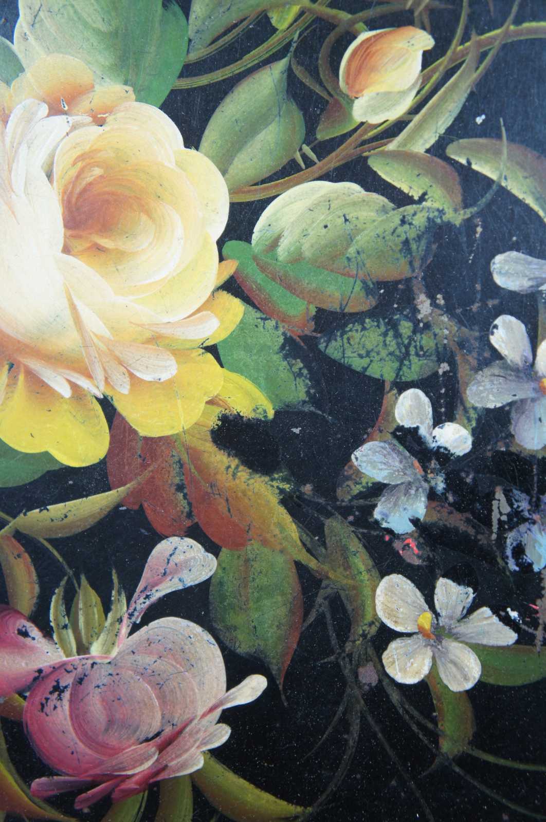 Vintage tole ware hand painted tray with raised sides, black with a gold edge and bouquet of flowers, by Pilgrim Art.