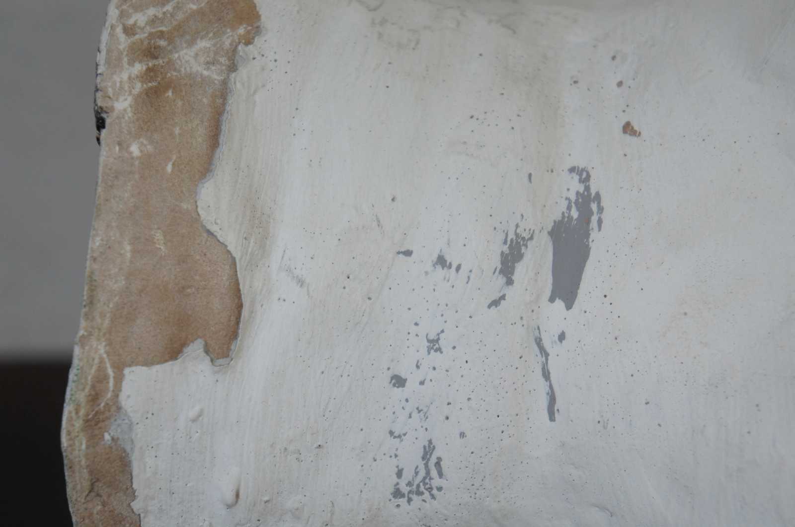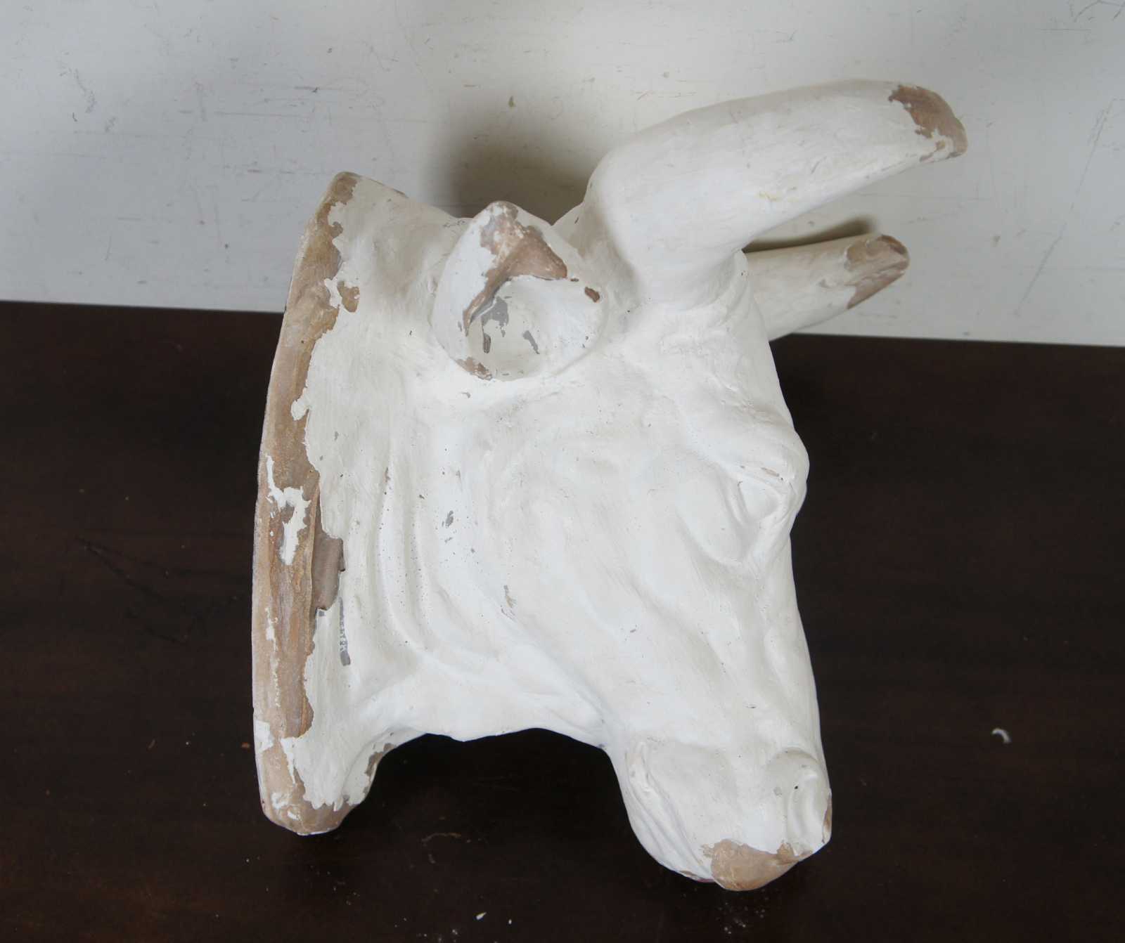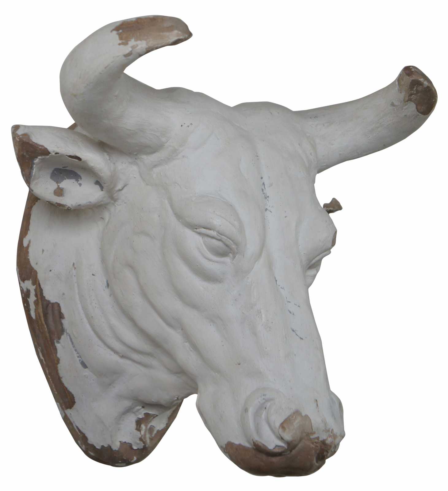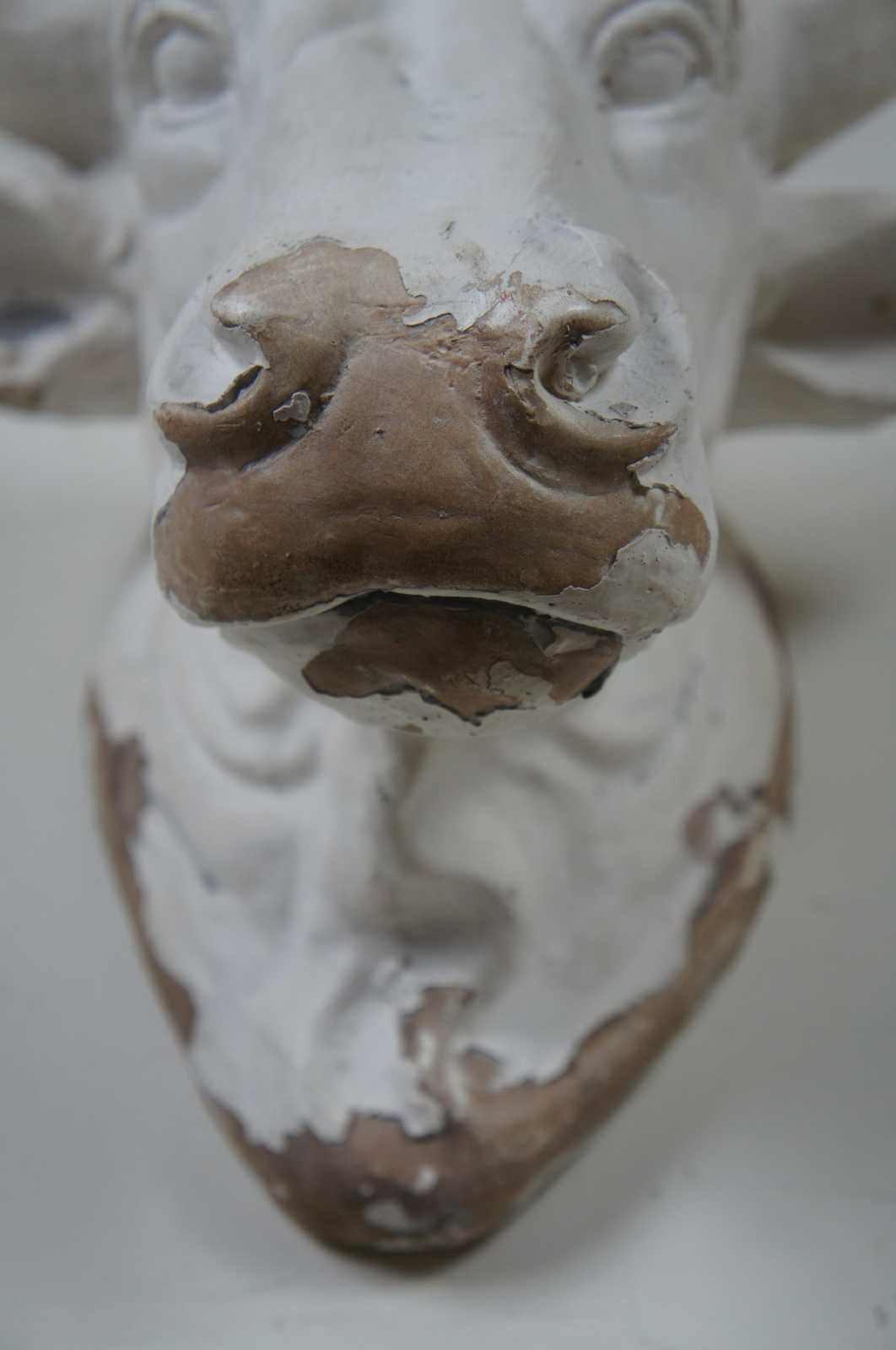 Realistic composite ceramic bull head wall hanging, finished with a rustic, artistically distressed white glaze.