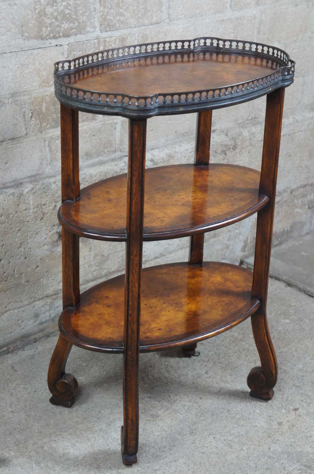 Circa 2000s Theodore Alexander turtle top tiered side table. Features long oak supports leading to scrolled feet and oval surfaces with mahogany and burled veneer. Top surface lined with gallery. A touch of English and old world styling 5005-182.