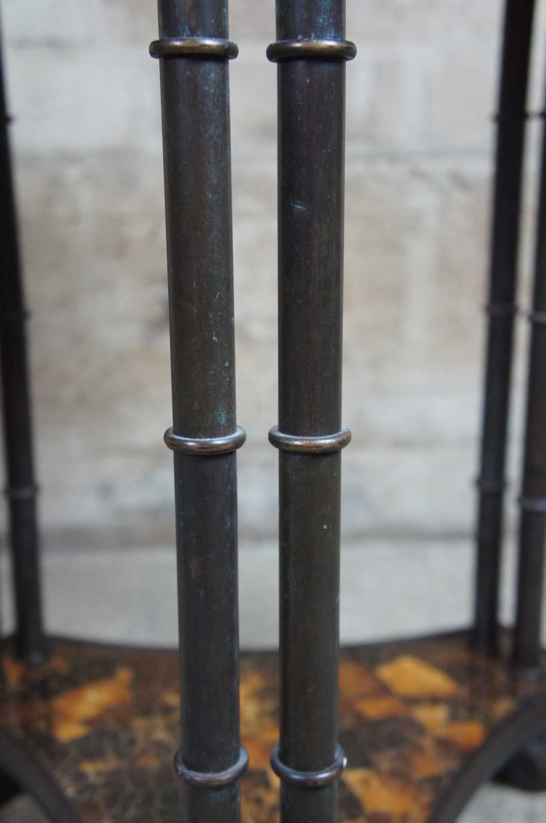 Circular gueridon side table with stone veneer tops. Table stands on three two-column supports leading to a tripod base with paw or claw feet. In the manor of Adam Weisweiler, a French cabinet maker who established the form of double colonettes on circular side tables in the 19th century.