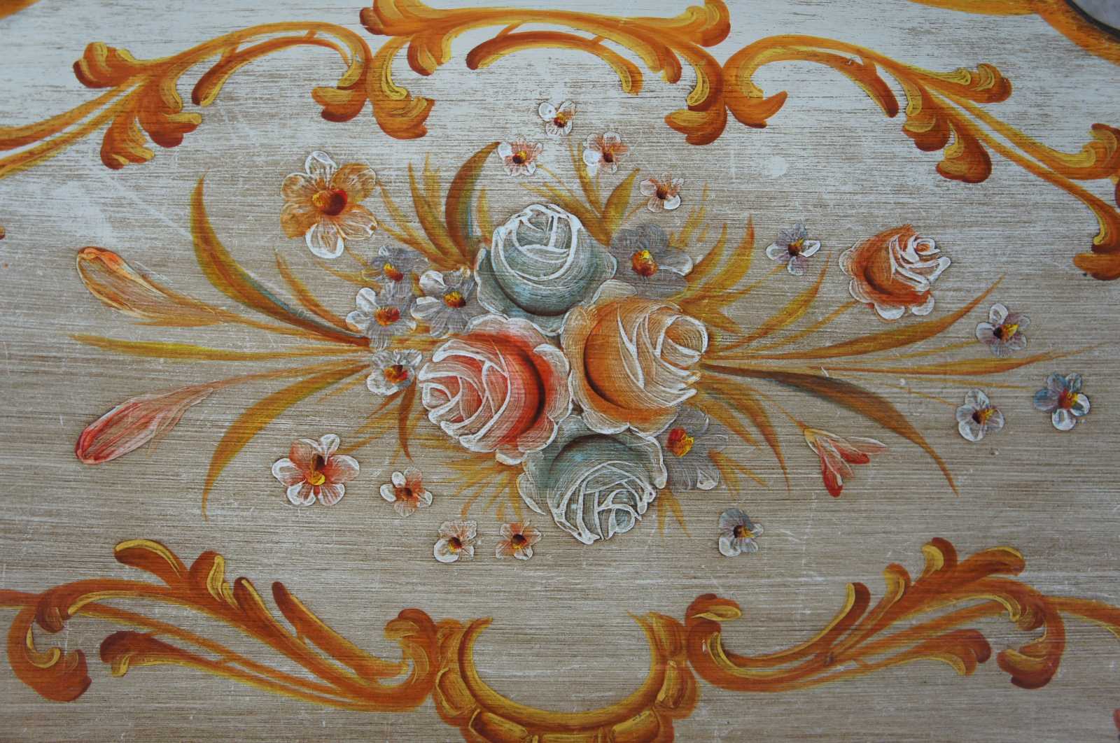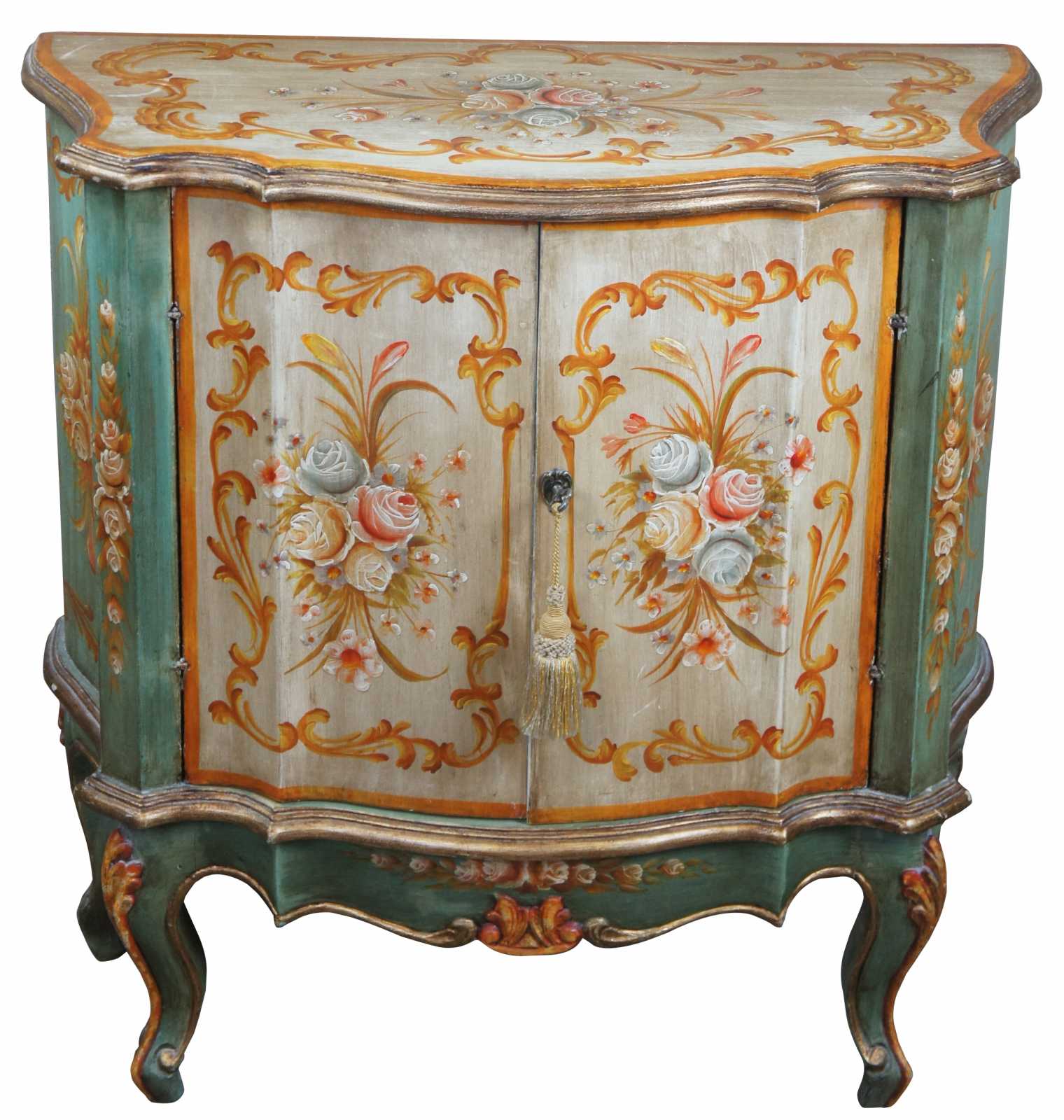 Late 20th century florentine entry cabinet or console table. Serpentine with hand panited designs and scalloped accents. Includes lock and key.