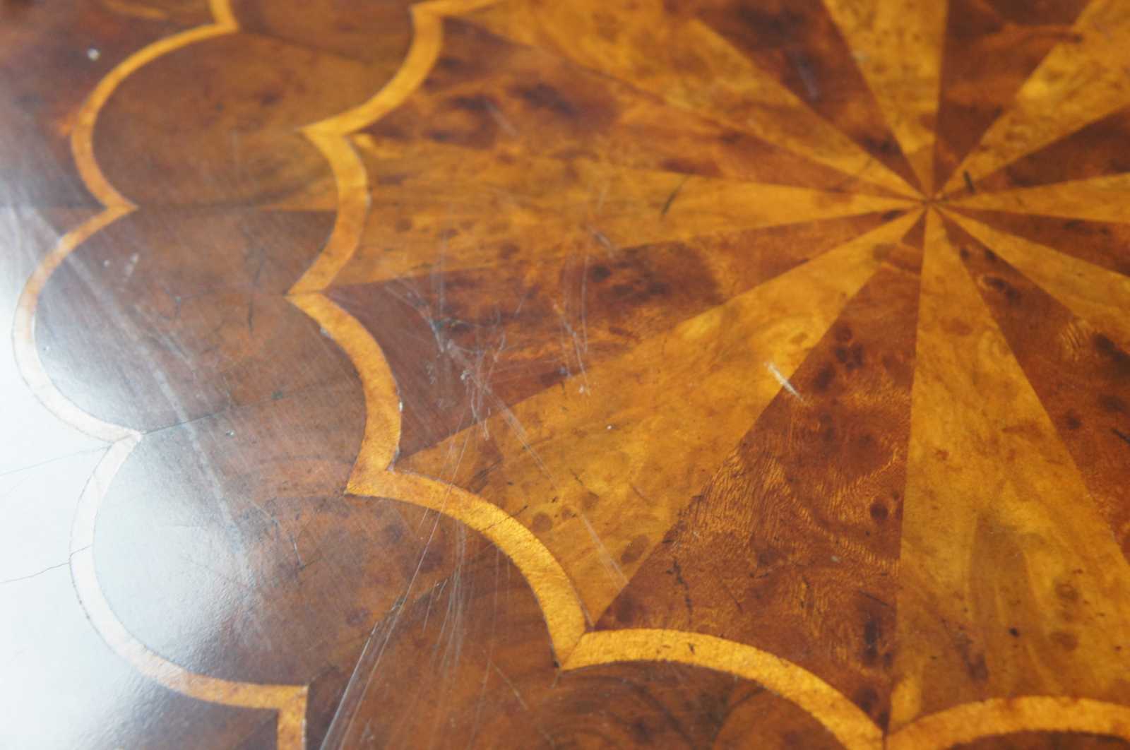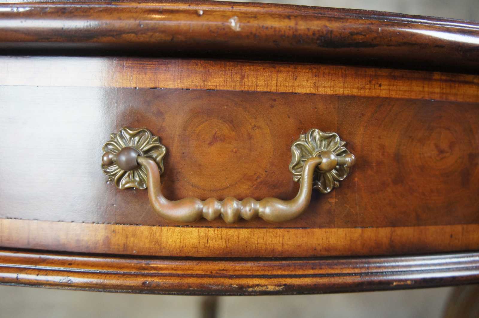 Theodore Alexander entryway center table with ornate bronzed iron base. The vibrant top is amplified by a sunburst pattern, and the use of mahogany and walnut. The drum shaped apron includes three drawers and is accented by walnut burl. The lower shelf matches the upper tier. Table is very heavy.