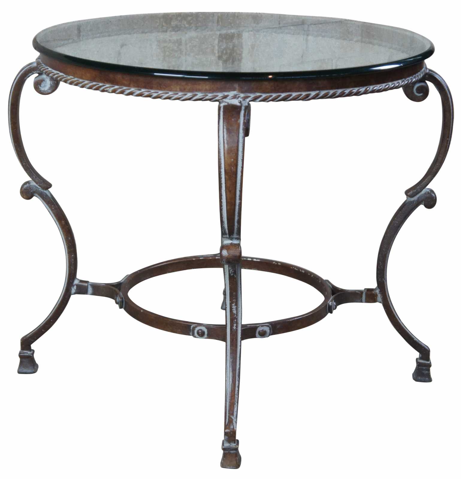 Iron and glass table with round polished top and rustic detail and braided apron.