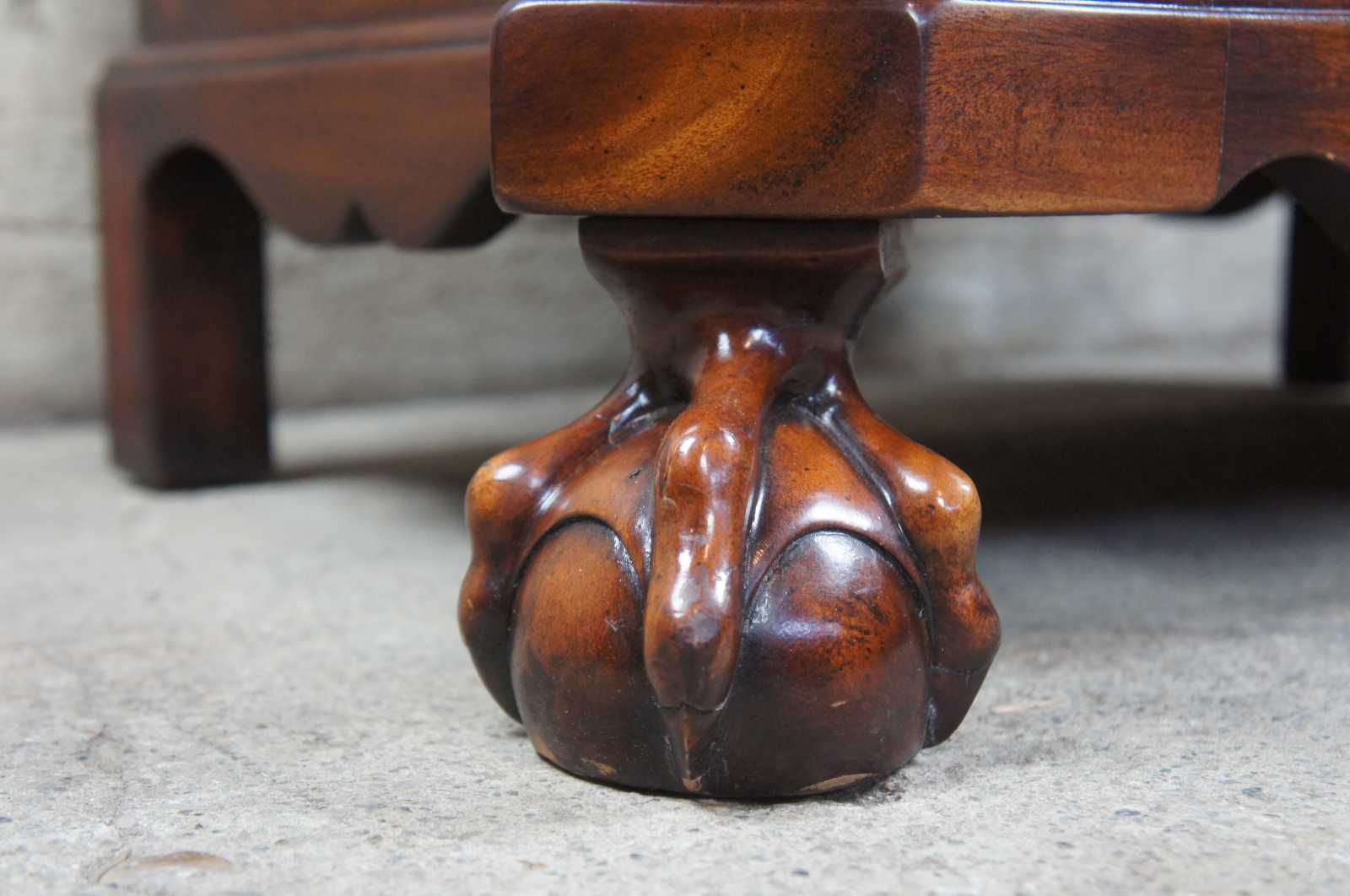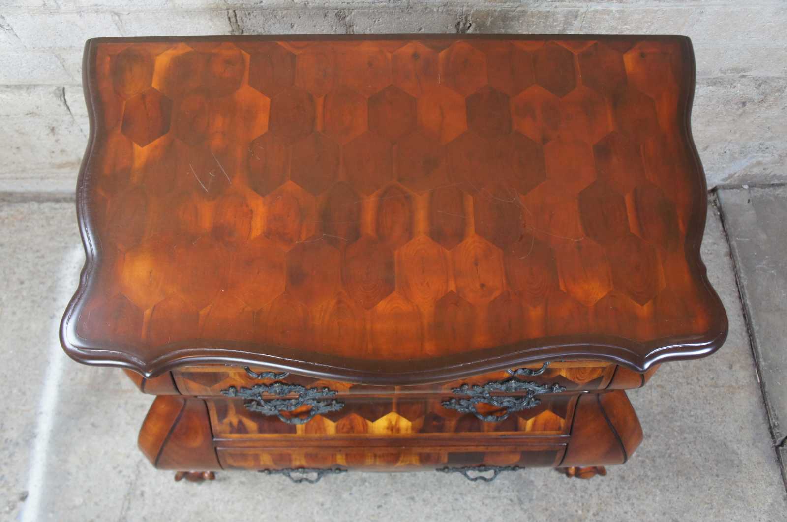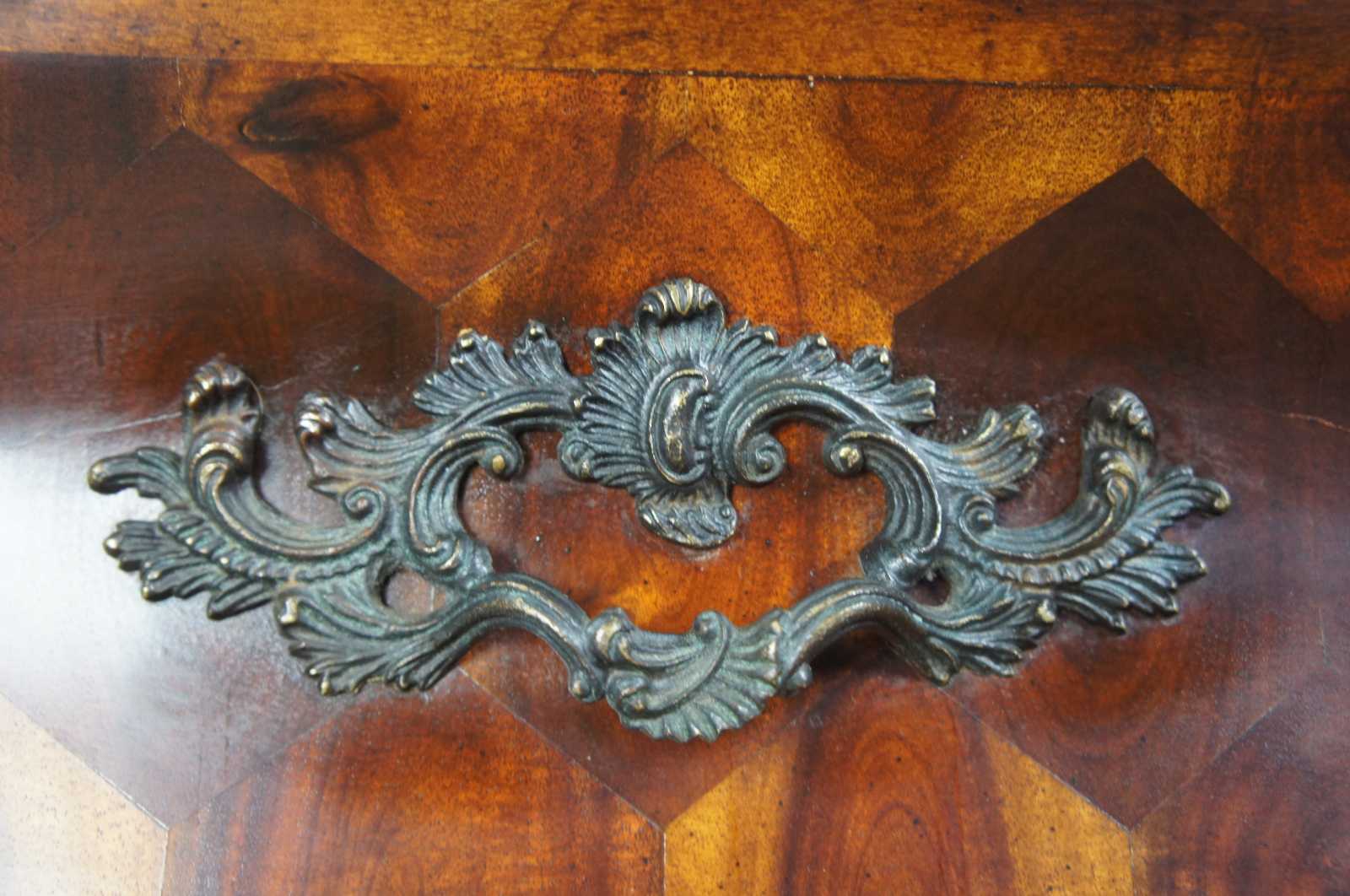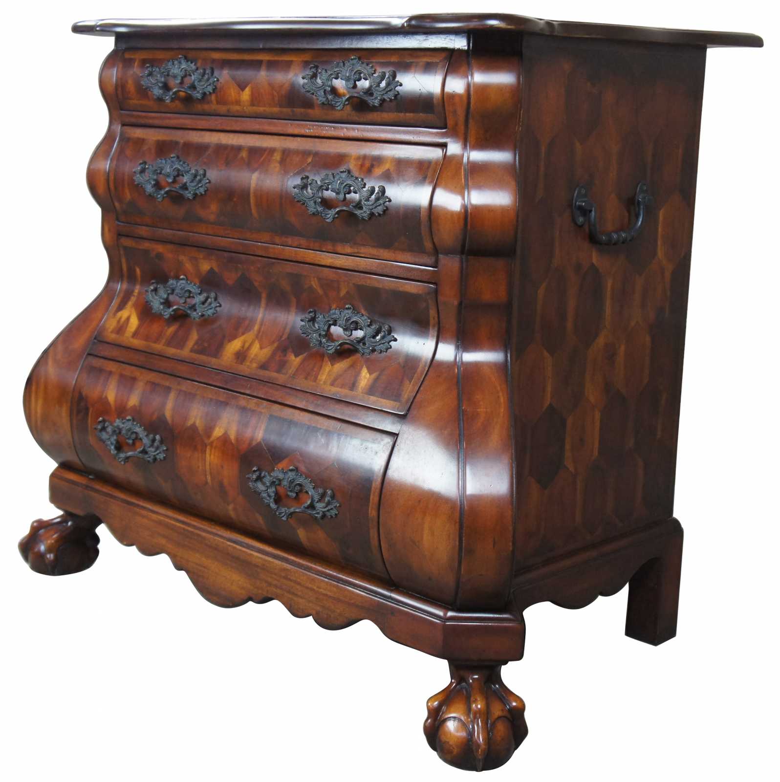 Theodore Alexander Dutch Bombe chest. Influenced by a combination of 18th century Dutch and Chippendale styling. Features a serpentine design made from mahognay with four drawers, ornate hardware, ball and claw feet and geometric parquetry finish. A great piece for any entry.