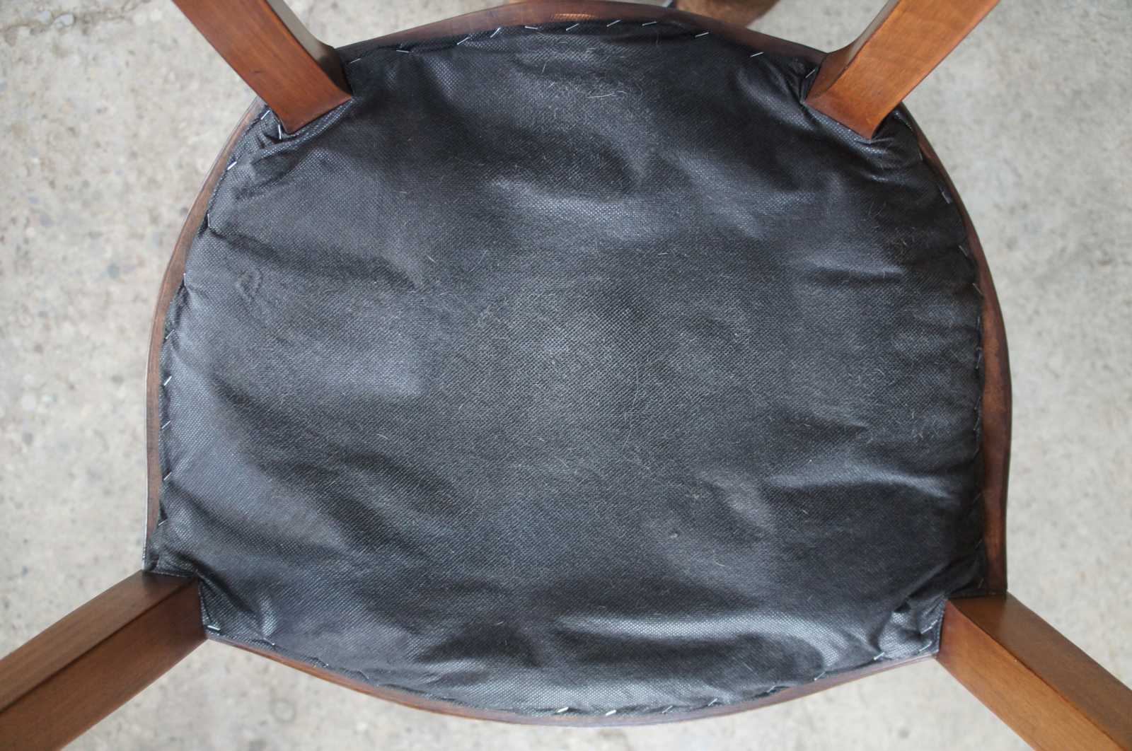 Four late 20th century wheel back dining chairs. Features a balloon shaped back with spidered splat leading to a green seat over a serpentine apron and square tapered legs leading to spade feet.