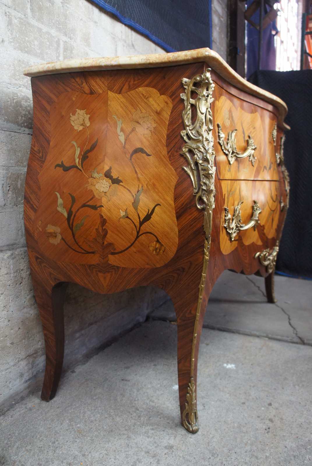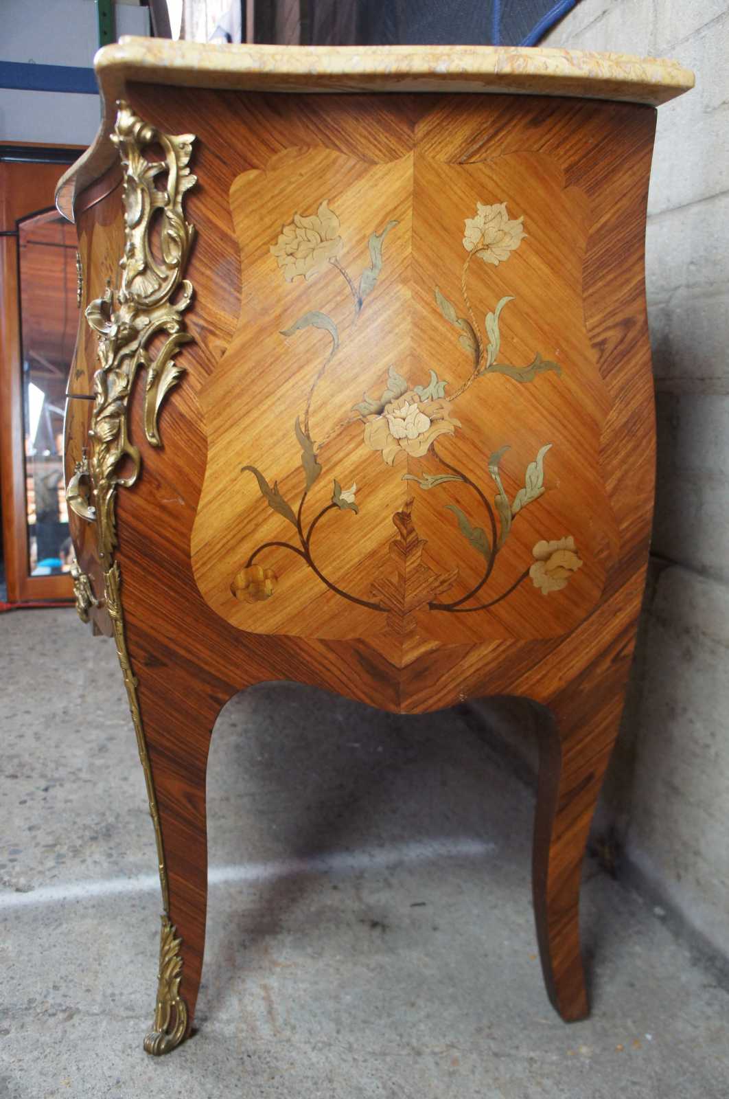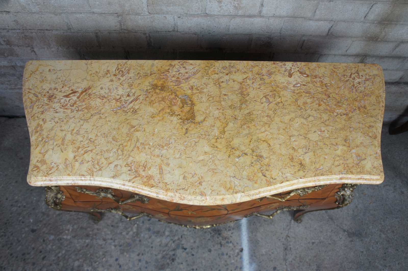 Two antique 19th century French serpentine Louis XV style commodes. Made from Tulip and Rosewood with marquetry inlay, gilt bronze mounts and marble tops. Each commode features hand dovetailed drawers and a beautiful floral rose motif.