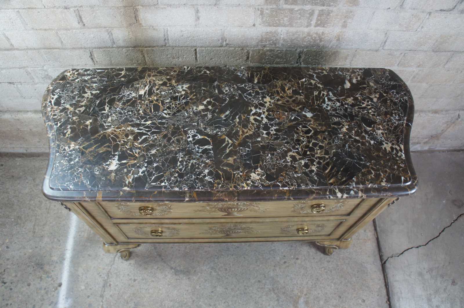 Circa 1990s Maitland Smith hand painted stone top chest. Features Louis XV styling with hand painted floral detail and brass hardware.