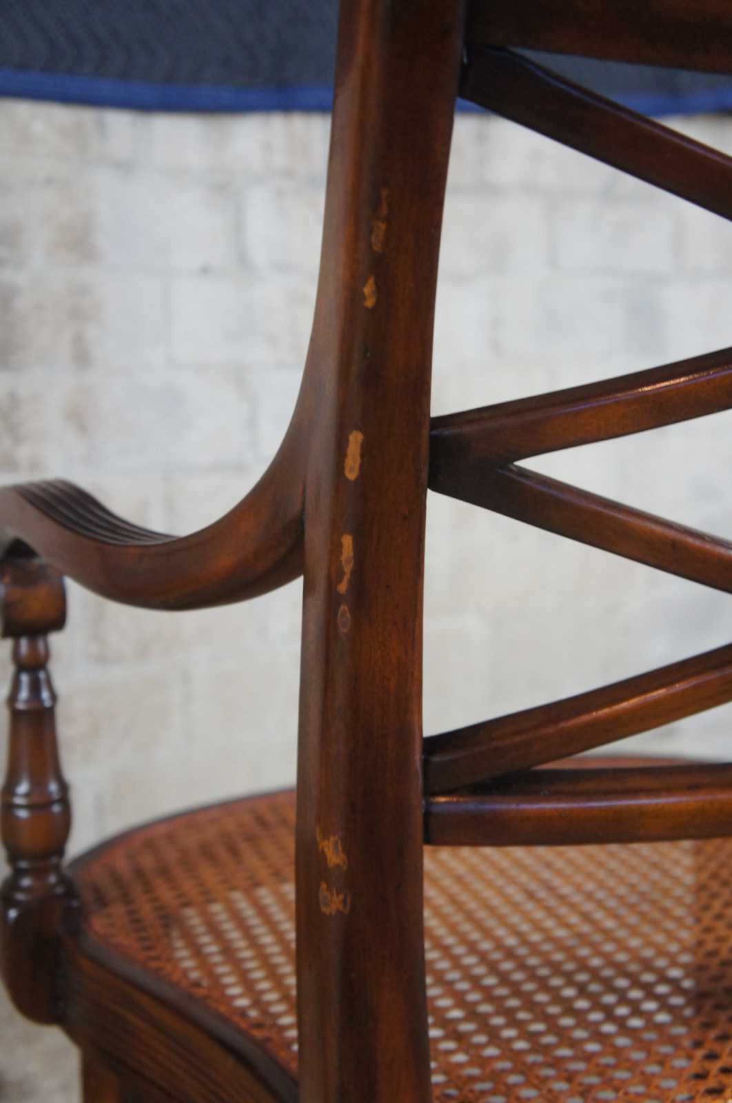 Theodore Alexander counter height bar stools # 4100. Features a hand carved armchair with reeded decoration, over scroll and double 'X' pierced back above a cane seat with upholstered downfilled cushion. The chairs are made from mahogany and feature sabre legs.