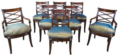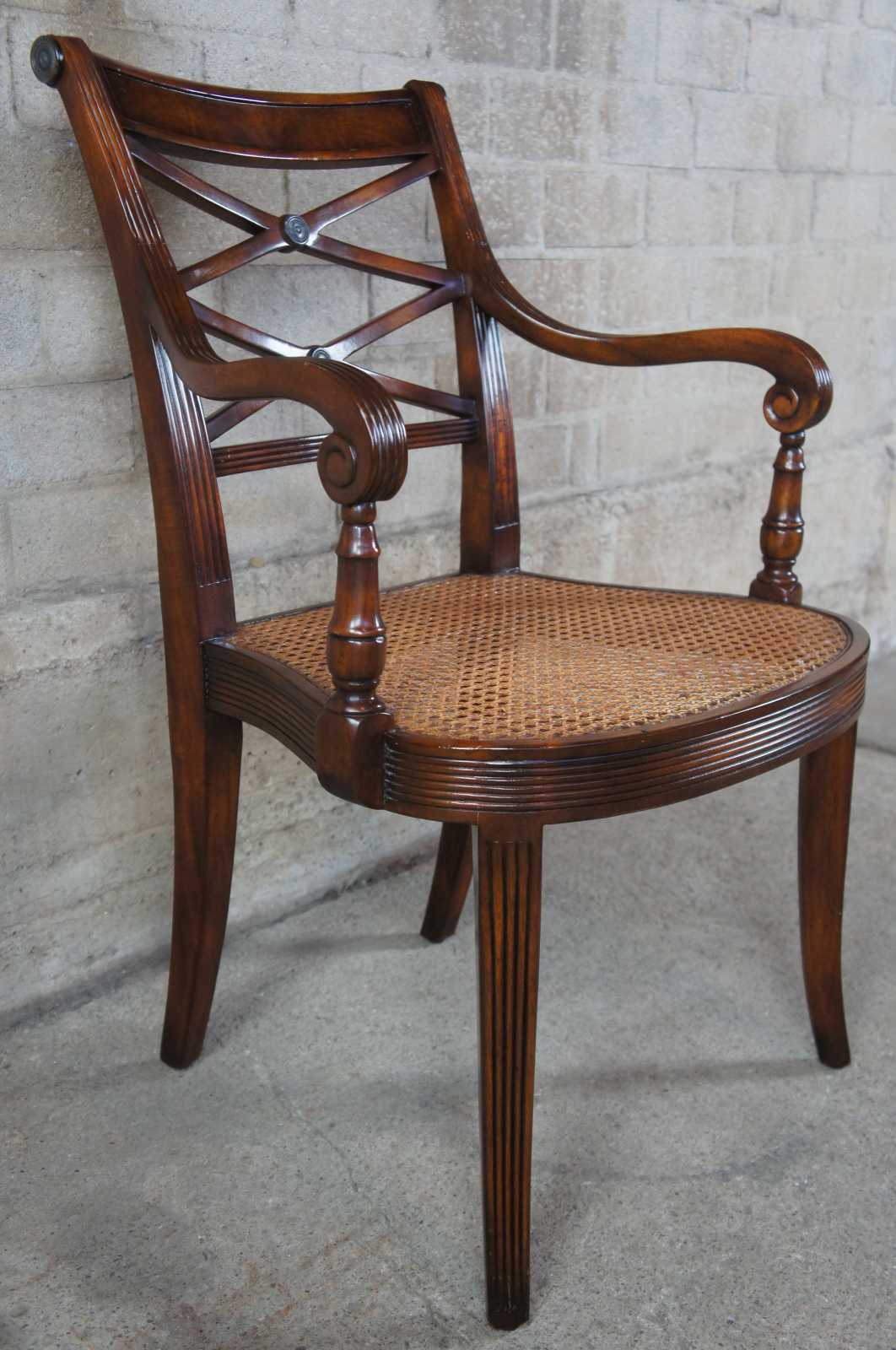 Theodore Alexander 4100-902. A hand carved armchair with reeded decoration, the over scroll and double 'X' pierced back above a cane seat with upholstered downfilled cushion. The chairs are made from mahogany and feature sabre legs.