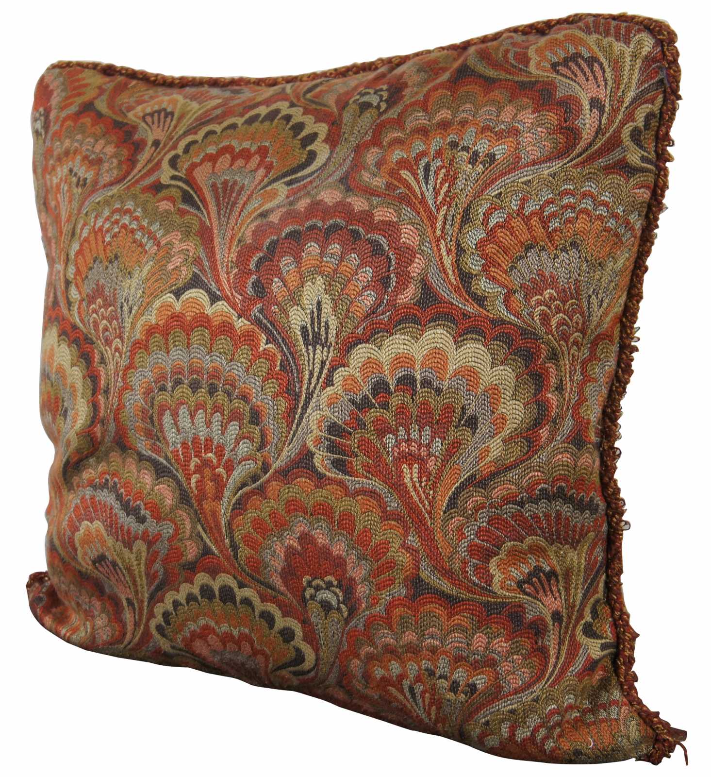 Century Furniture down filled throw pillow with fan patterned cover in reds, oranges and greens.