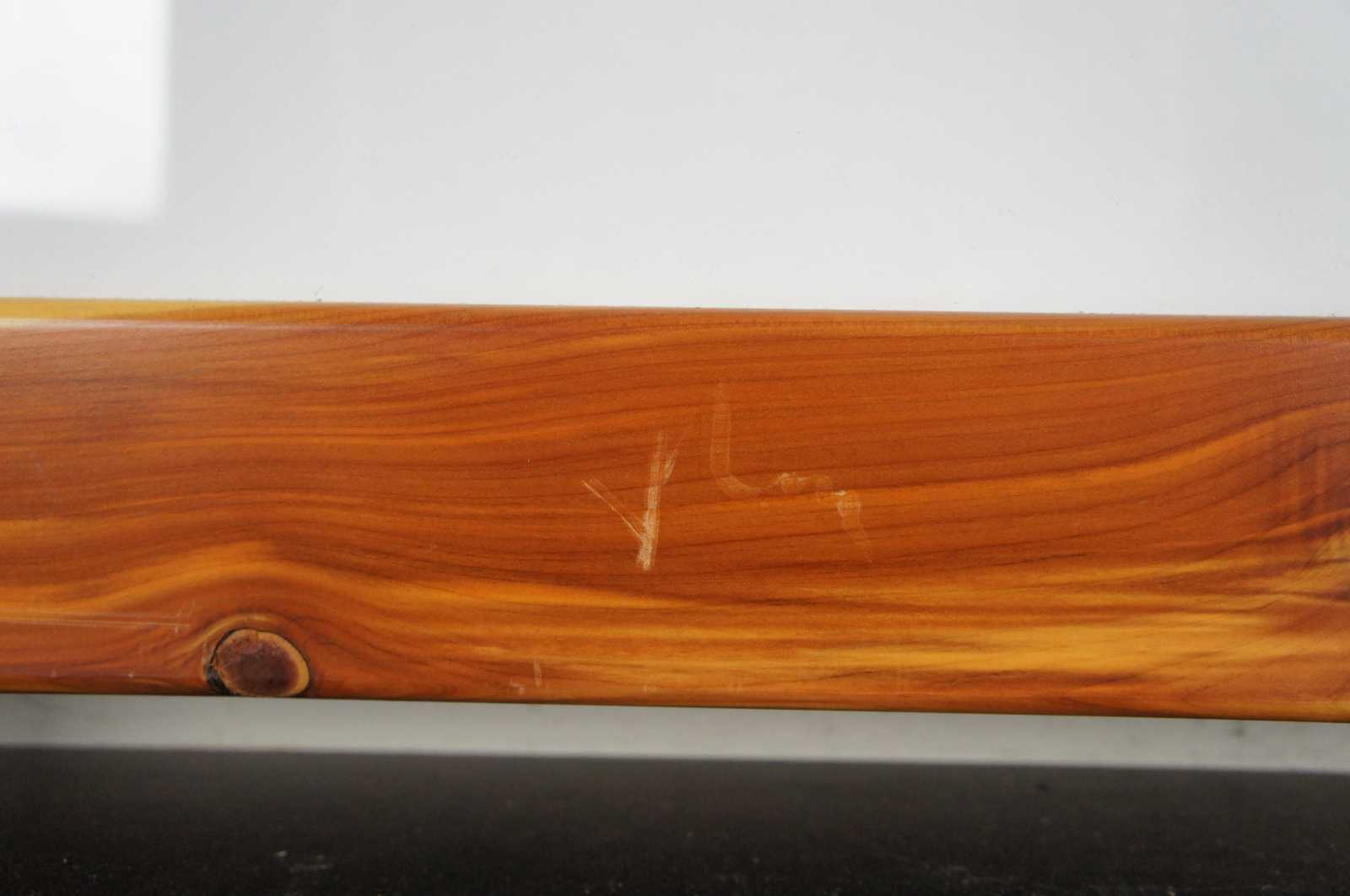 Vintage signed color photo print of a mountain waterfall and rocky river bed, displayed in a rustic pine frame.