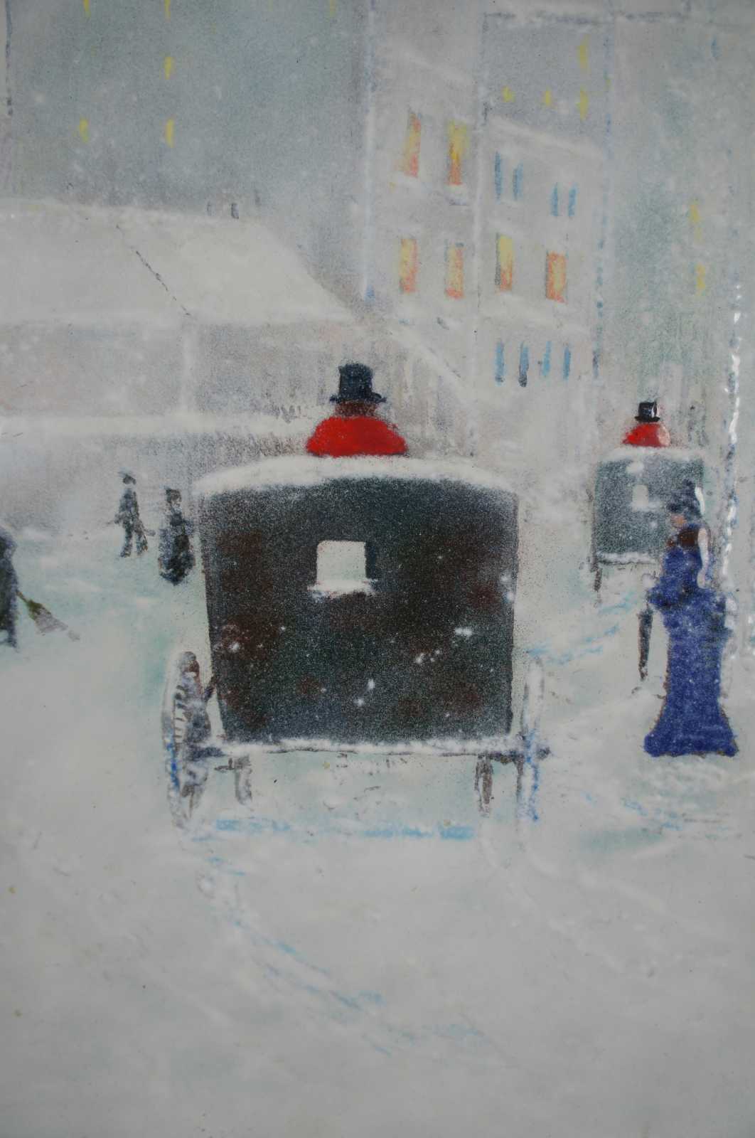 Carol Simkin (American, 20th Century) impressionist style enamel on copper painting of a snowy cityscape with Victorian figures and carriages. Carol was a student of Max Karp who was known as the "father of modern enameling".