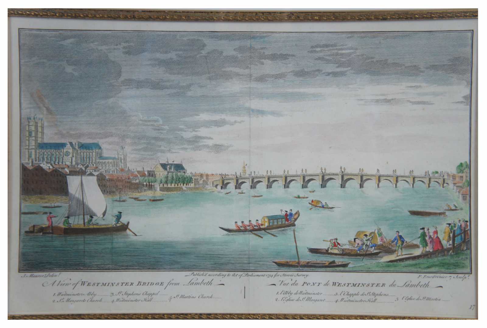 Antique hand colored riverscape / landscape copperplate engraving based on a painting by Jacob Maurer and engraved by Paul Fourdrinier - A View of Westminster Bridge from Lambeth, published according to Act of Parliament 1754 for Stowe’s Survey of London. BIO: Paul Fourdrinier sometimes referred to as Peter or Pierre Fourdrinier, was an 18th Century engraver in England. Paul Fourdrinier, engraver and printseller, was born on 20 December 1698 in Groningen in the Netherlands, the son of Jacques Fourdrinier and his wife, Jeanne Theroude, Huguenot refugees from Dieppe, Normandy. He was a pupil of Bernard Picart at Amsterdam for six years, and came to England in 1720. He was employed in engraving portraits and book illustrations. He also engraved two works by Peter Monamy, marine paintings displayed in Vauxhall Gardens. The engravings were published in 1743, but may have been executed earlier. Starting in 1742 Fourdrinier produced a series of books consisting of numerous folding charts showing "The Succession of Colonels to all his Majesties Land Forces from their Rise to 1742", as well as many other details of British military and naval personnel. The 2004 edition of the Oxford Dictionary of National Biography makes it clear that in the 19th century edition of the Dictionary of National Biography this engraver's works and career were assigned to two individuals, Peter (or Pierre) and Paul Fourdrinier. Peter/Pierre is now seen to be a fictitious individual resulting from an accidental misnaming of Paul. Paul Fourdrinier is mentioned as the engraver of some of the works listed above, and he has been identified with the Paul Fourdrinier who was of the parish of St. Martin's-in-the-Fields, married to Susanna Grolleau, and who died in January or February 1758. The couple had at least five children, including a son Henry Fourdrinier, whose daughter, or granddaughter, Jemima Fourdrinier was the mother of Cardinal John Henry Newman. The engravings listed are in all cases inscribed ‘P. Fourdrinier.’ The title-page of Chambers's ‘Civil Architecture’ says that the plates were engraved by ‘Old Rooker, Old Fourdrinier, and others.’ Paul Fourdrinier also founded a stationery business which was carried on by his son and grandsons (Henry and Sealy)) until at least 1811.