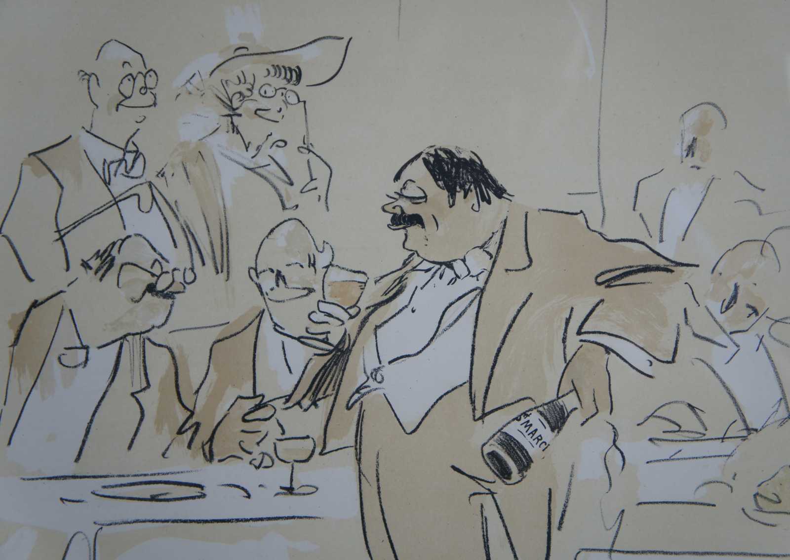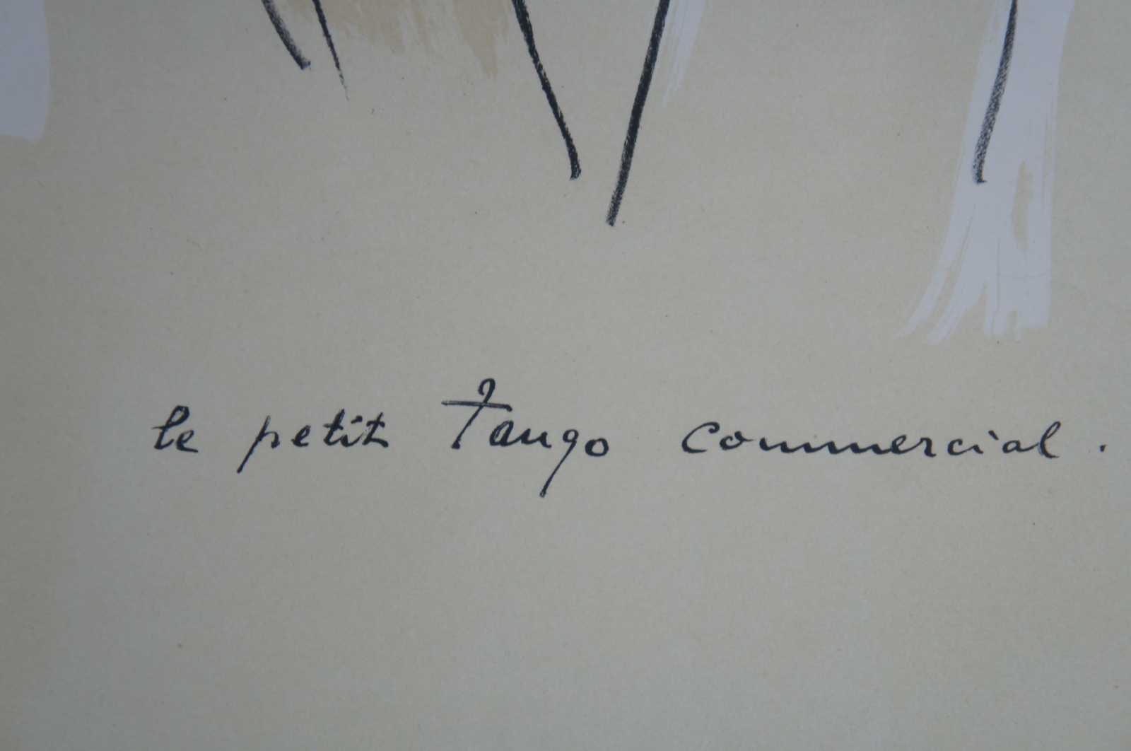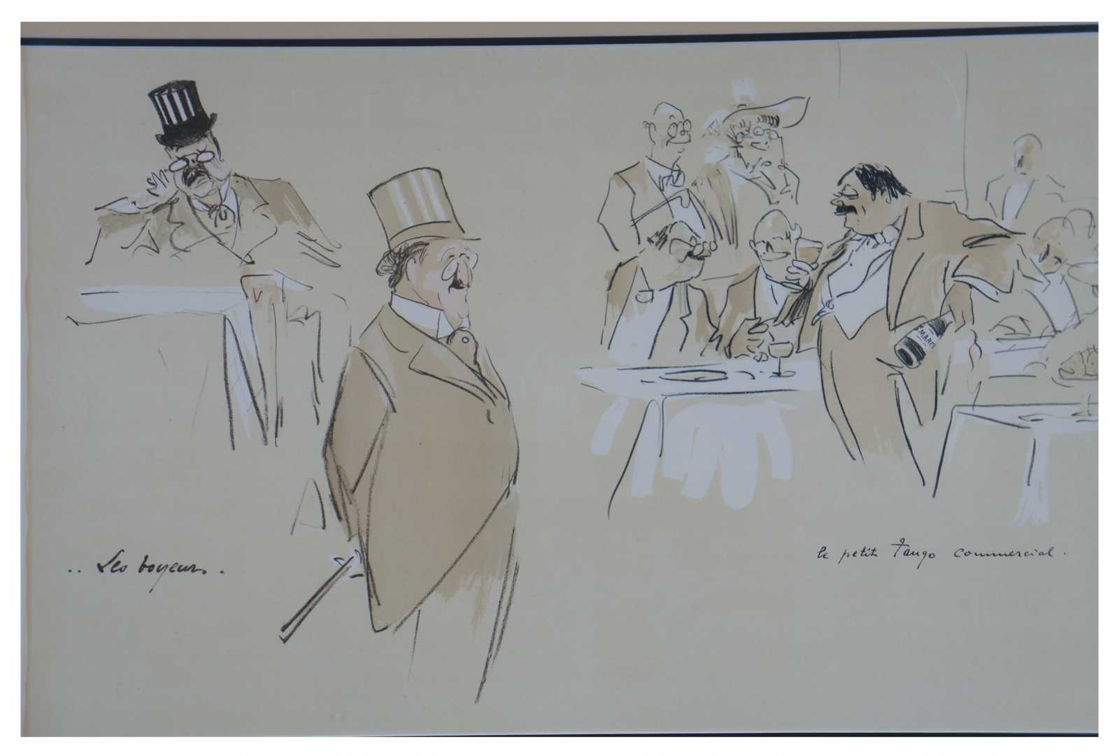 Antique French cartoon print showing a well dressed man watching other rich looking figures as they lounge about a restaurant over the words “Les voyeur… le petite tango commercial” (The voyeur… the small commercial tango/dance).