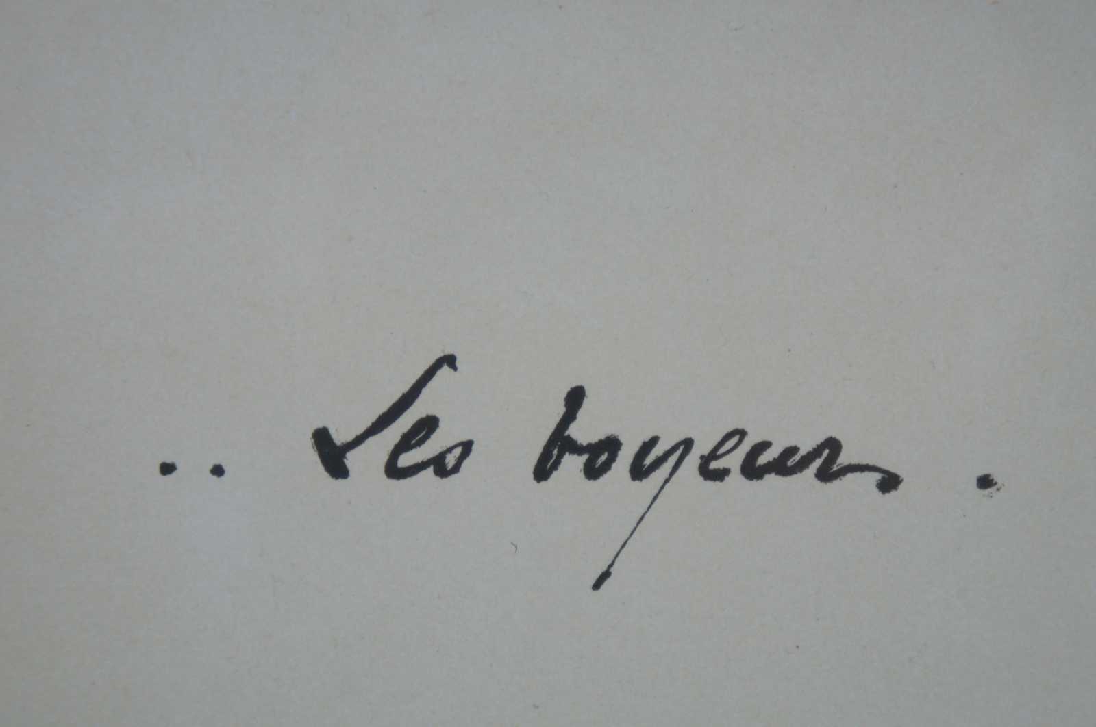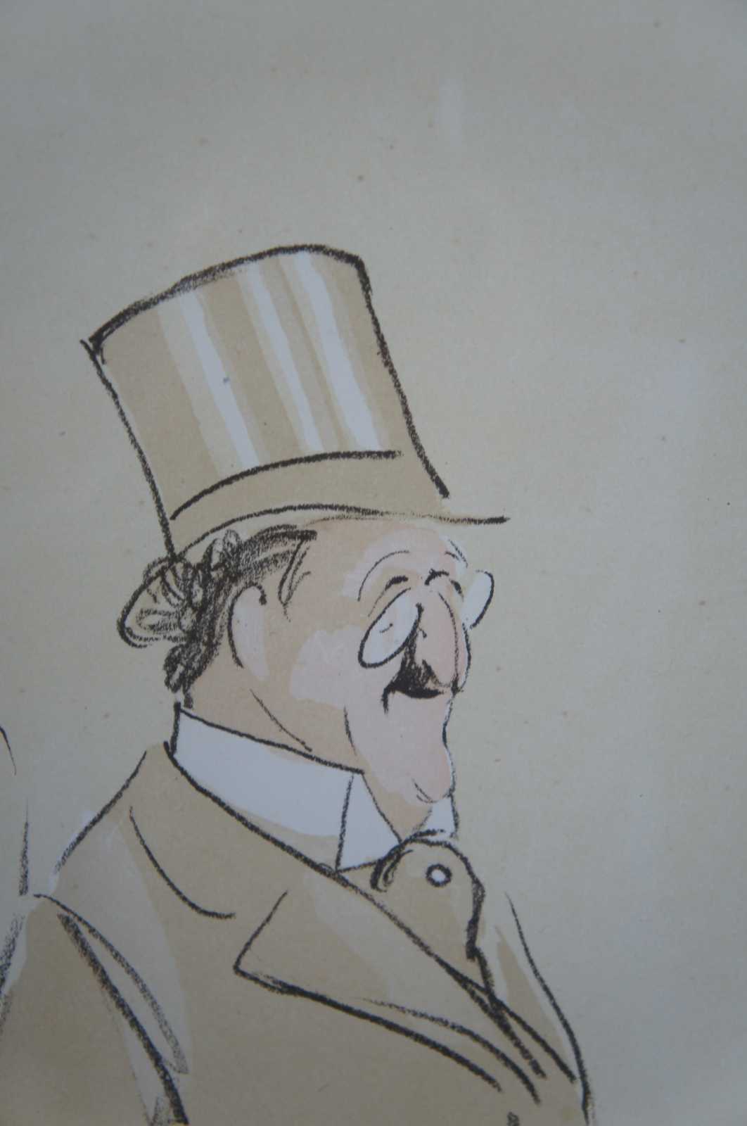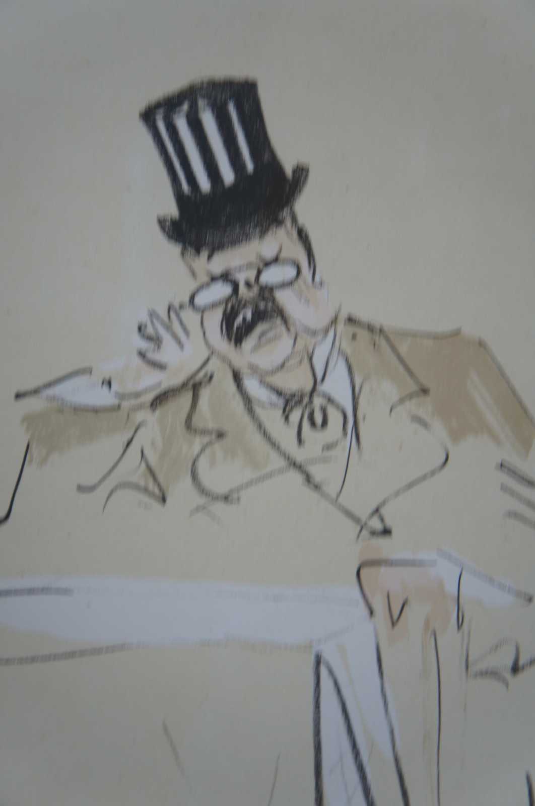 Antique French cartoon print showing a well dressed man watching other rich looking figures as they lounge about a restaurant over the words “Les voyeur… le petite tango commercial” (The voyeur… the small commercial tango/dance).
