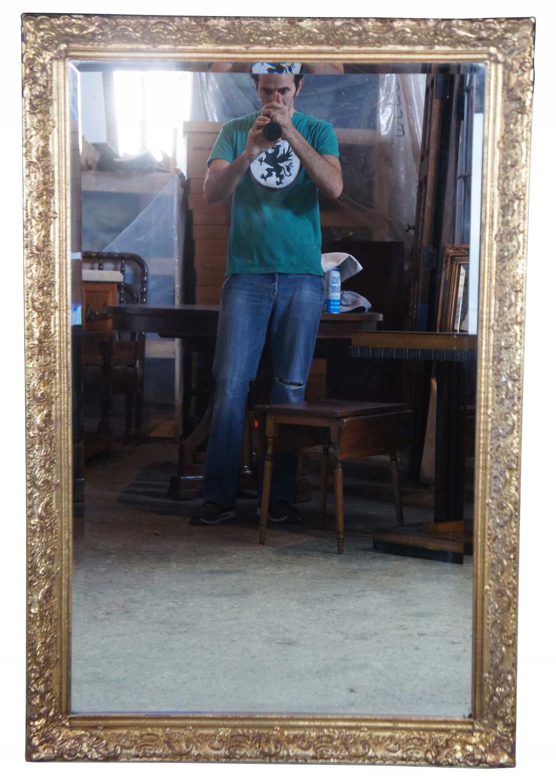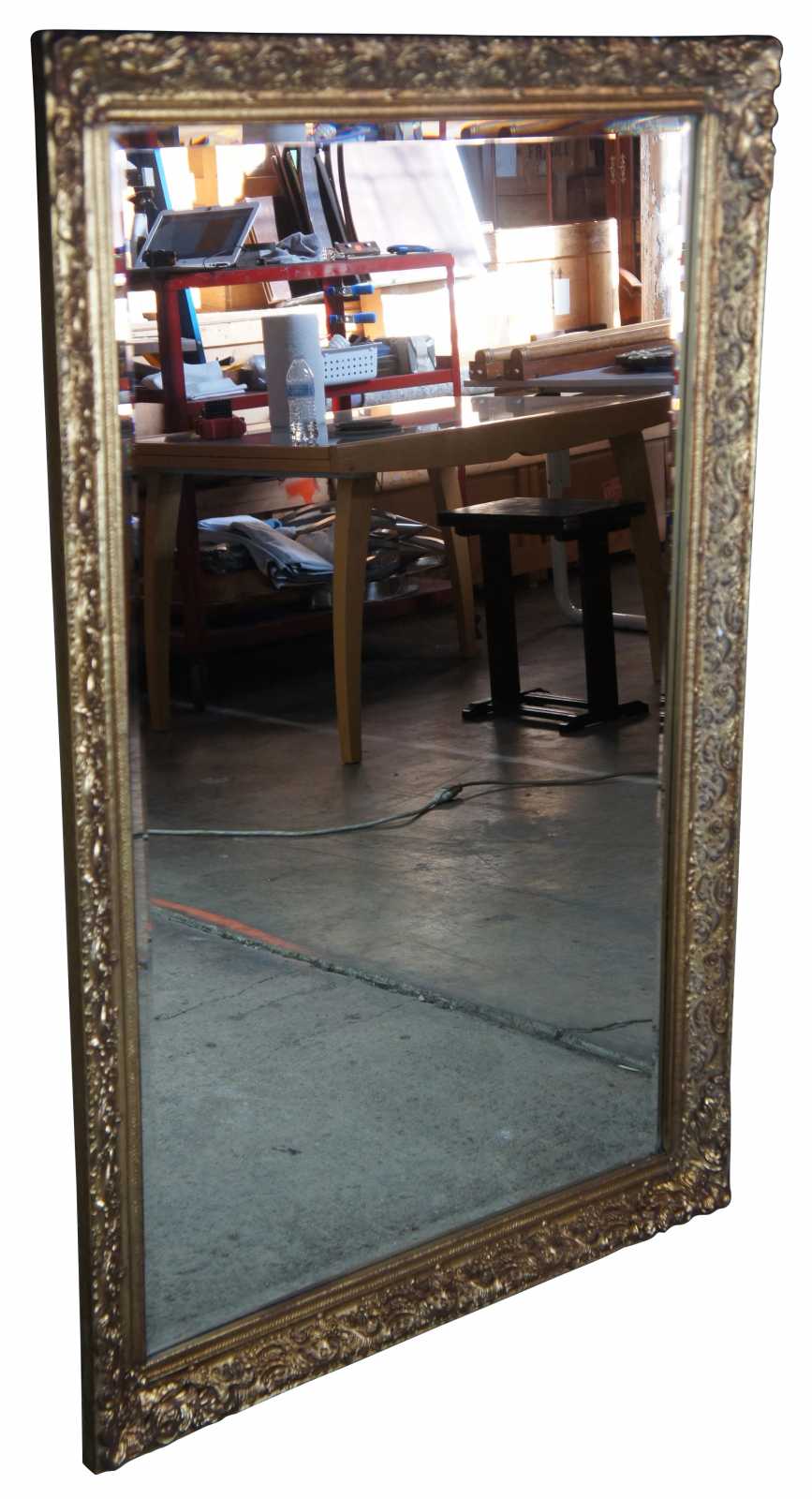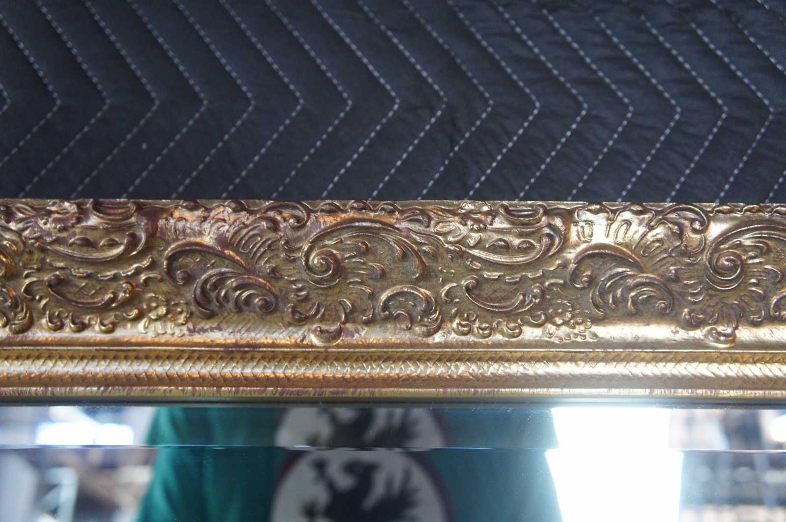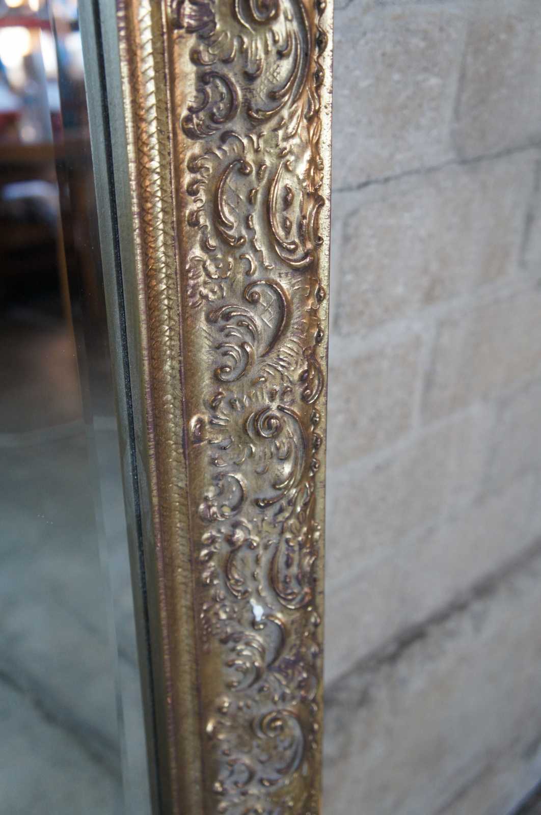 A unique French or Hollywood Regency style mirror. Features a scalloped gold frame with bevelled glass mirror. The mirror is setup to be hung vertically or horizontally making a versatile addition to any space.