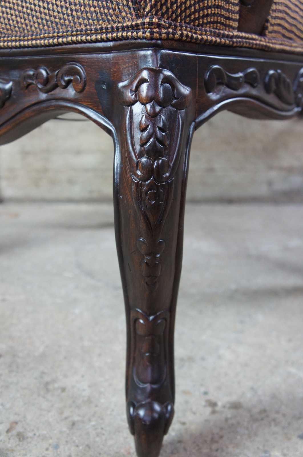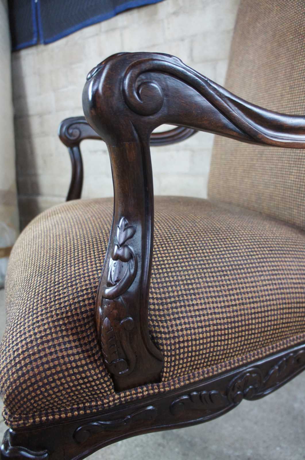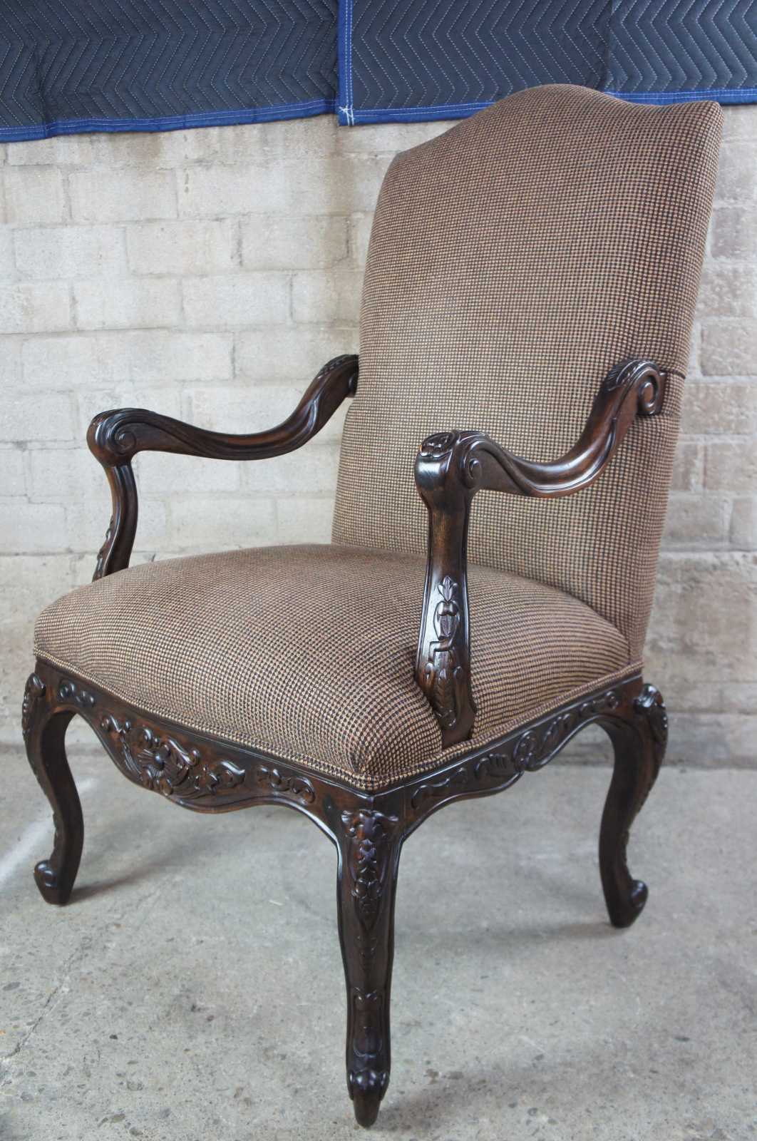 Cynthia arm chair by Henredon for Heritage Home Group. Part of the upholstery collection with a tweet fabric and a hardwood carved frame in Java finish. H0091.