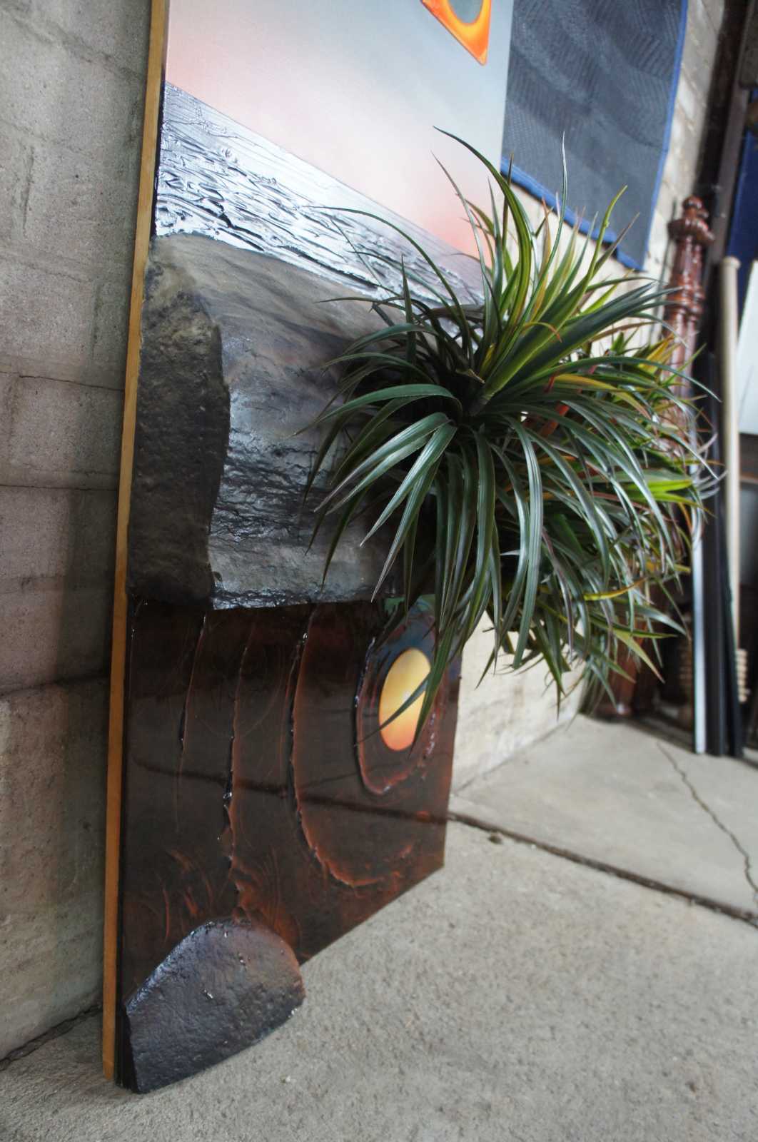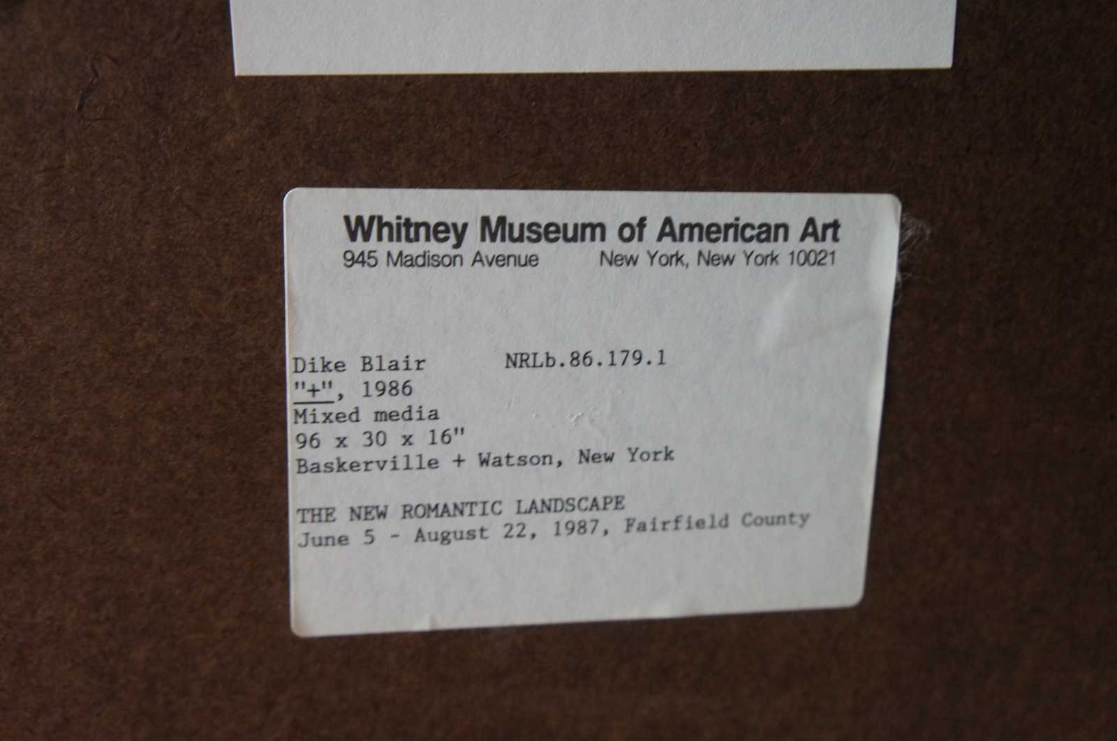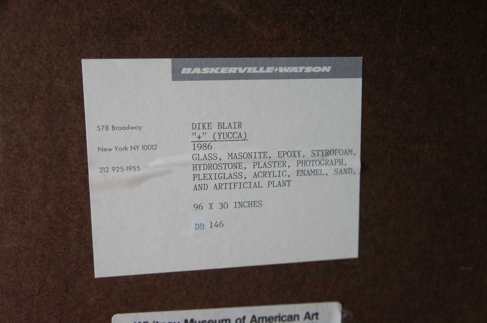 Dike Blair original mixed media artwork, Made from glass, masonite, epoxy, styrofoam, hydrostone, plaster, photograph, plixiglass, arcylic, enamel, sand and artificial plant. Showcased in the Whitney Museum of American Art circa 1987 at The New Romantic Landscape Exhibit in New York City. Titled ""+"" (Yucca).