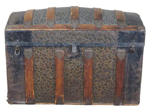 Antique 19th century Victorian dome top trunk. Features pressed steel design and oak paneled exterior.