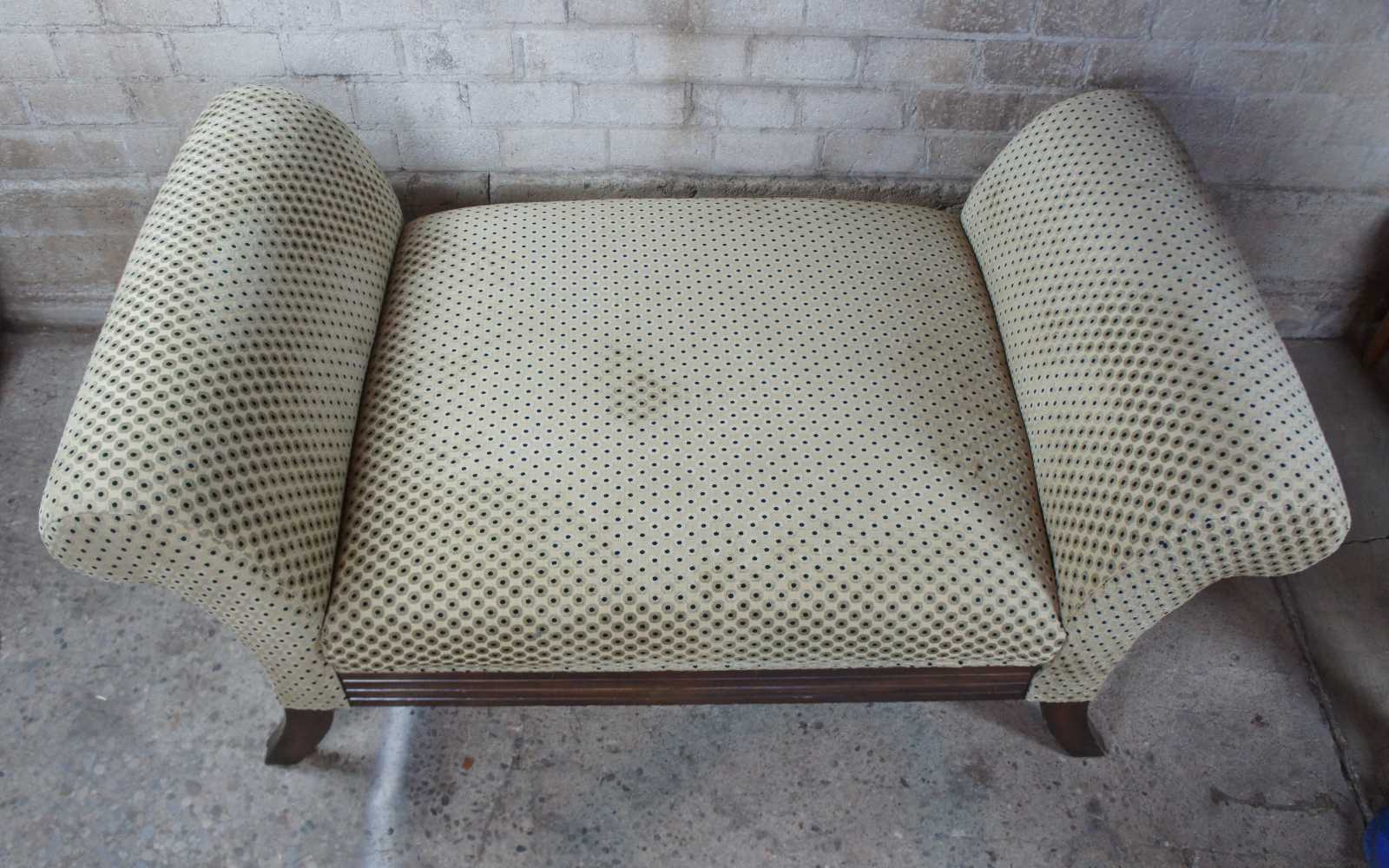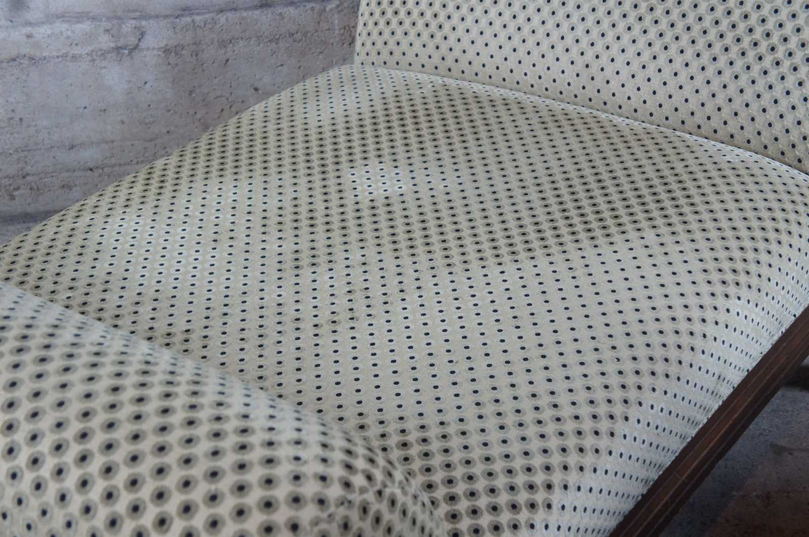 Polka dot upholstered day bed or settee. Features rolled arms over flared legs and a mahogany toned finish. Olive green and black sheened upholstery.