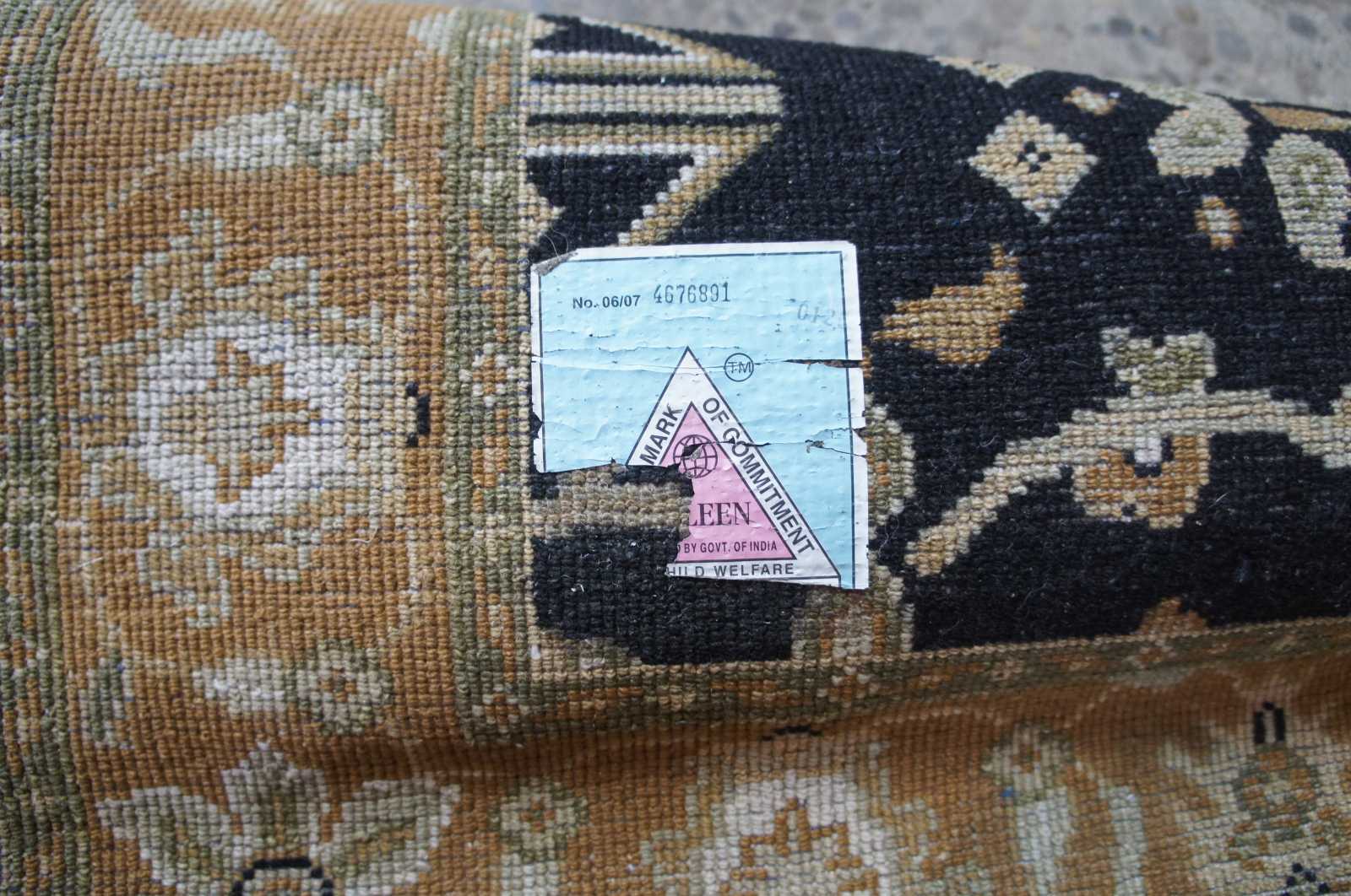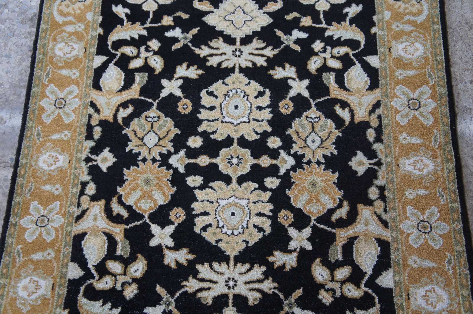 Vintage machine made rug runner featuring floral design with black field and gold / olive / green / tan accents.