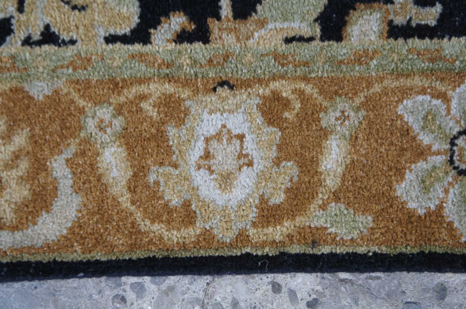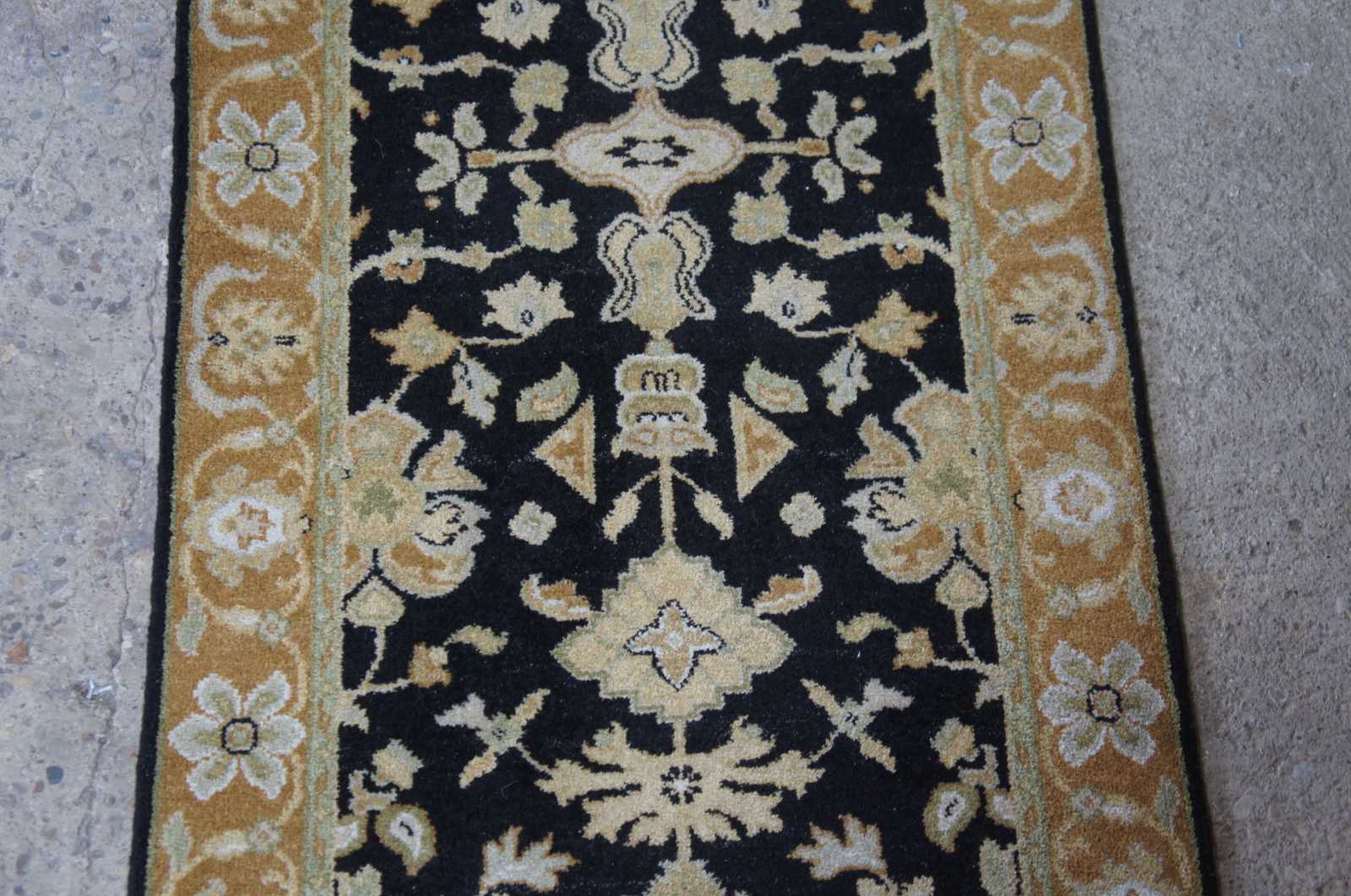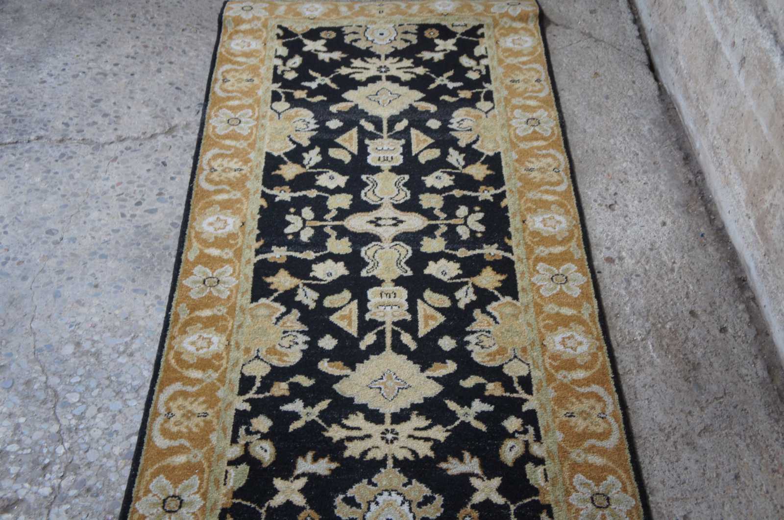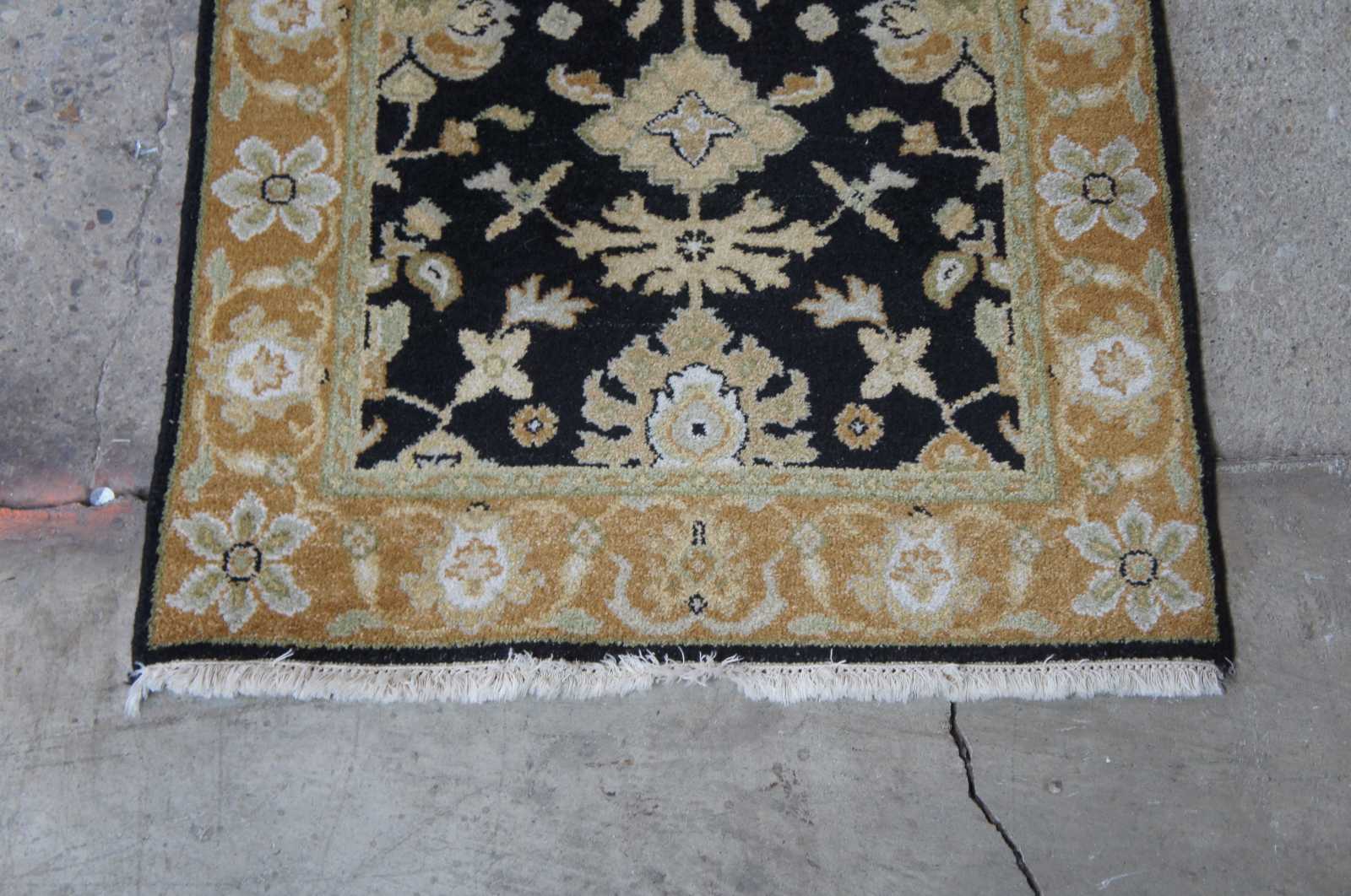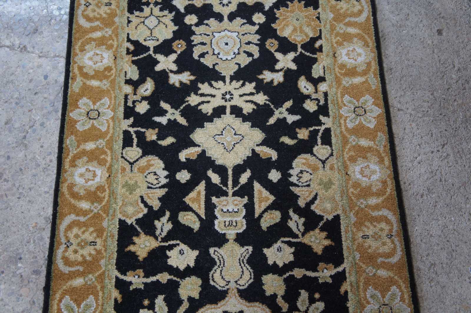 Vintage machine made rug runner featuring floral design with black field and gold / olive / green / tan accents.