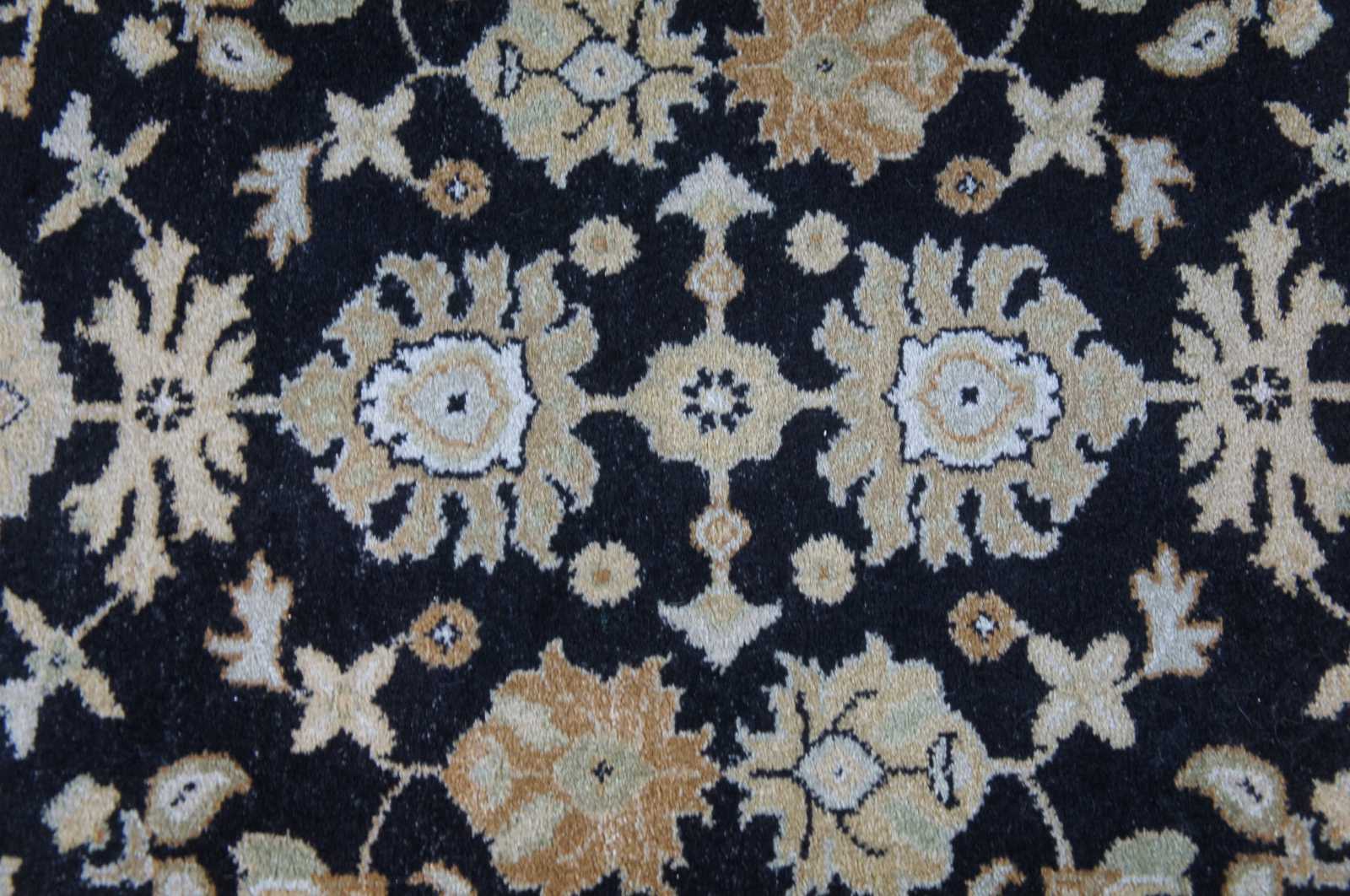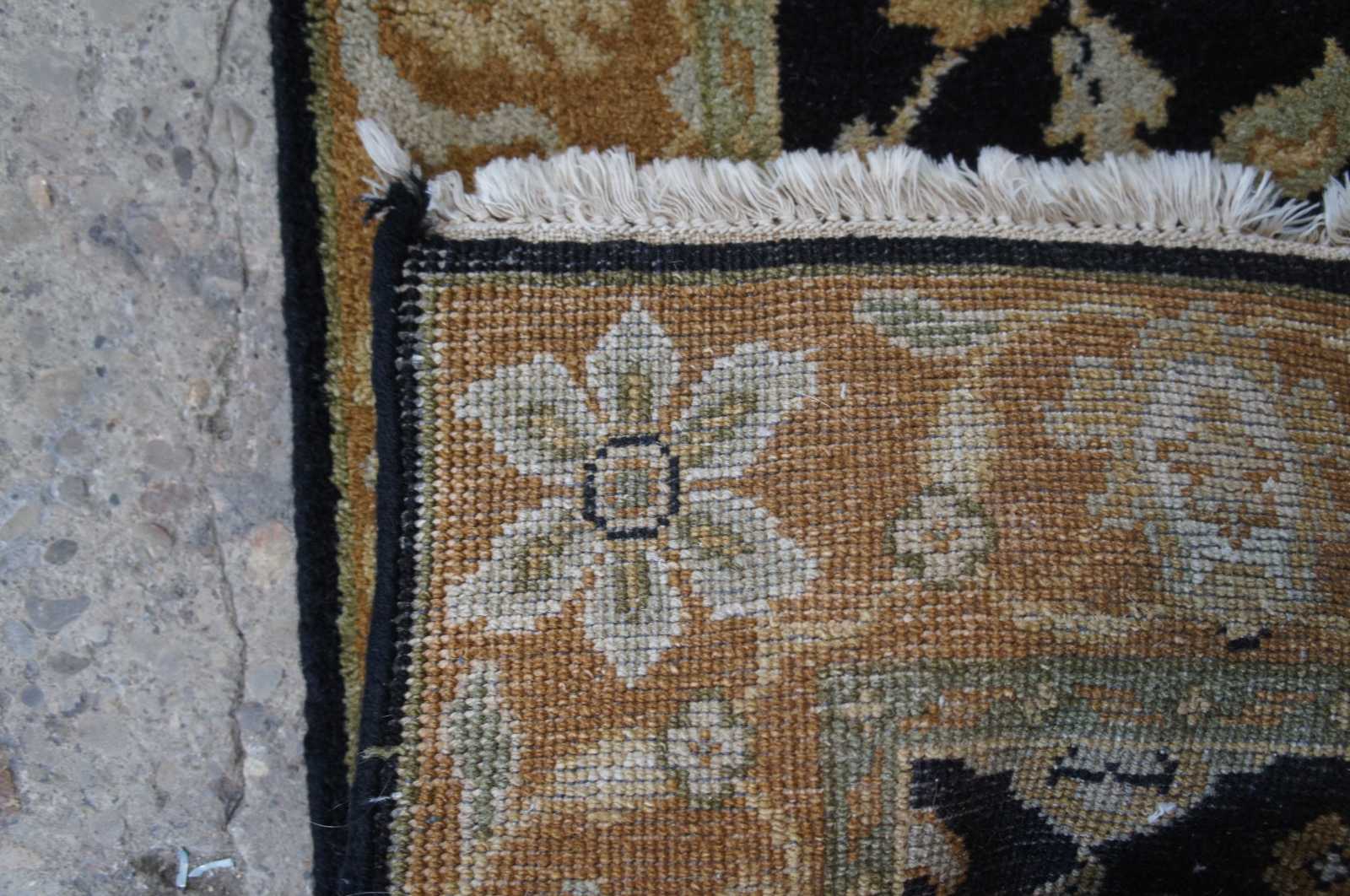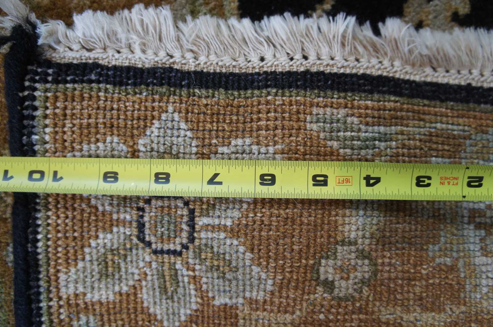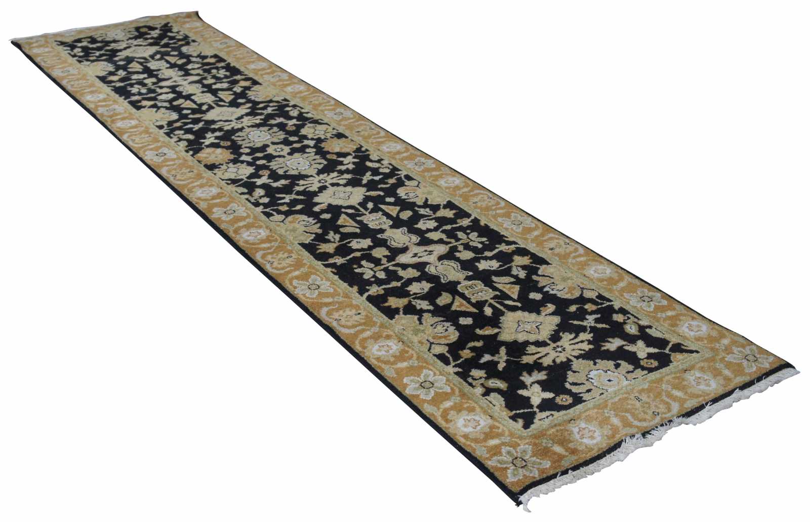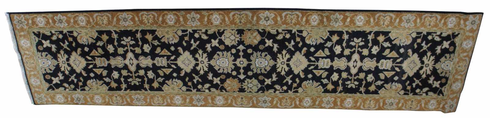 Vintage machine made rug runner featuring floral design with black field and gold / olive / green / tan accents.
