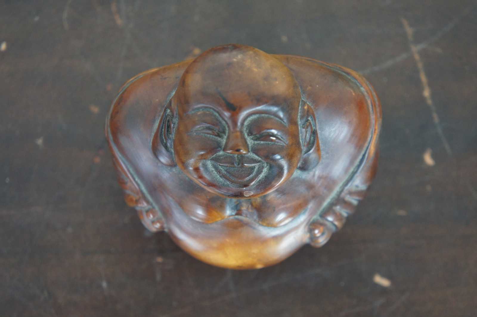 Vintage wooden seated, lucky Buddha figurine with his head thrown back in laughter. / Not to be confused with THE Buddha (Siddhartha Gautama, the 6th Century BC ascetic revered by Buddhists for finding enlightenment) the Laughing Buddha was a 10th-century Chinese monk named Budai. According to accounts written centuries later, Budai was a gregarious, pot-bellied monk who wandered from village to village carrying a large sack over his shoulder. (Budai means ""cloth sack"" in Chinese.) He was beloved by children and the poor, to whom he would give rice and sweets from his sack.