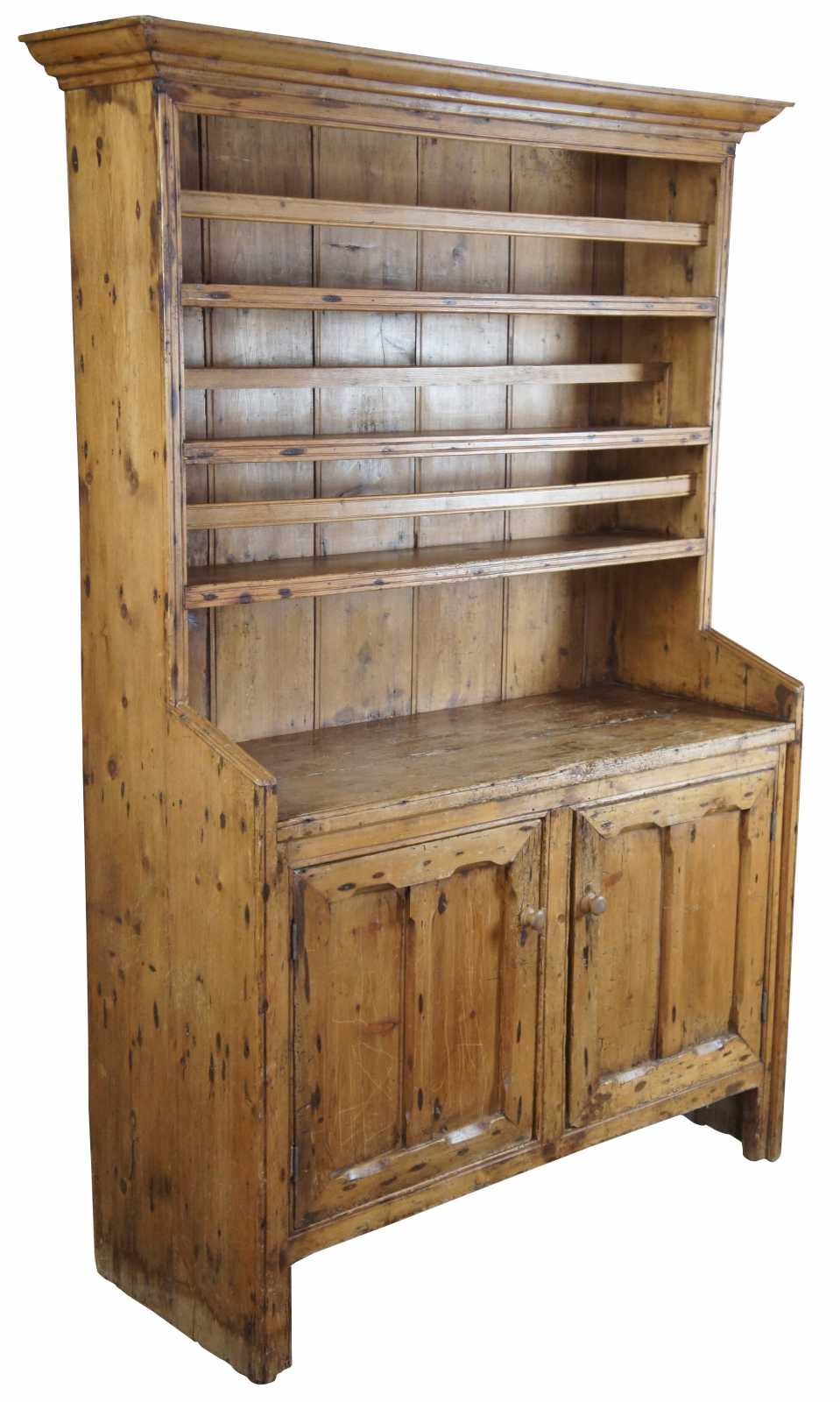 Early 20th century old world English pine bookcase. A stepback design with three shelves and lower cabinet for storage. Each of the three shelves features a unique support that removes allowing you to display and protect the china behind it.