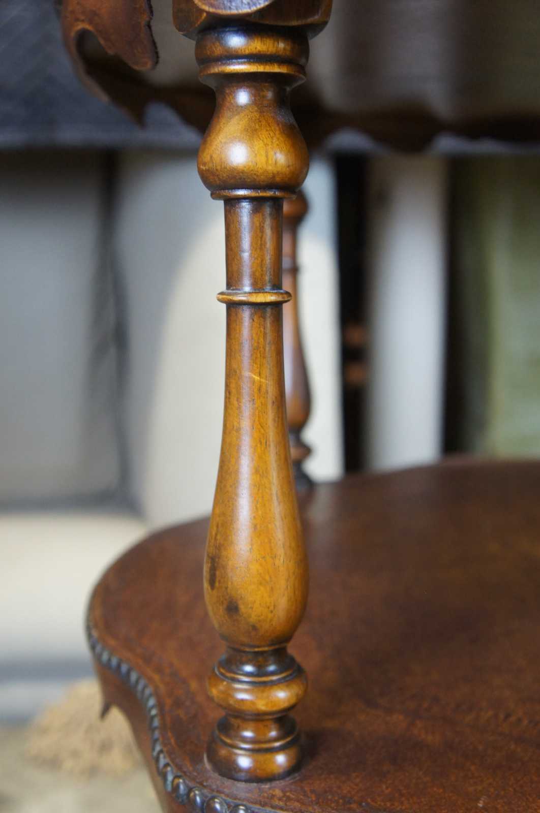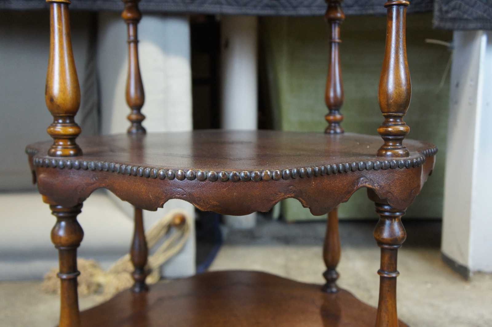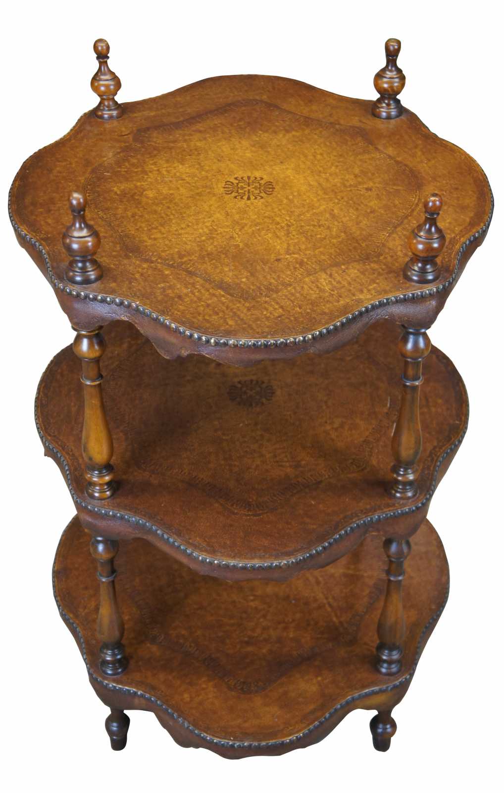 Circa 1980s Theodore Alexander tiered leather tables. Features three turtle top table surfaces, supported by turned ballisters. Includes tooled leather and nailhead trim. 5033-003, handmade in Vietnam.