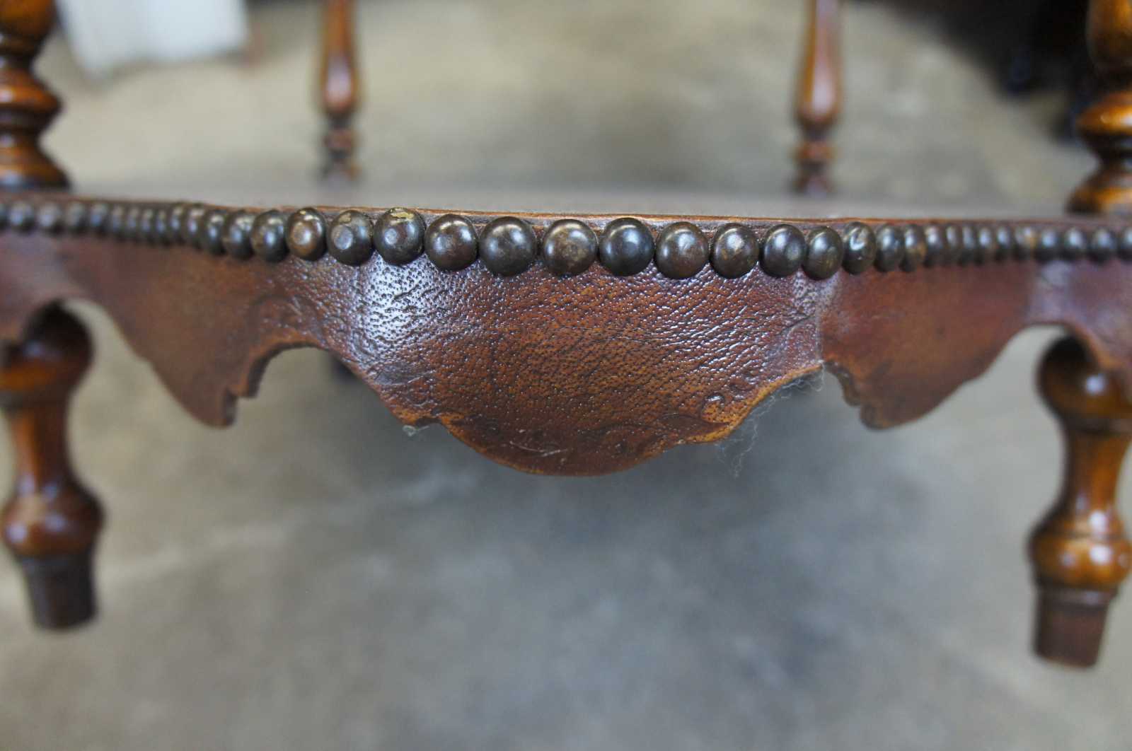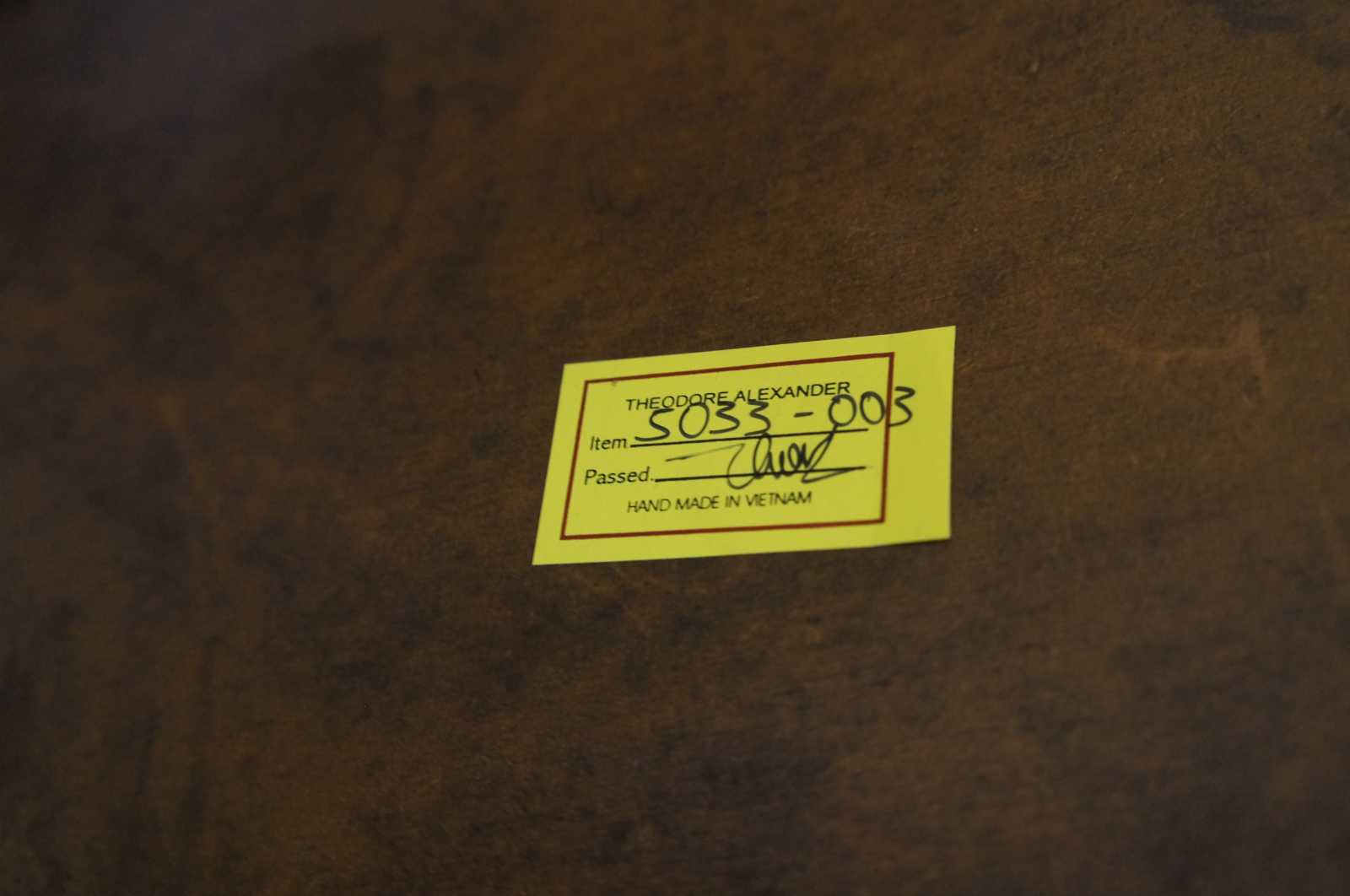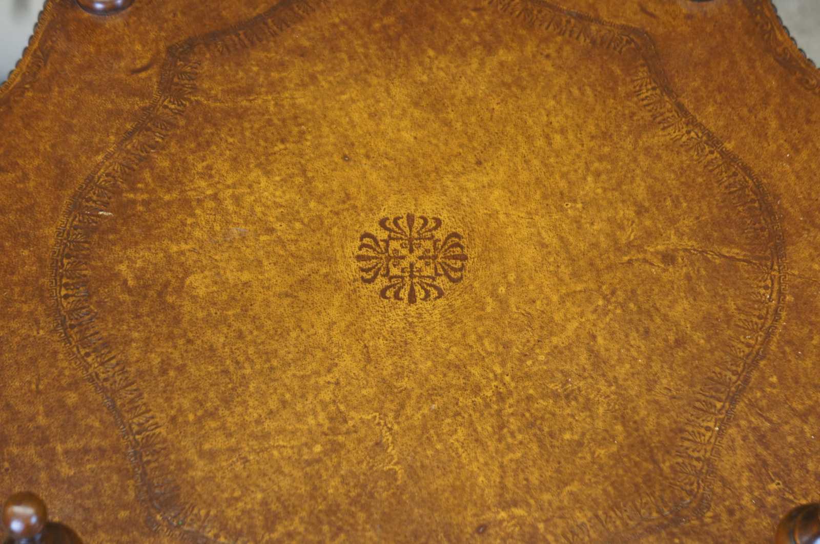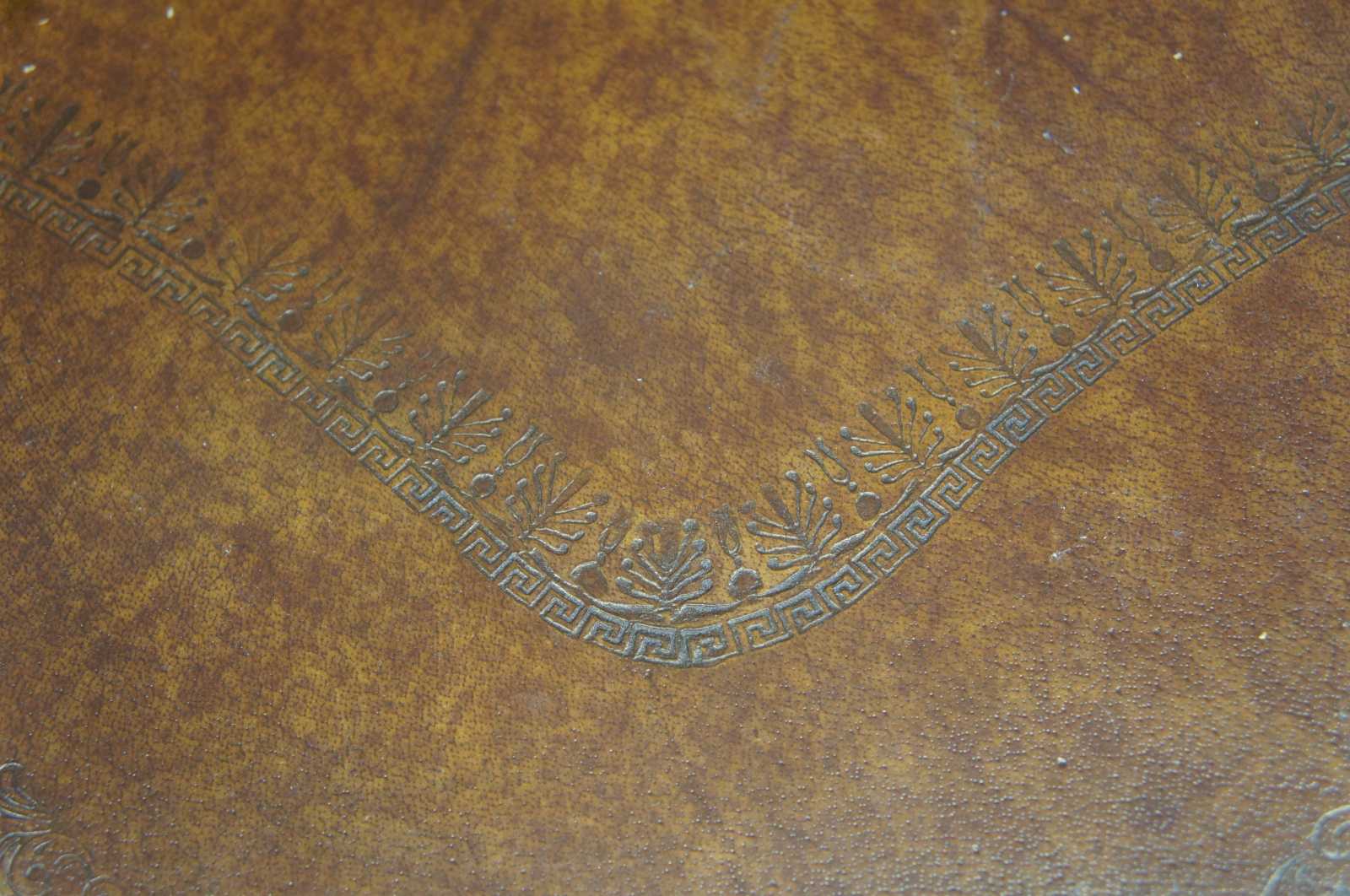 Circa 1980s Theodore Alexander tiered leather tables. Features three turtle top table surfaces, supported by turned ballisters. Includes tooled leather and nailhead trim. 5033-003, handmade in Vietnam.