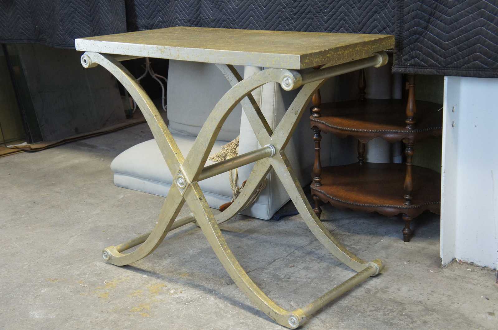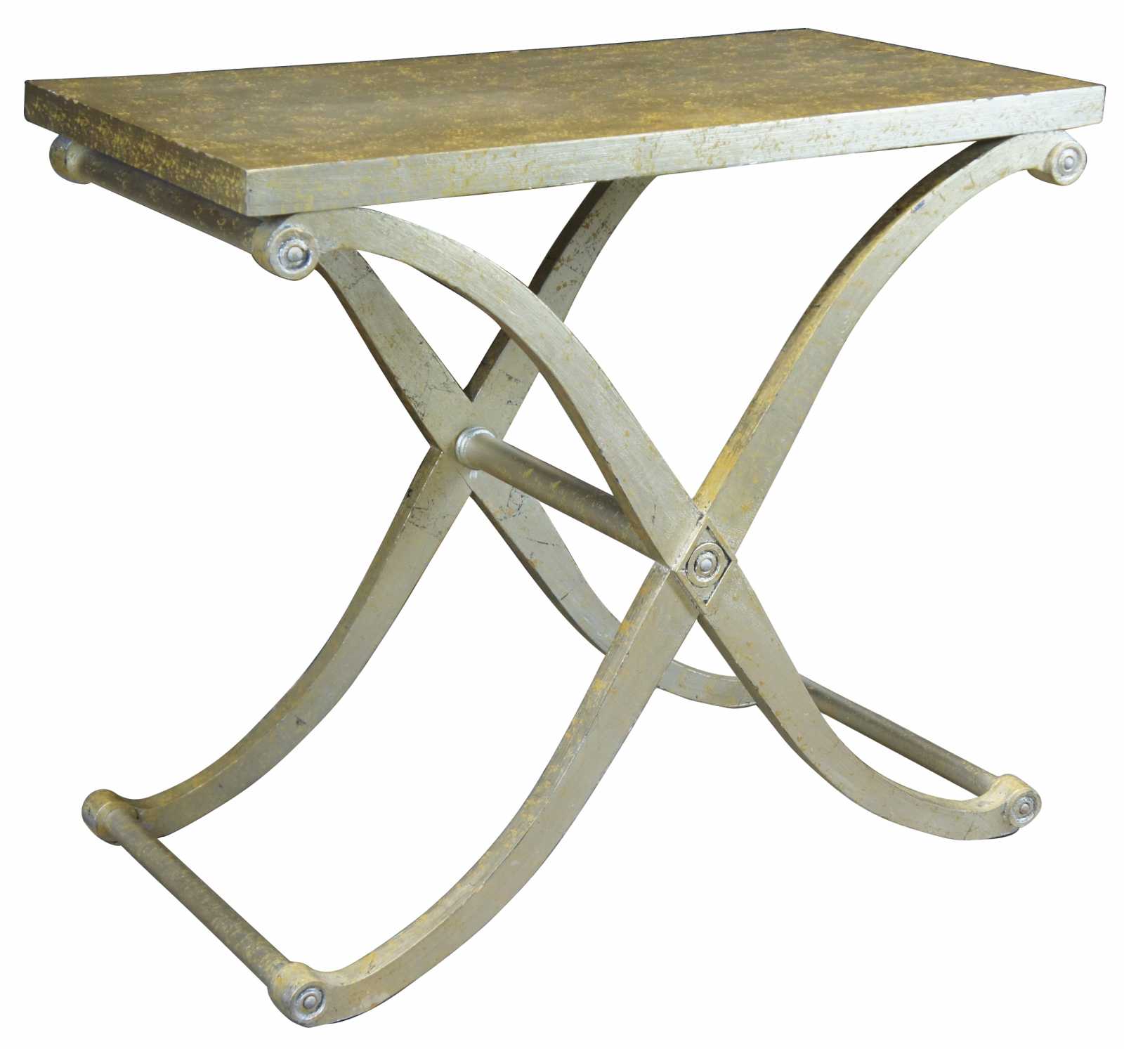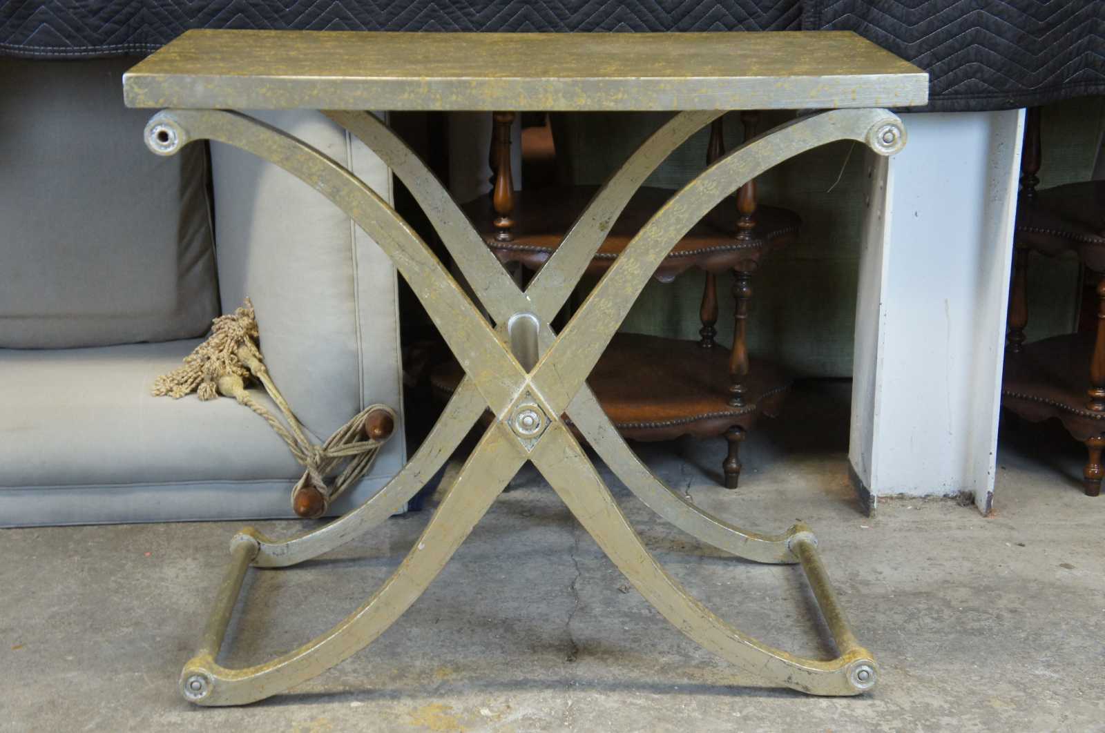 Neoclassical style console or entry table. Features an X shaped base in painted gold foil finish.