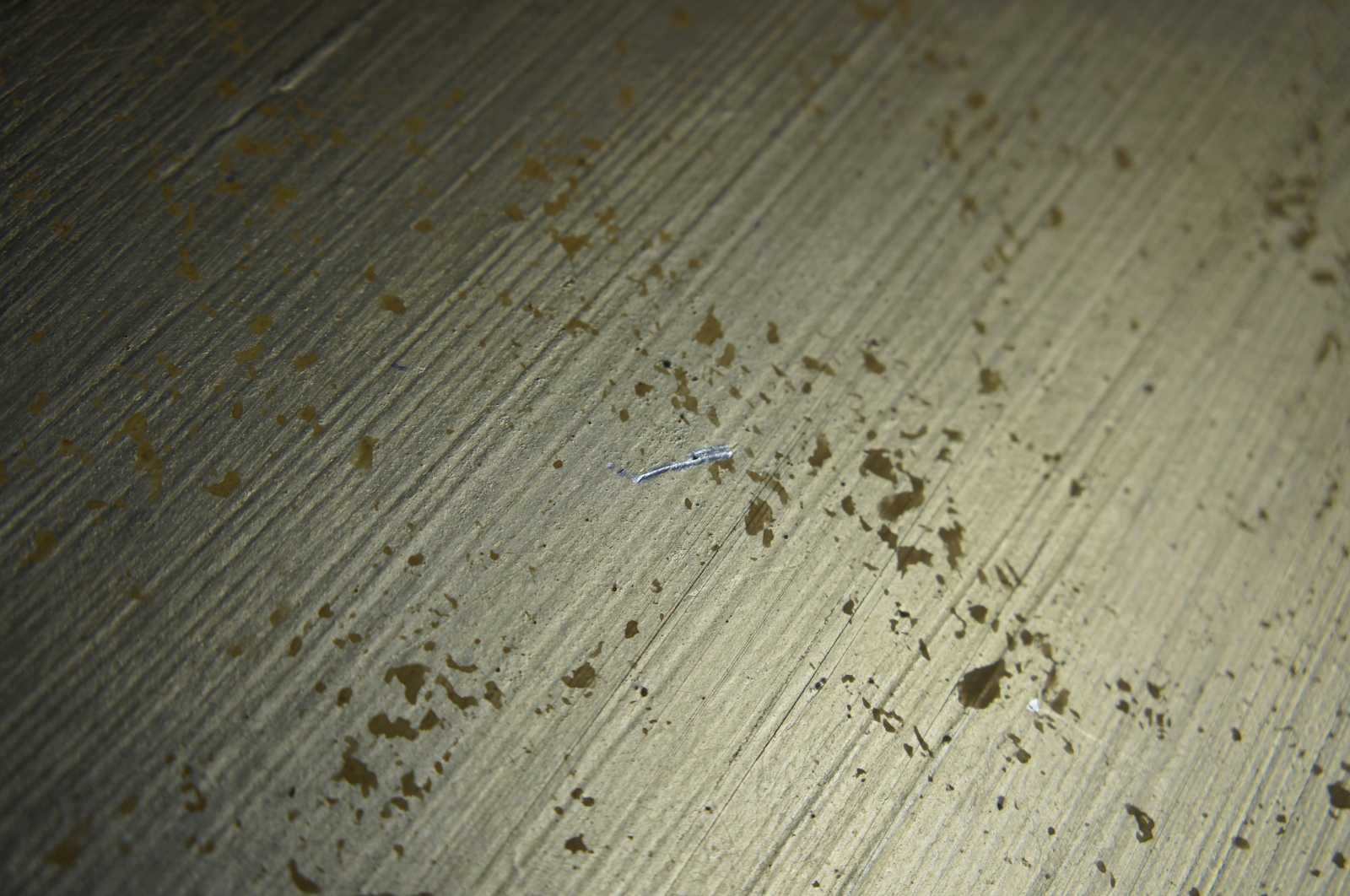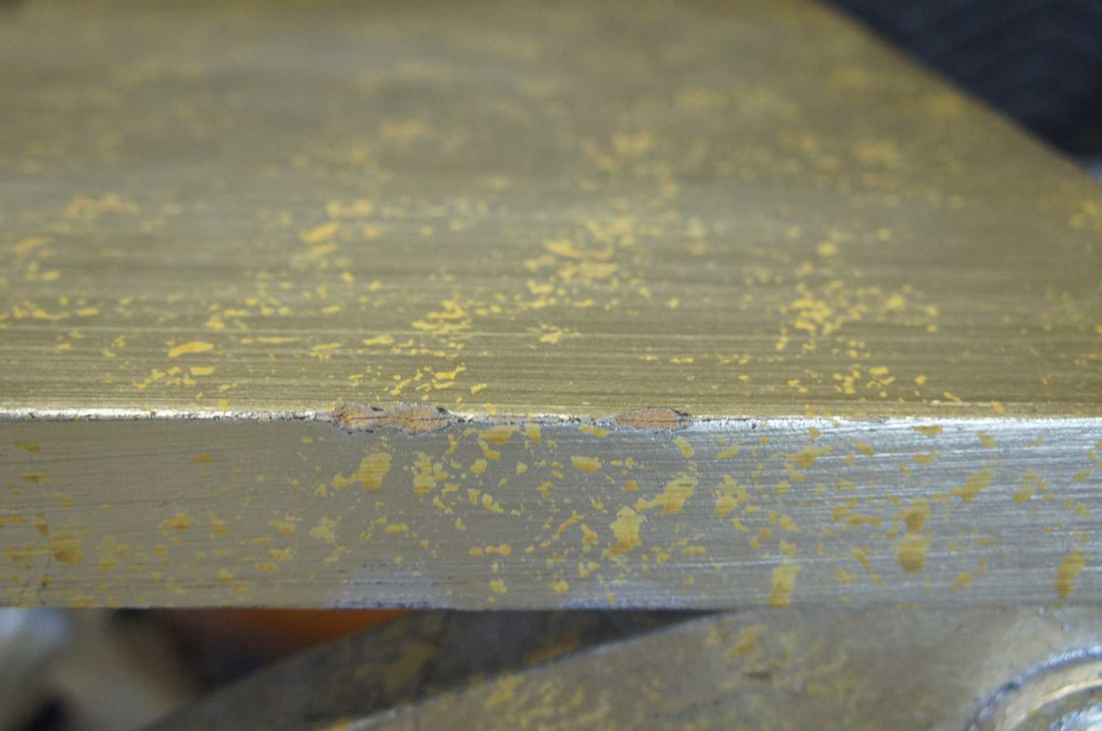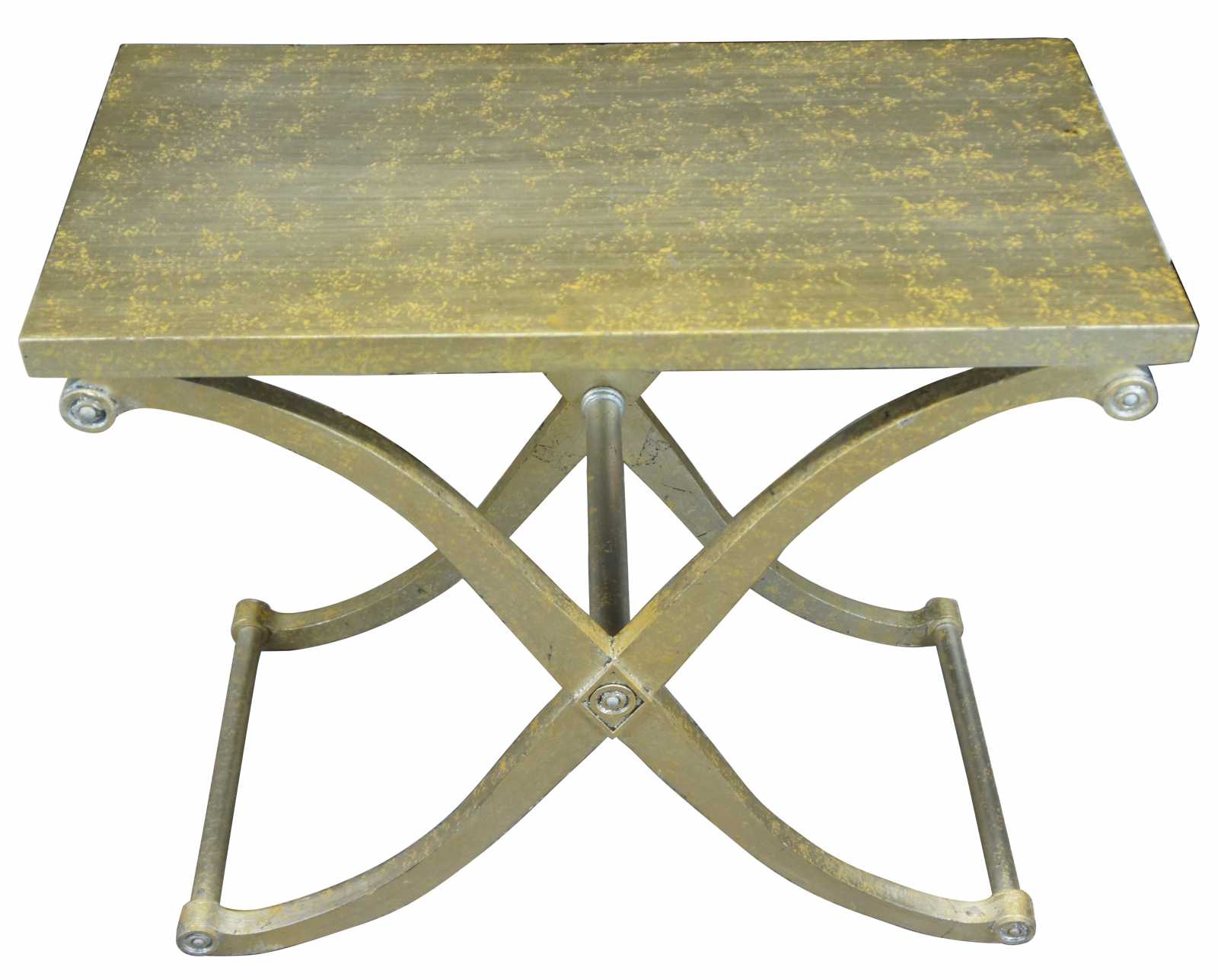 Neoclassical style console or entry table. Features an X shaped base in painted gold foil finish.