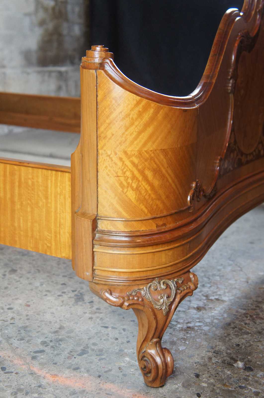 Circa 1920s French wrap around bed. Features a curved shape with ornate detail, scalloped top, matchbook veneering and burled accents. Made from walnut.
