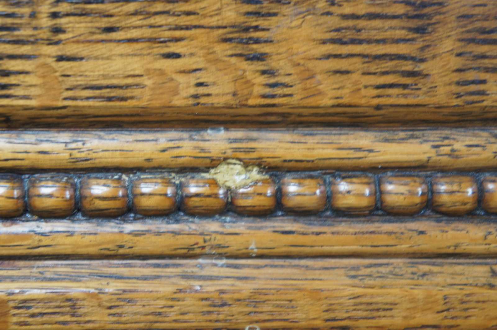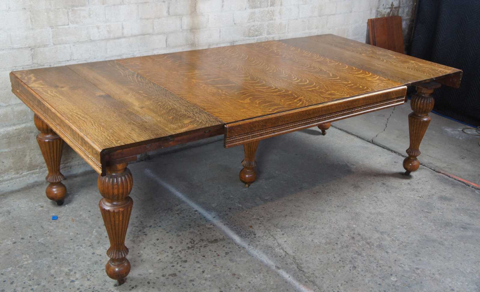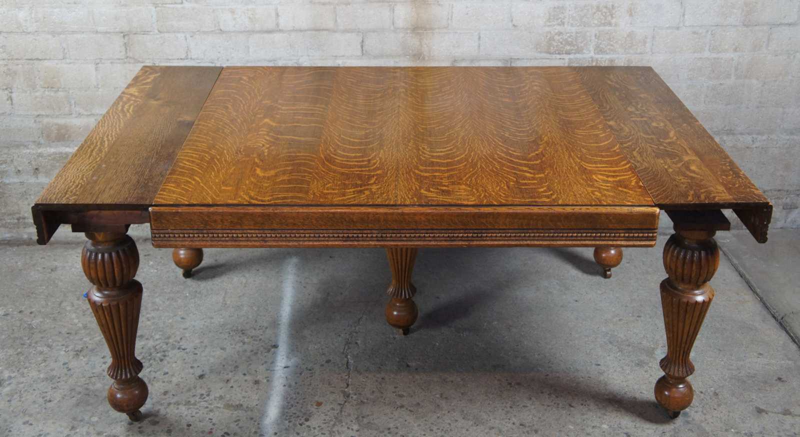 Turn of the 20th century quartersawn tiger oak dining table. Features a beaded apron over five robust reeded baluster legs. Opens with a draw leaf style design to extendable leaves on each side which can be used for variable extendable lengths.