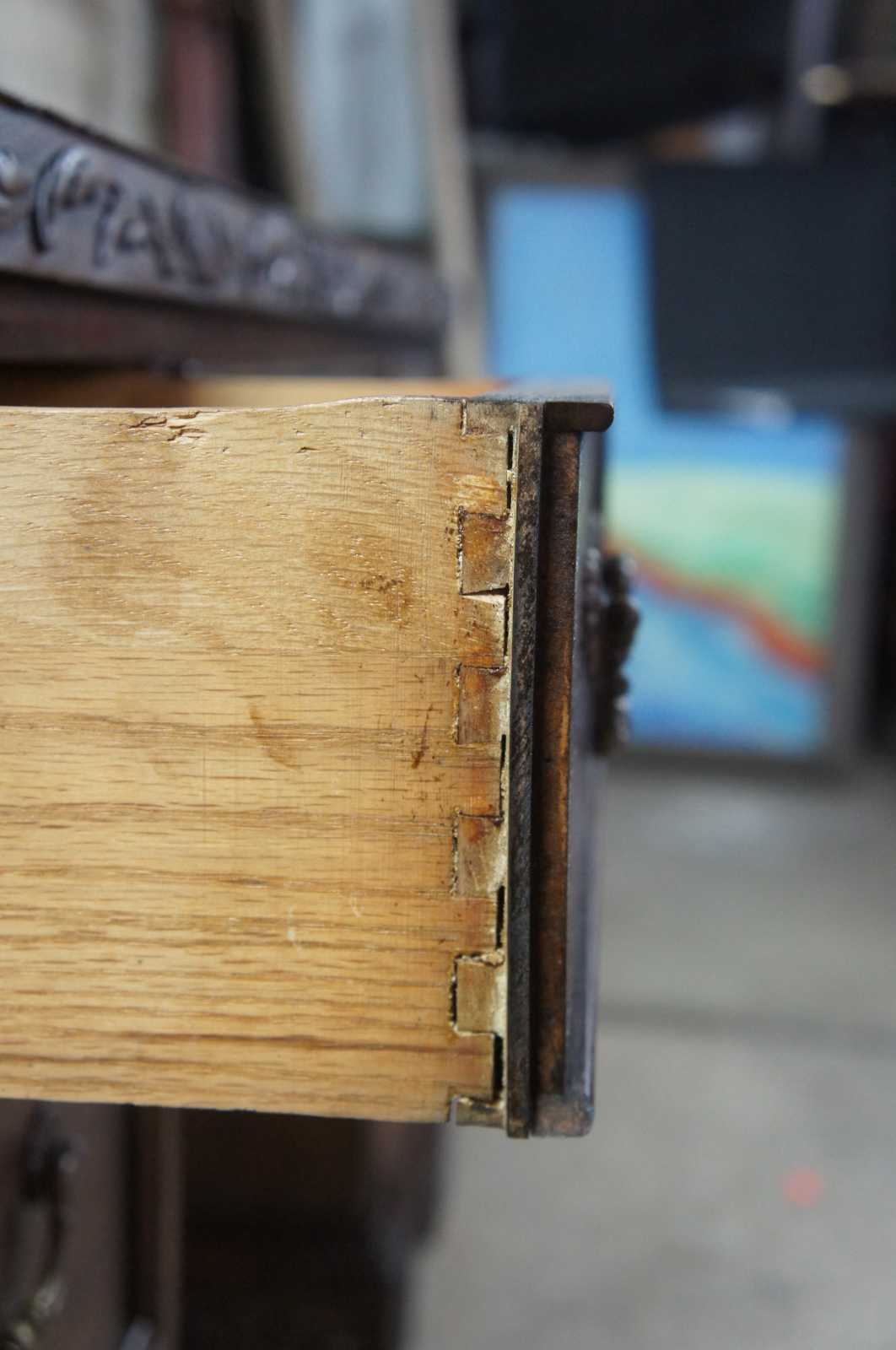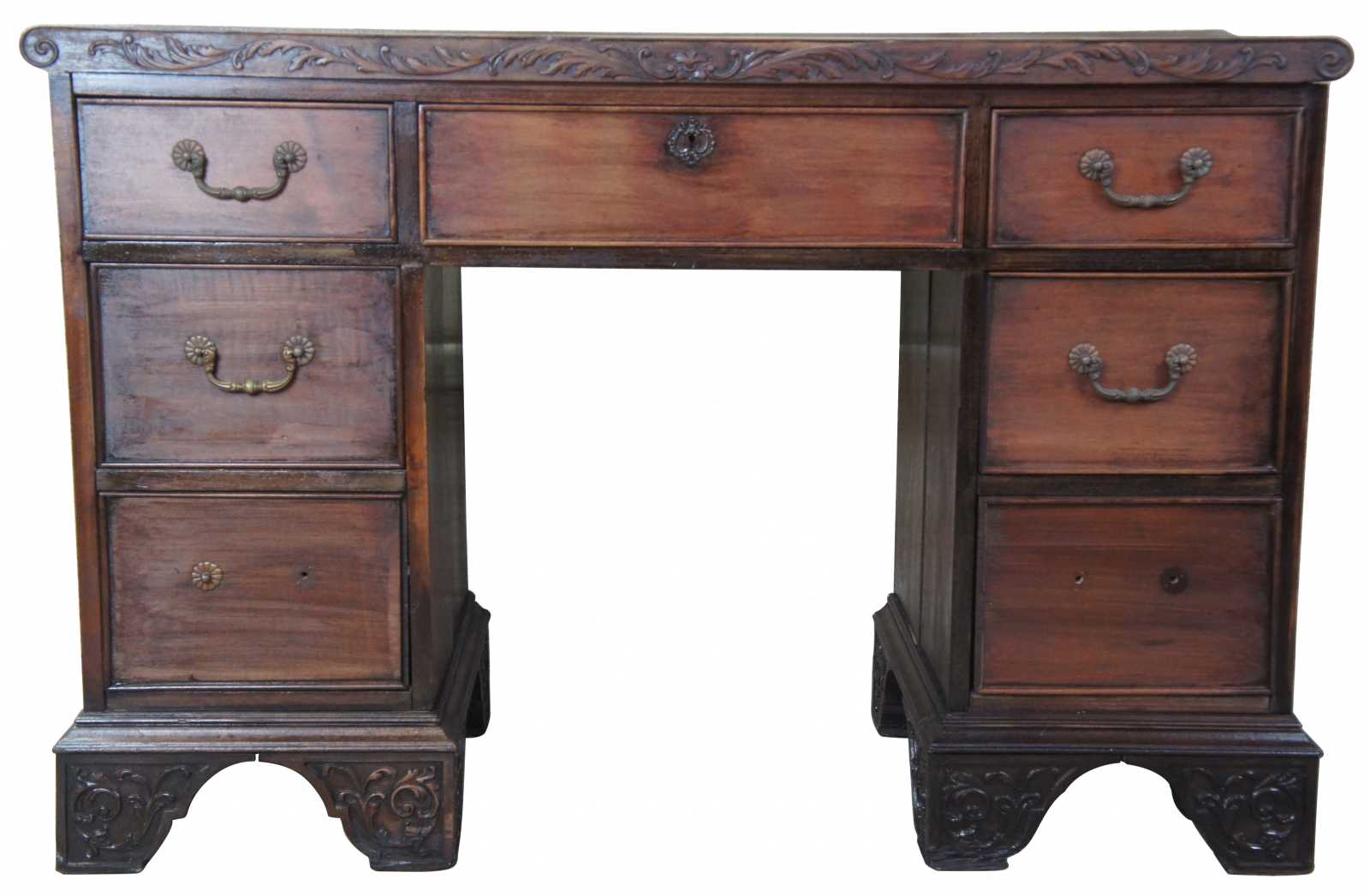 Circa 1940s Rococo Revival desk. Made from walnut with seven drawers and ornately carved detail.