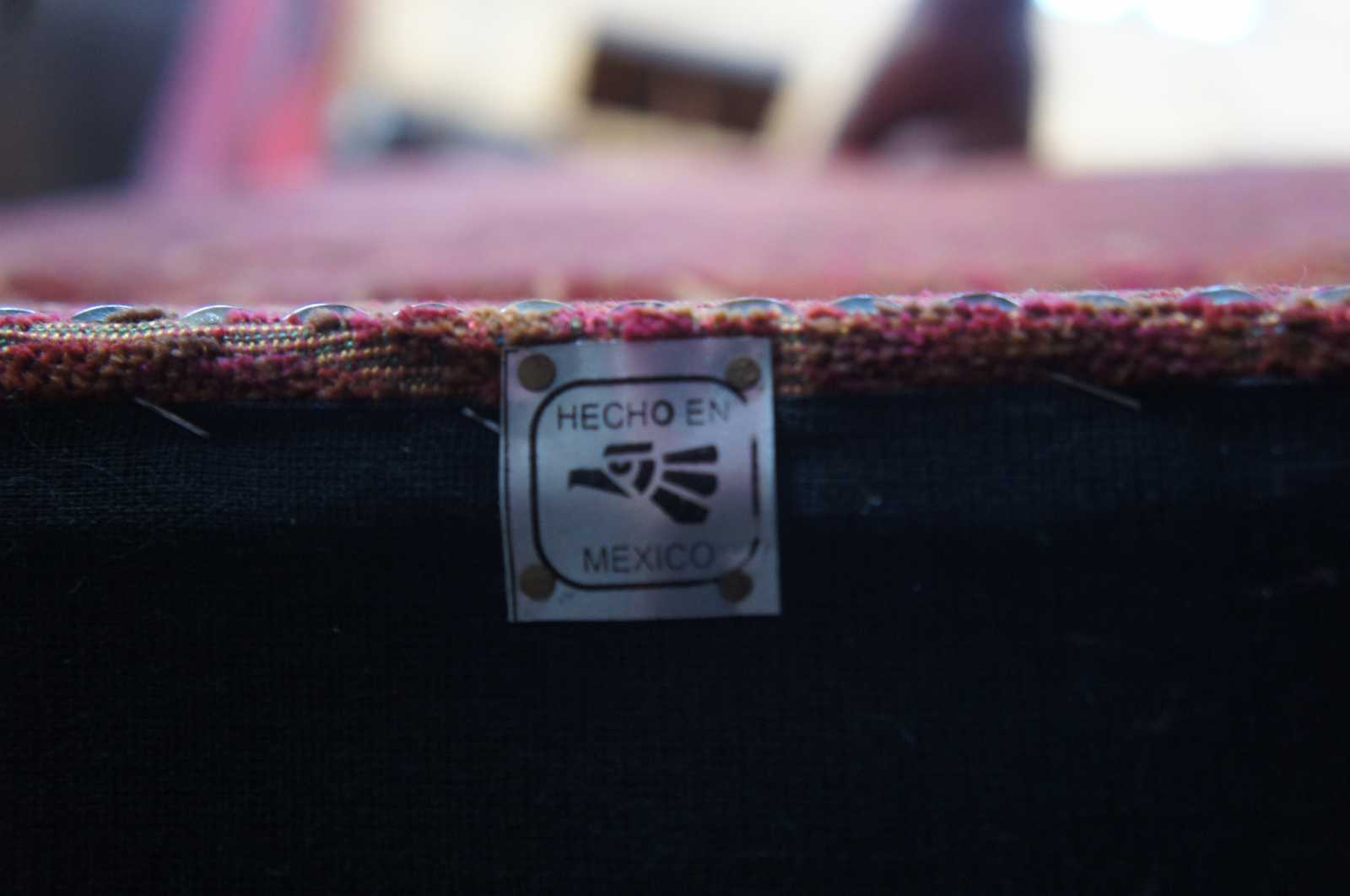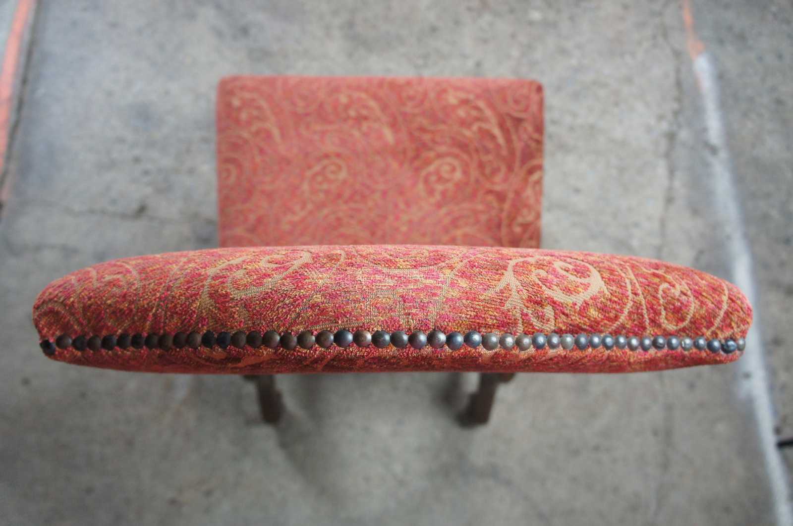Set of ten Arte De Mexico style oak chairs. Features Tuscan / Spanish Revival or Louis XIII styling with a paisley upholstery accented with nailhead trim. Scrolled feet are connected by serpentine H stretcher.