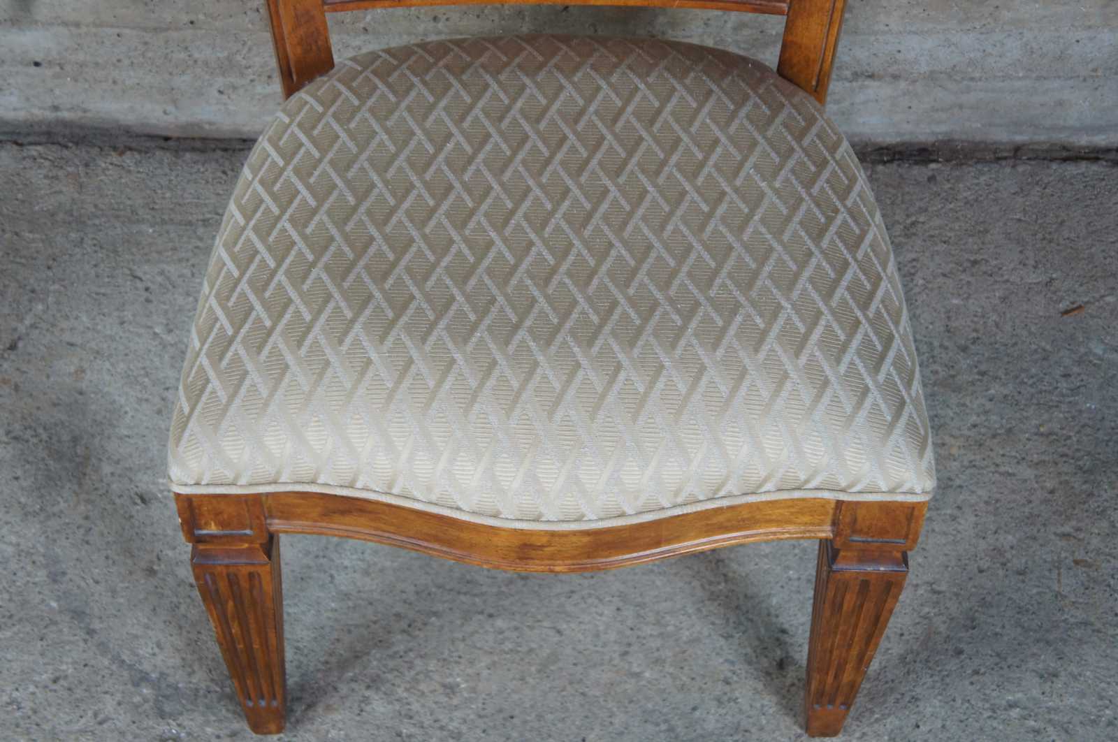 8 Century Furniture Mitsford dining chairs finished in Edinburgh (maple) finish, item #3821 / 52-531, circa 2001. Feature pierced back with round circular sprawling leaf design that resembles a sheath of wheat or acanthus style. An upholstered seat leads to tapered and fluted legs.