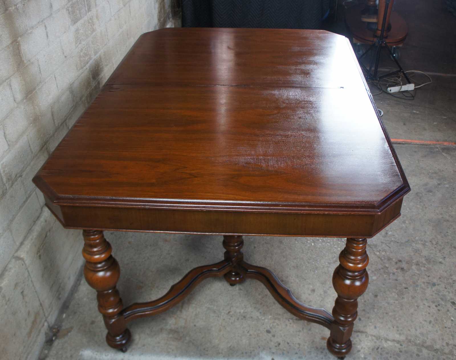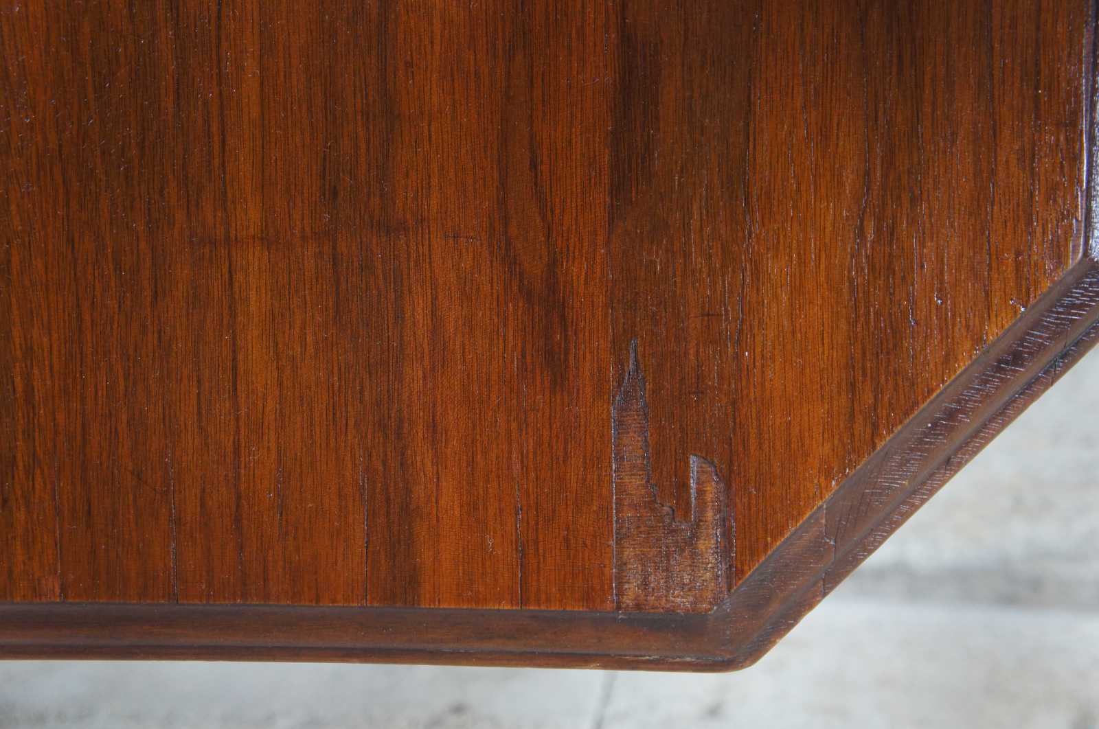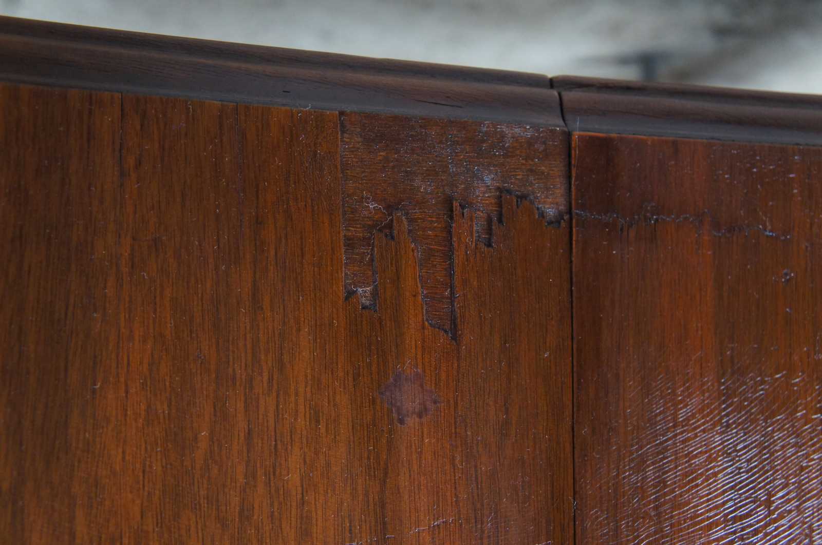 Some alligatoring to finish, veneer loss, veneer lifting to edges, distressing, see pictures.