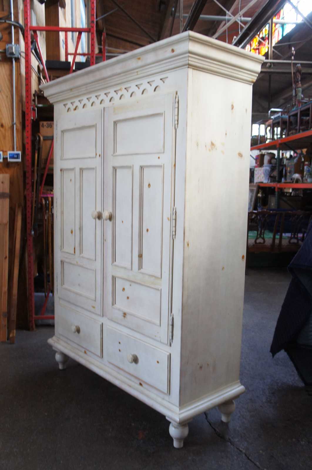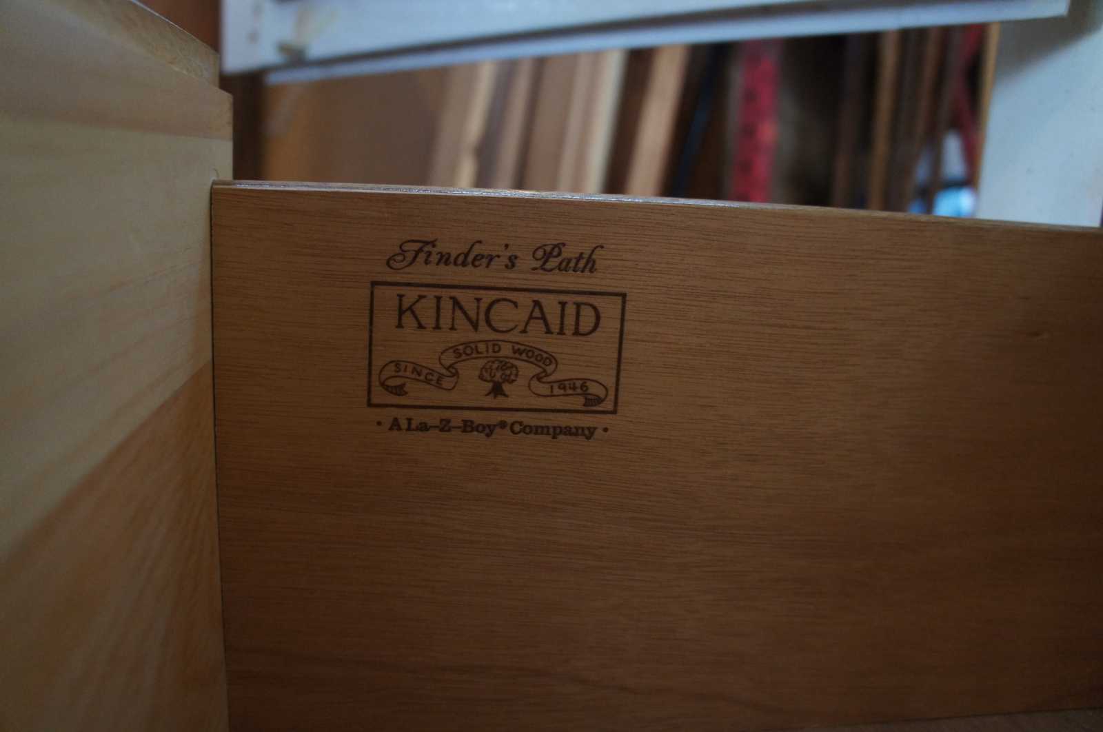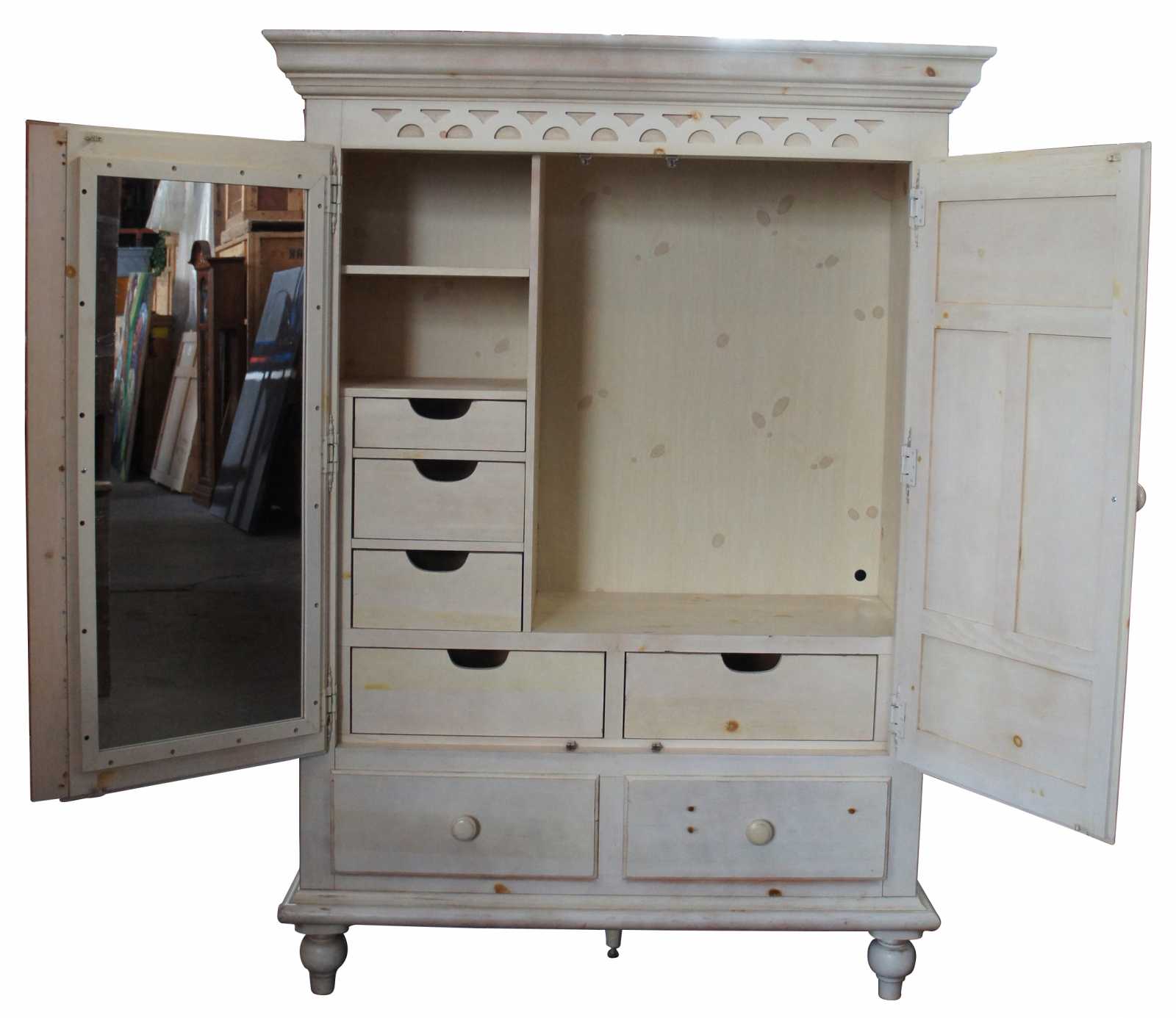 Circa 1995 Kincaid painted pine armoire or linen press. Features five interior drawers, mirror and two large lower shelves. Includes hanging bar.
