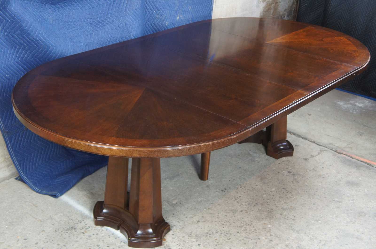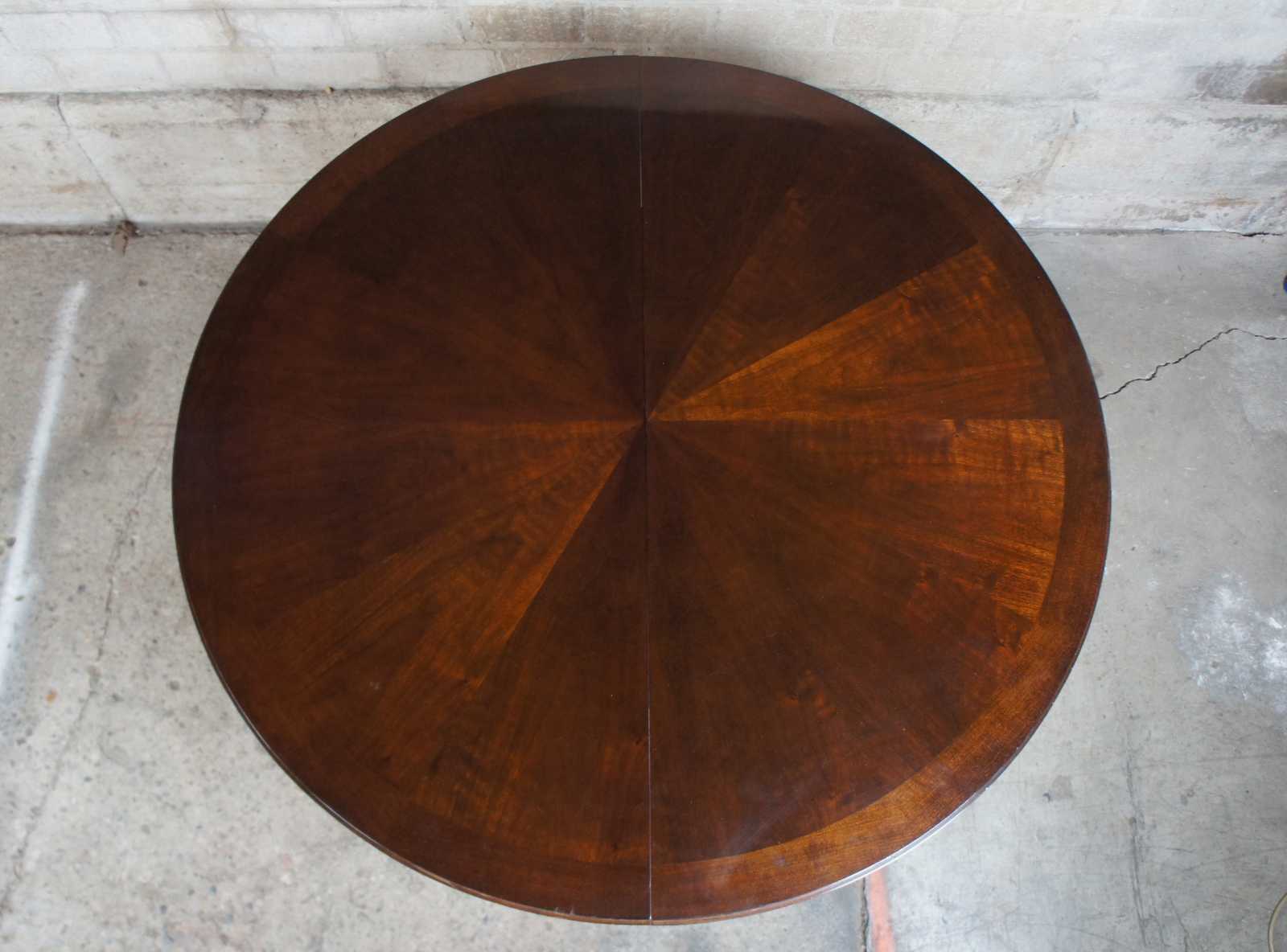An original design from Laura Kirar, the Noir reflects the restrained geometric character of Vienna Secession design-an evolution from Biedermeier to Art Deco. Baker Furniture Noir round extendable dining or breakfast table is made from American Walnut with a split pedestal base, two leaves, and pads. # 9137.