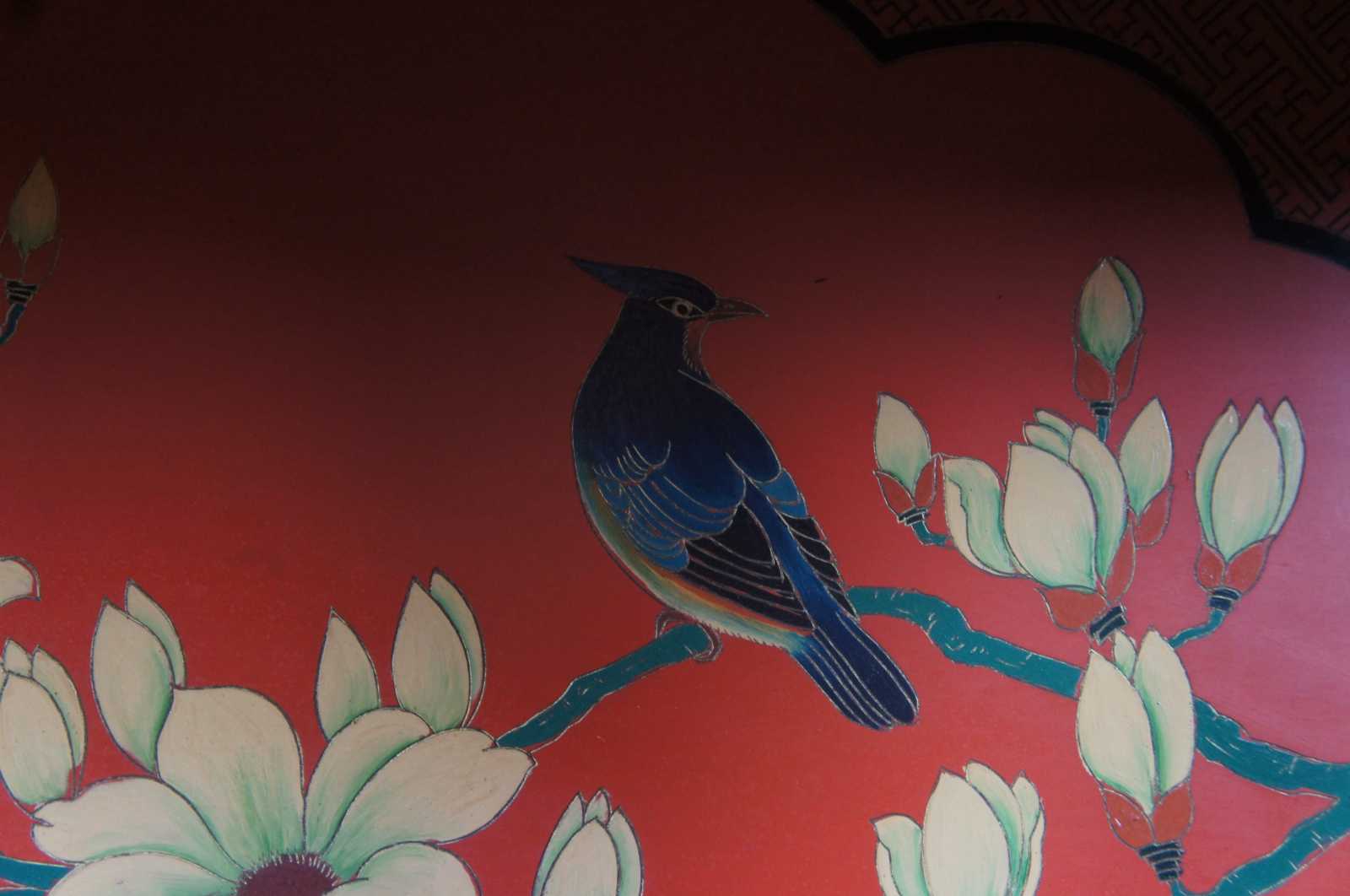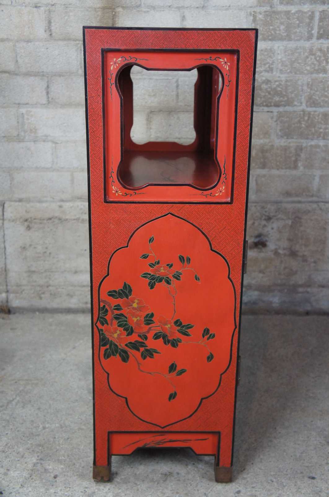 Late 20th century Chinese red lacquer entryway cabinet or stand. Features a beautiful oriental motif showing birds and various flowers. Features a unique open shelf over cabinet.