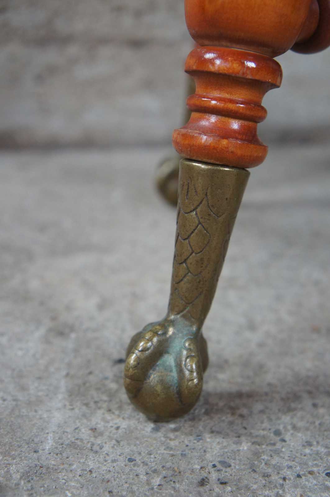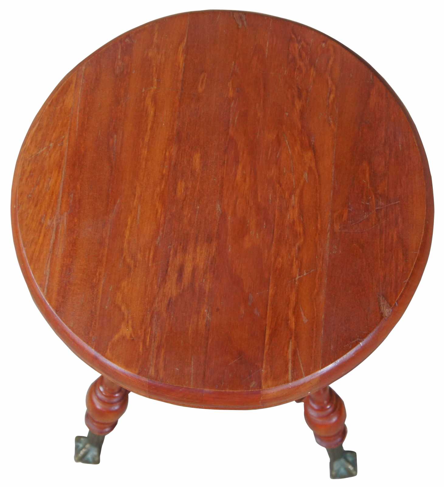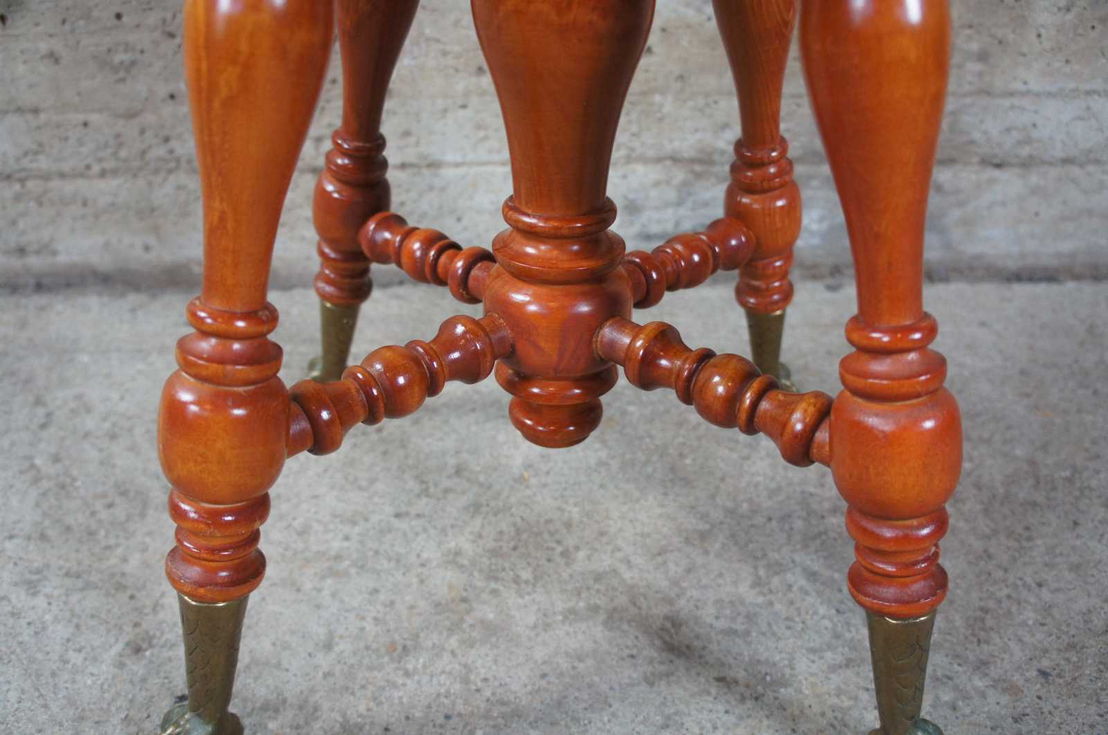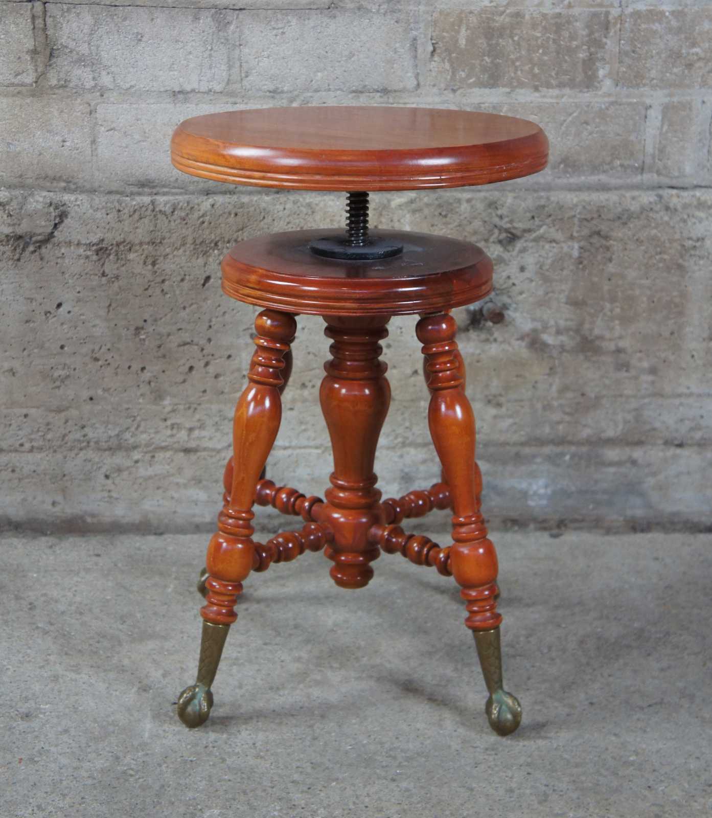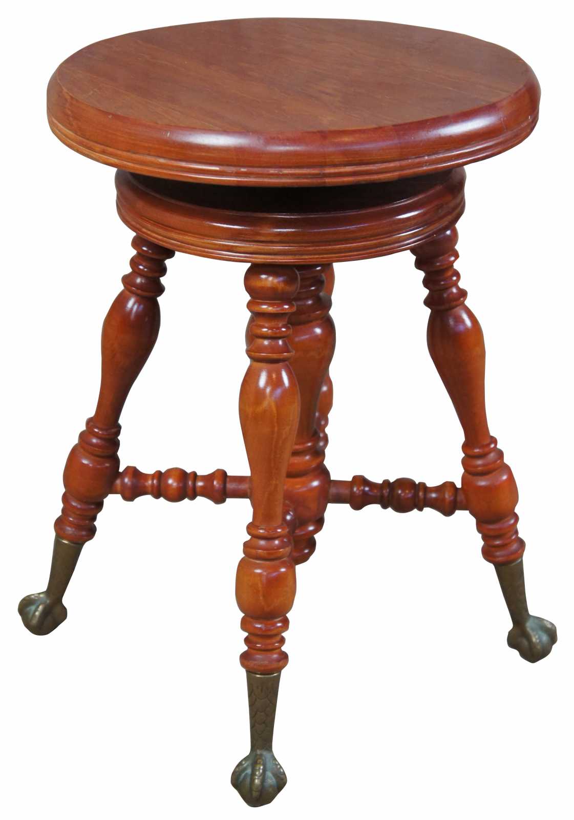 Early 20th century Victorian inspired cherry piano stool with brass ball and claw feet. Features round adjustable seat over spindled supports.