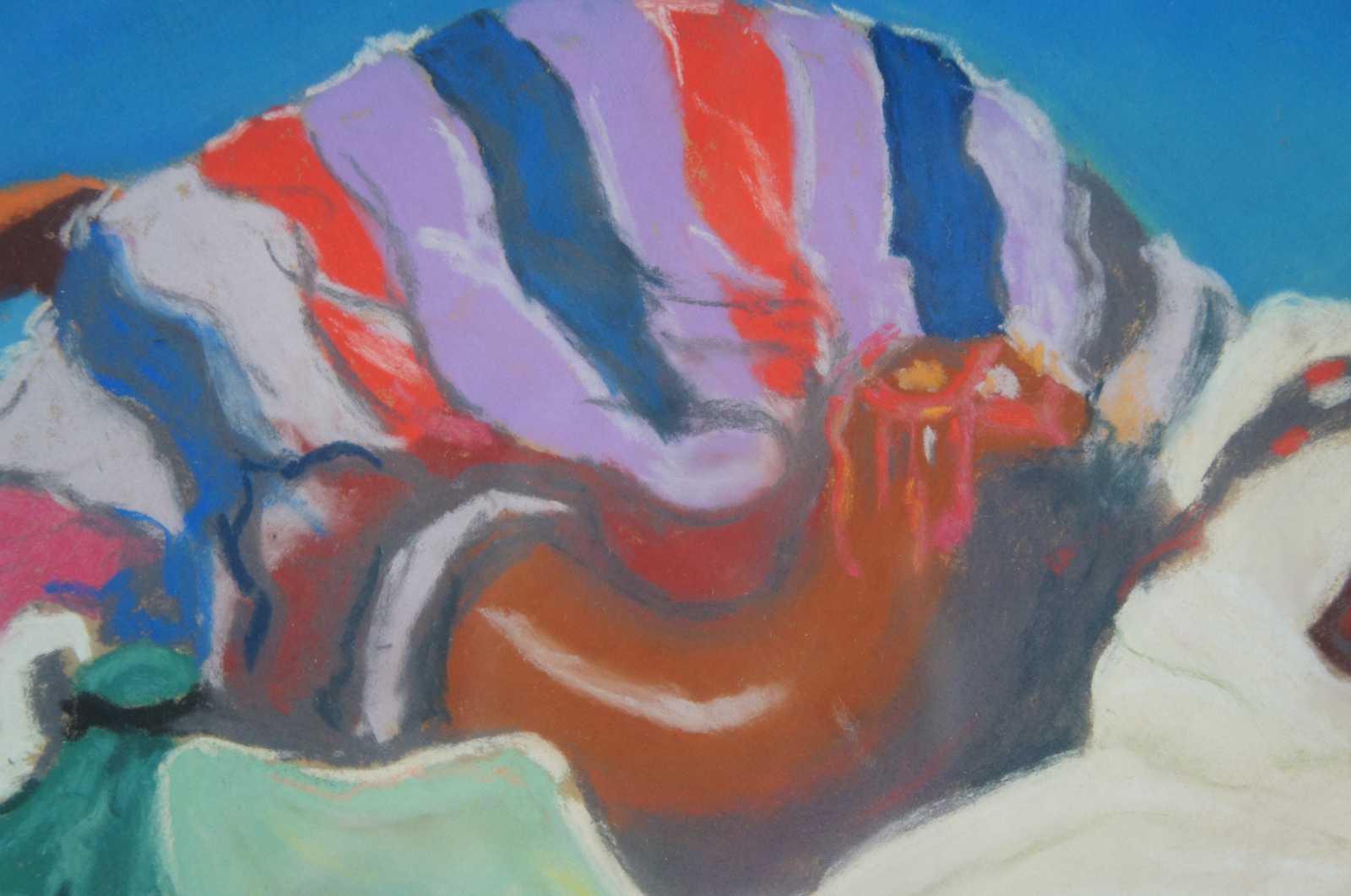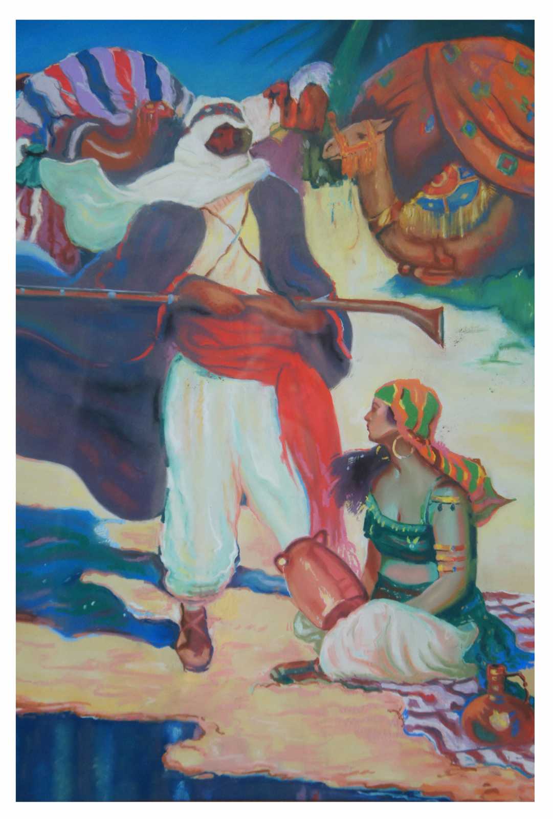Antique 1933 orientalist watercolor painting featuring a pair of ornately dressed Bedouins encamped at an oasis with brightly colored tents and camels, signed E. Kohl.