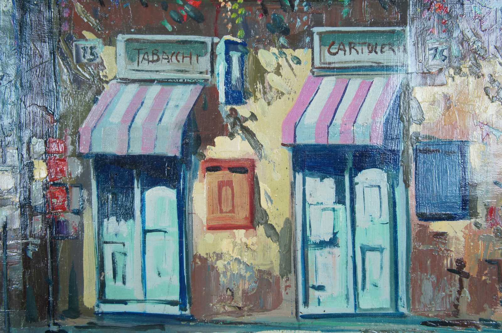 Featuring a tobacco and stationary shop below a flower covered balcony. Canvas signed Lower Left.