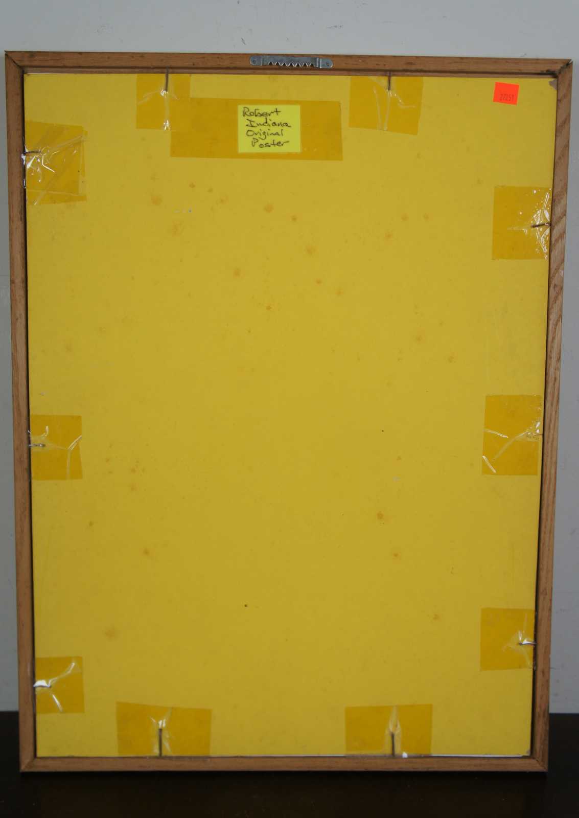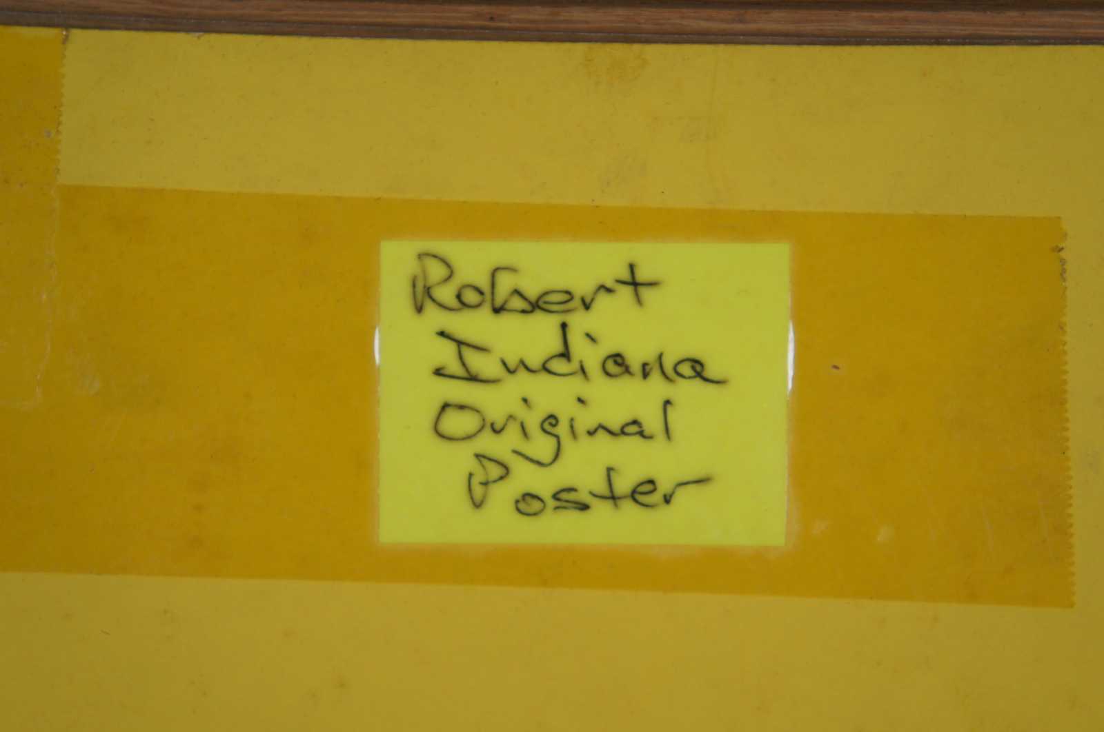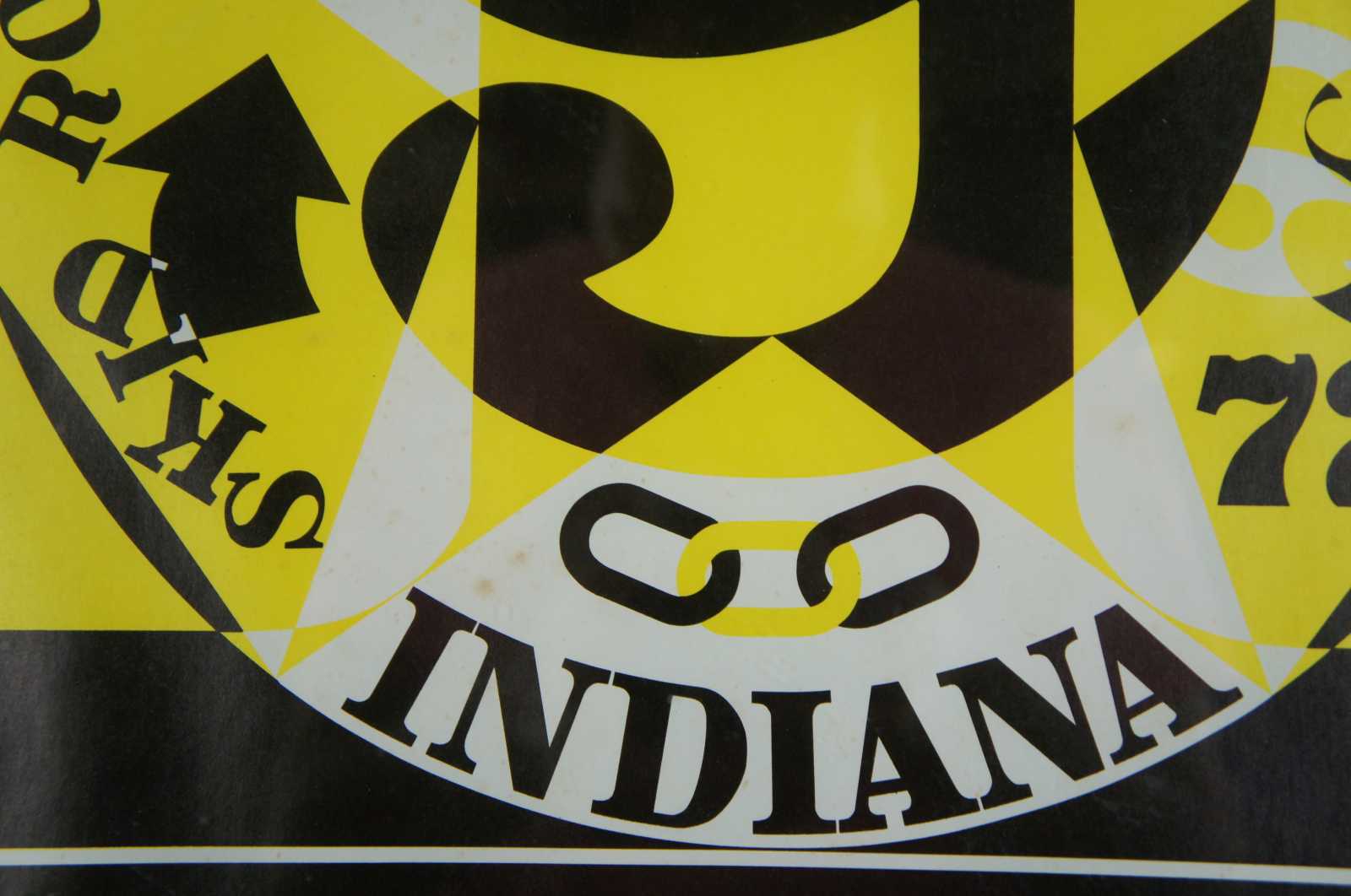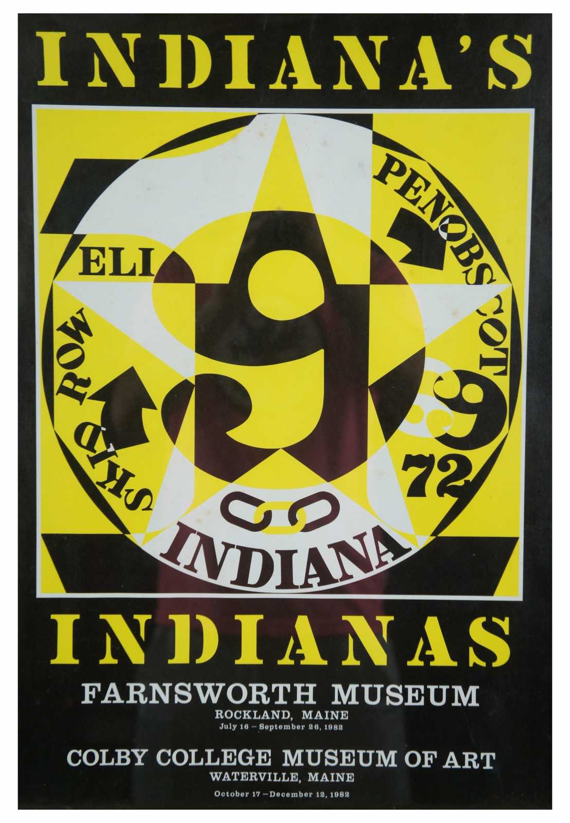 Original 1982, yellow and black Robert Indiana art exhibit poster “Indiana’s Indianas” featuring the Farnsworth Museum and the Colby College Museum of Art.