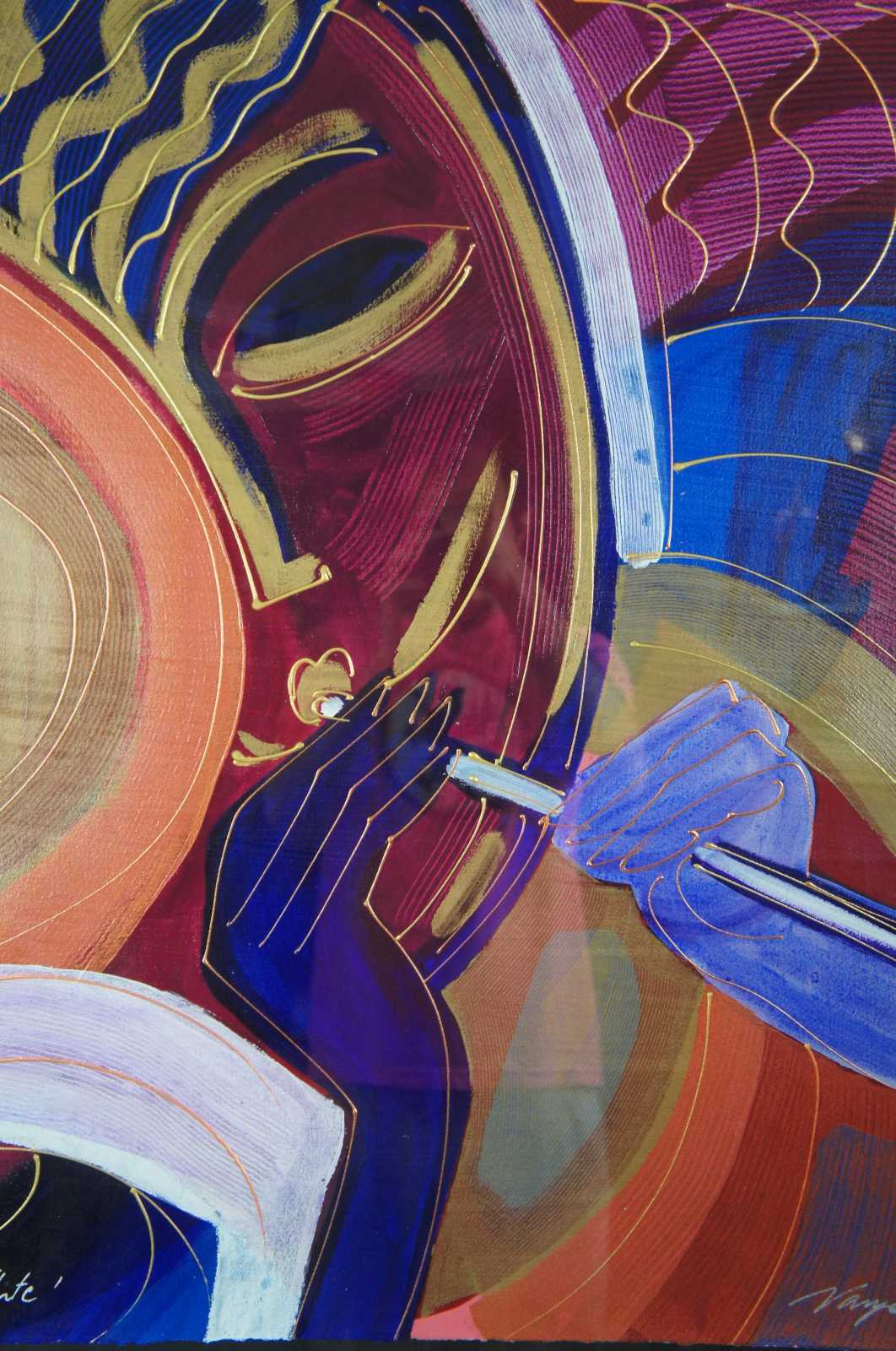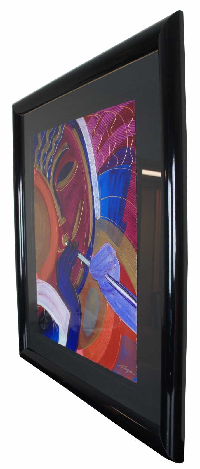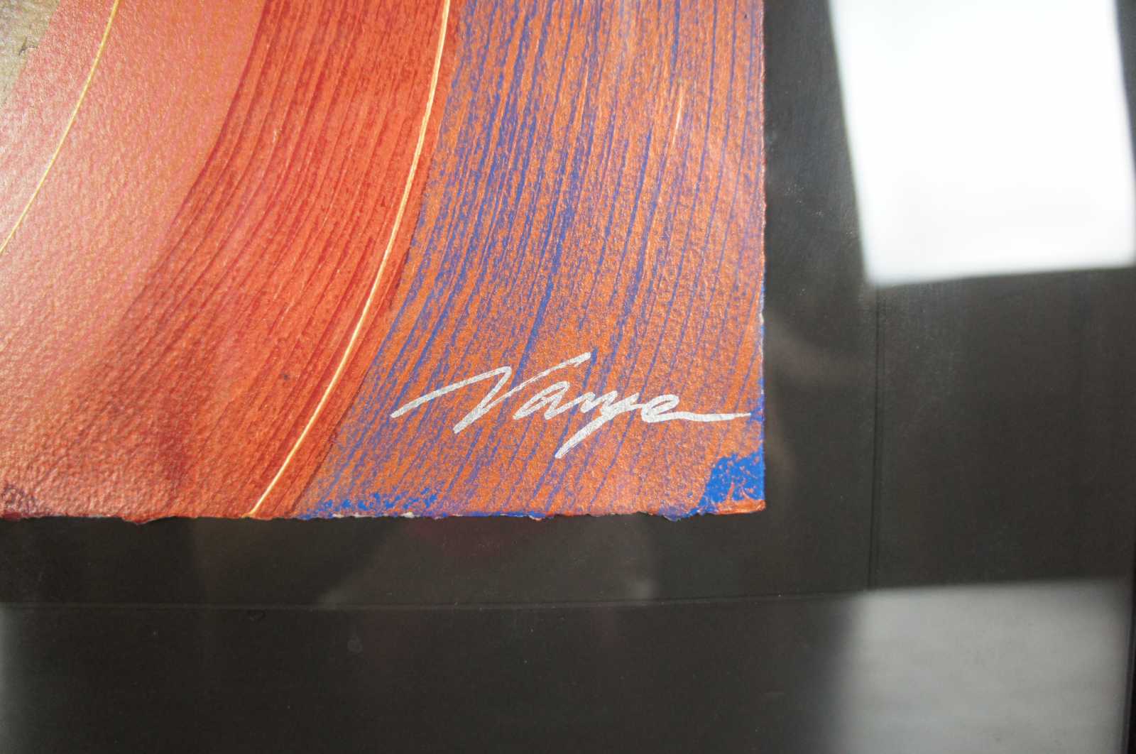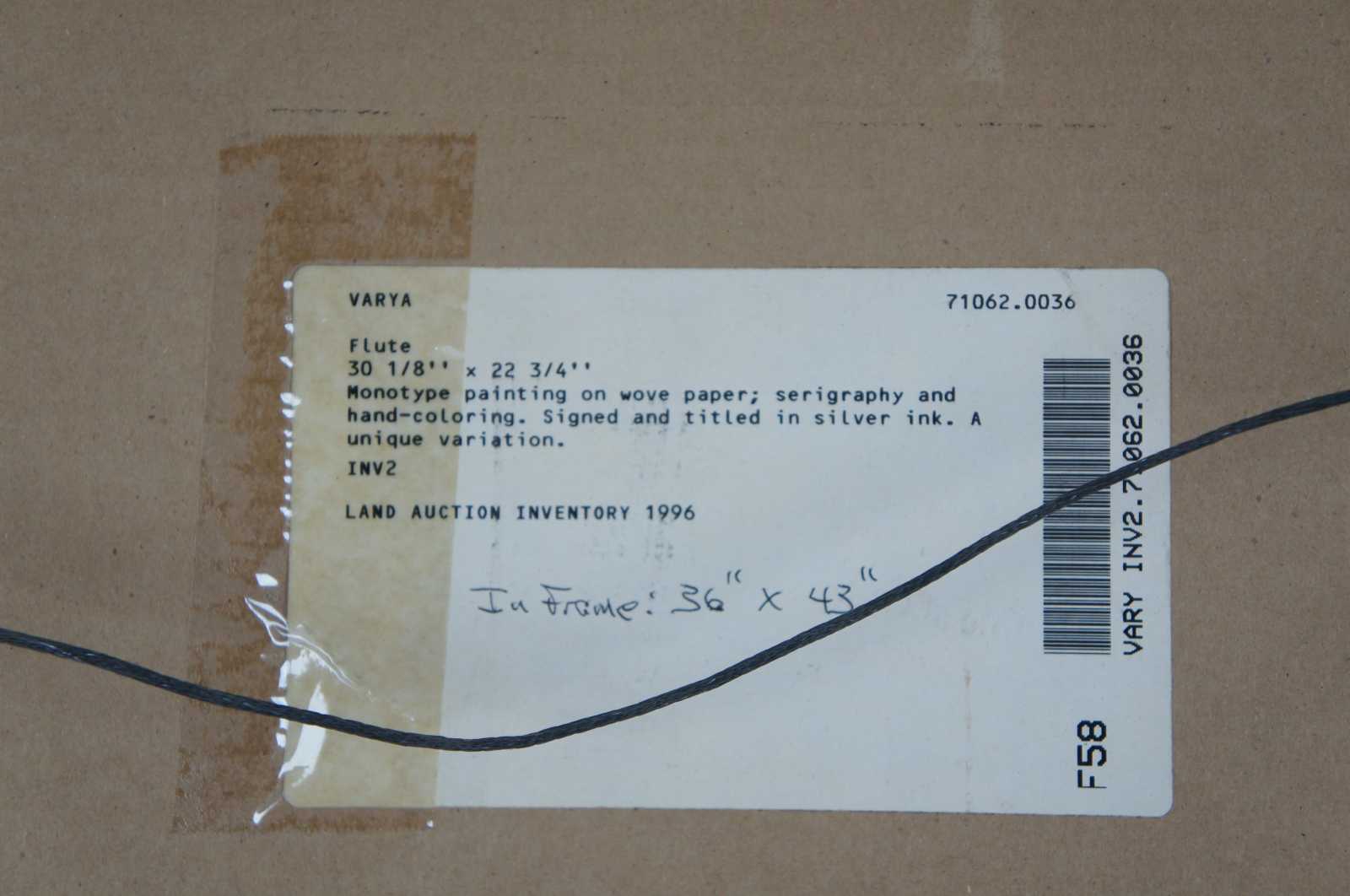 1990’s serigraph and hand coloring painting on paper titled “Flute” by Varvara (Varya) Shavrova. Varvara Shavrova (b. 1968) is a visual artist born in the USSR who lives and works in London and Dublin. Shavrova’s practice is focused on excavating the layers of her family’s history through the process of remembering, recalling, retracing and re-enacting stories. In engaging memory, nostalgia and reflection, Shavrova creates installations that make connections between historic and current narratives, between the archival and the present. Shavrova studied at the Moscow State University of Printing Arts, and received her Masters in Fine Arts from Goldsmiths, University of London. Shavrova’s recent project Inna’s Dream reinterprets the first Soviet amphibious aeroplane designed by her great uncle in 1930s, and includes tufted carpet objects and site-specific drawings installation at Patrick Heide Contemporary Art, London (2019). Mapping Fates, multi-media installation reflects on Shavrova’s family migration, and includes tapestries and sound, shown in Lenin’s apartment in St. Petersburg (2017). Shavrova’s project The Opera portrays the gender fluidity in traditional Peking opera. It received international acclaim and included photography, sound and video projections, and was shown at The Temple Beijing (2016), Momentum Berlin ( 2016), the Gallery of Photography Ireland (2014), the Venice Biennale of Architecture (2014) and at Espacio Cultural El Tanque in Santa Cruz de Tenerife (2011). Shavrova received Culture Ireland awards for her solo exhibitions in Beijing, Shanghai and Berlin, British Council award for individual artists, and Ballinglen Arts Foundation Fellowship awards. Shavrova curated international visual arts projects, including The Sea is Limit exhibition at York Art Gallery (2018) and at Virginia Commonwealth University Arts Qatar Gallery in Doha (2019), examining migration, borders and refugee crisis, Giving Voice exhibition of Mary Robinson’s presidential archive in Ballina library in County Mayo, and Map Games: Dynamics of Change, international art and architecture project, at Today Art Museum Beijing, Birmingham Museums and Art Gallery, CAOS Centre for Contemporary Arts, Terni, Italy (2008-2010). Shavrova’s works are included in the collections of the Office of Public Works, the Department of Foreign Affairs and Trade, the Momentum Collection Berlin, the Ballinglen Museum of Contemporary Art, Minsheng Art Museum Beijing, Moscow Museum of Modern Art, and the Museum of the History of St. Petersburg.