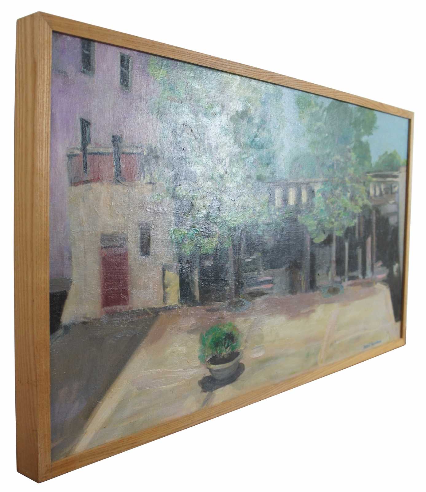 Impressionist oil on canvas painting of a city square by Harriet Rosenbaum. Harriet Rosenbaum has been an active participant in the art community of Washington, DC and the surrounding area for more than 30 years. She studied Fine Art at the Corcoran School of Art, American University, and George Washington University in Washington. A painter and printmaker, she is particularly known for images of the landscape. She currently resides in Chevy Chase, Maryland, and shows her work at the Touchstone Gallery in Washington, D.C.