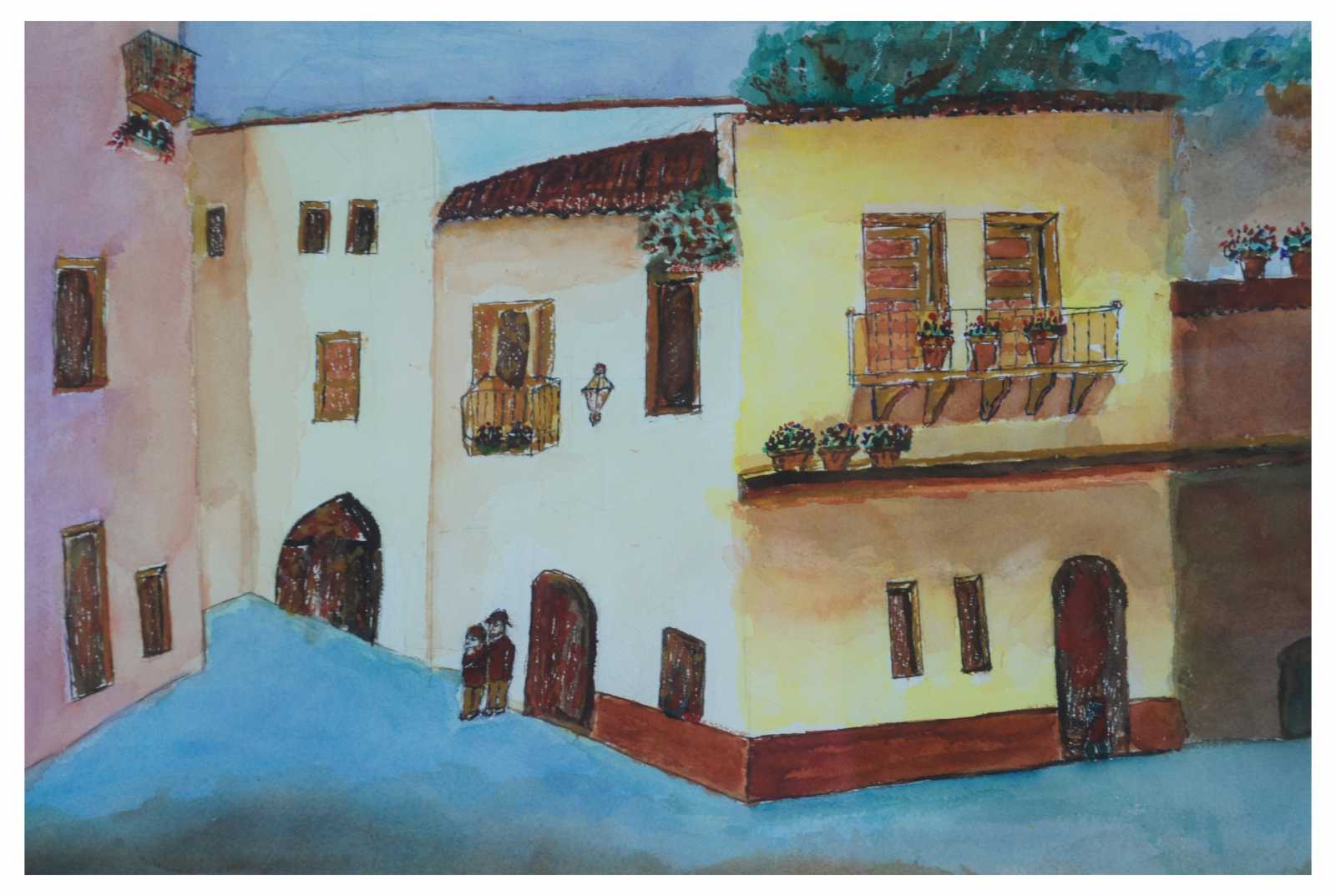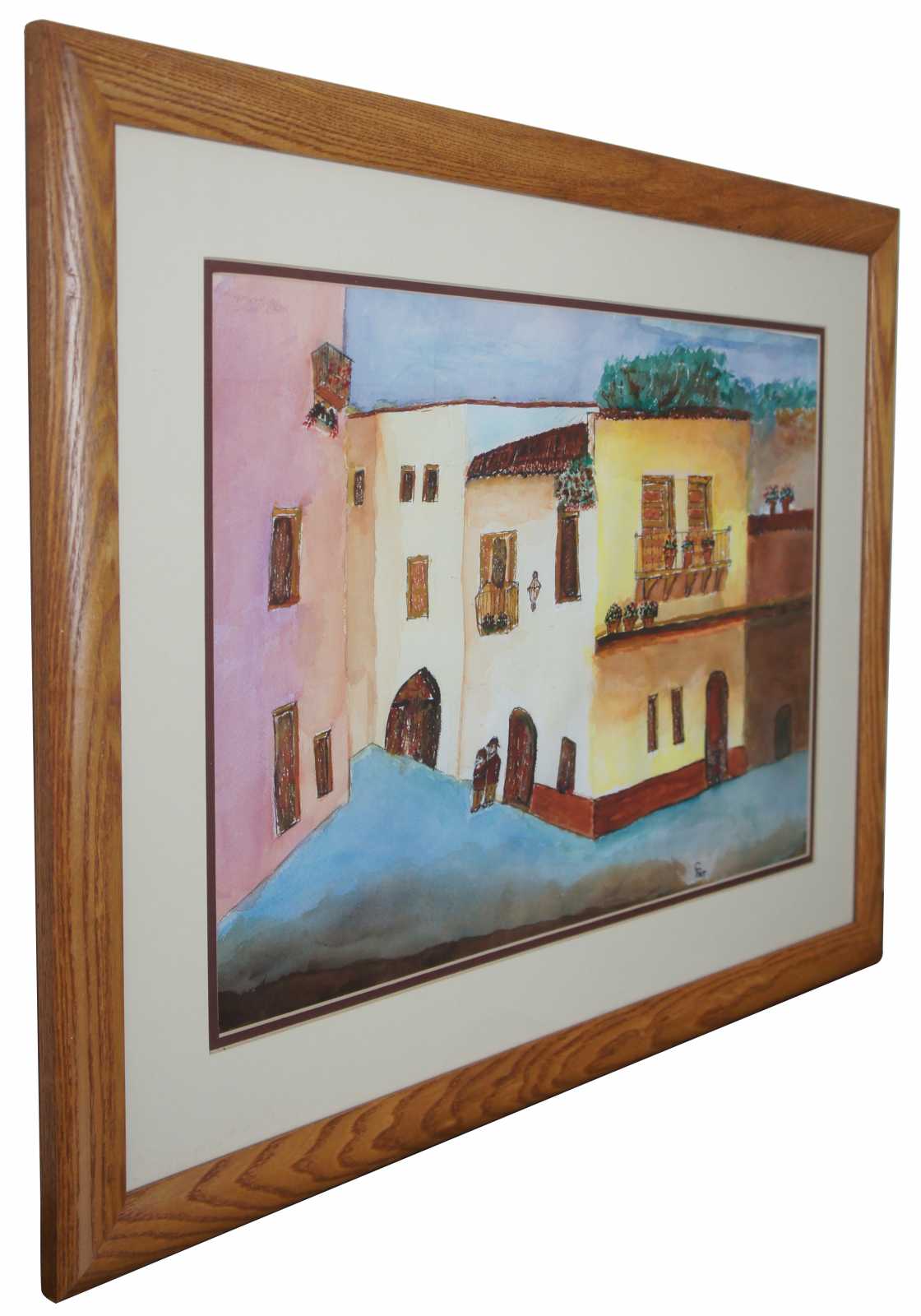 Original watercolor painting featuring a Mediterranean style city street of buildings with red tile roofs and pots of flowers with two figures by a door; signed Cpat at the lower edge. Oak frame.